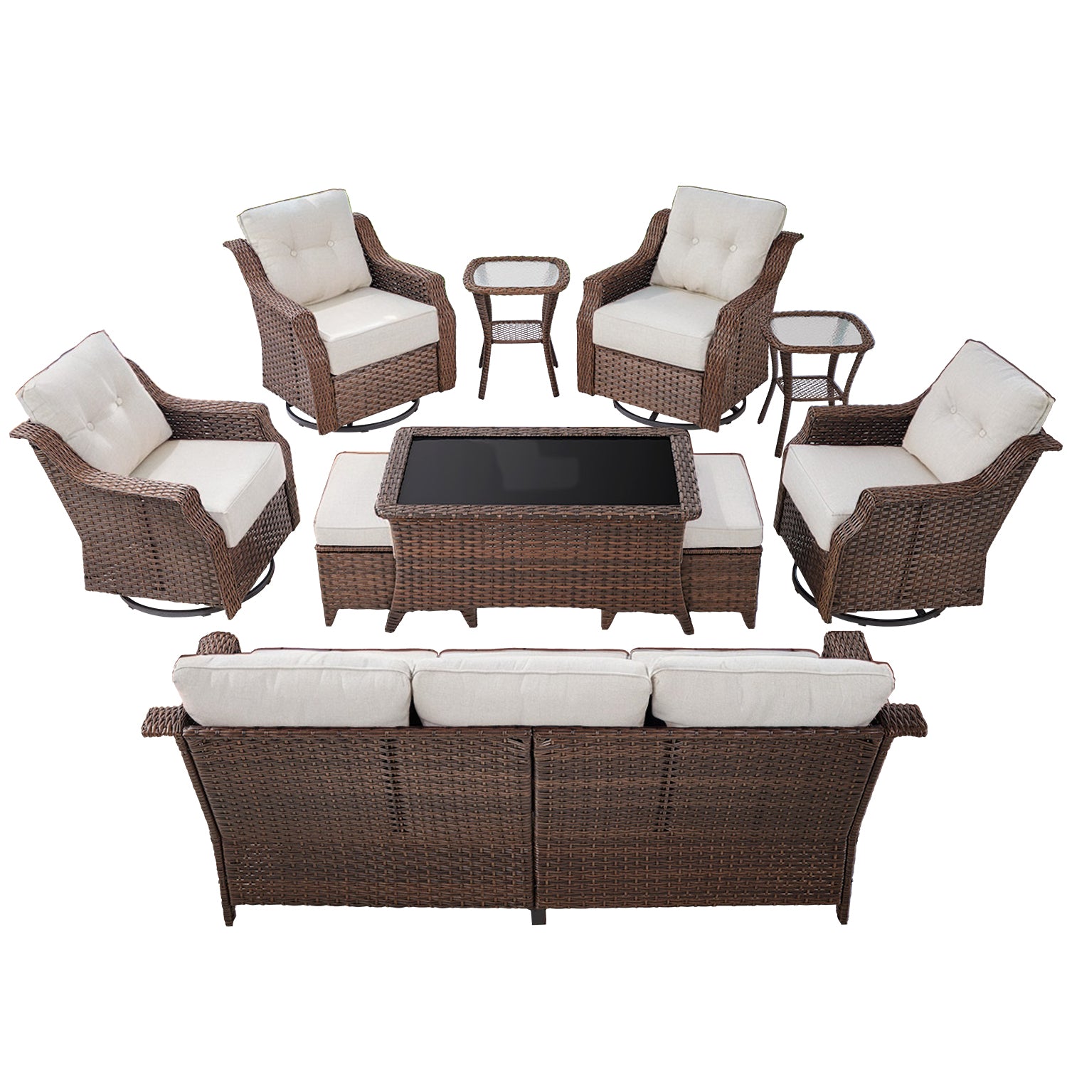 10-Piece Luxury Outdoor Conversation Set - 4 High Back Swivel Rocker Chairs + 3-Seater Sofa with Wicker Ottoman & Coffee Table, Ovolo Series