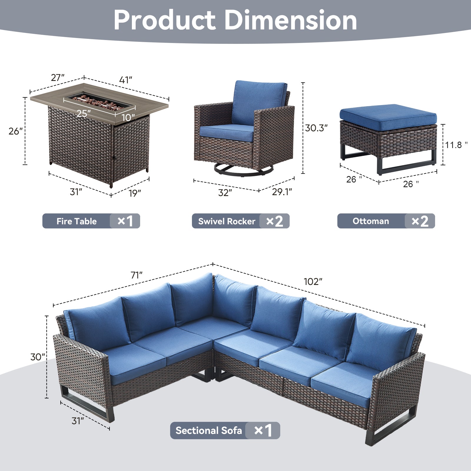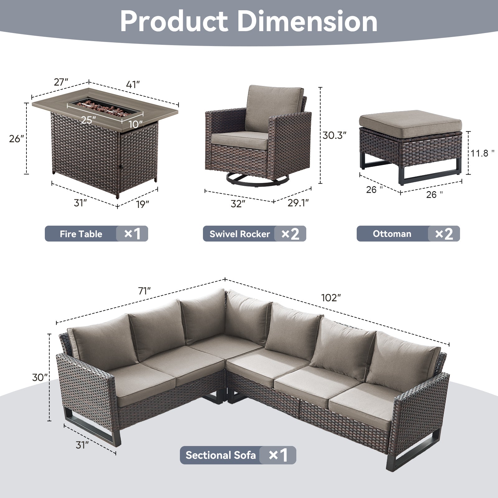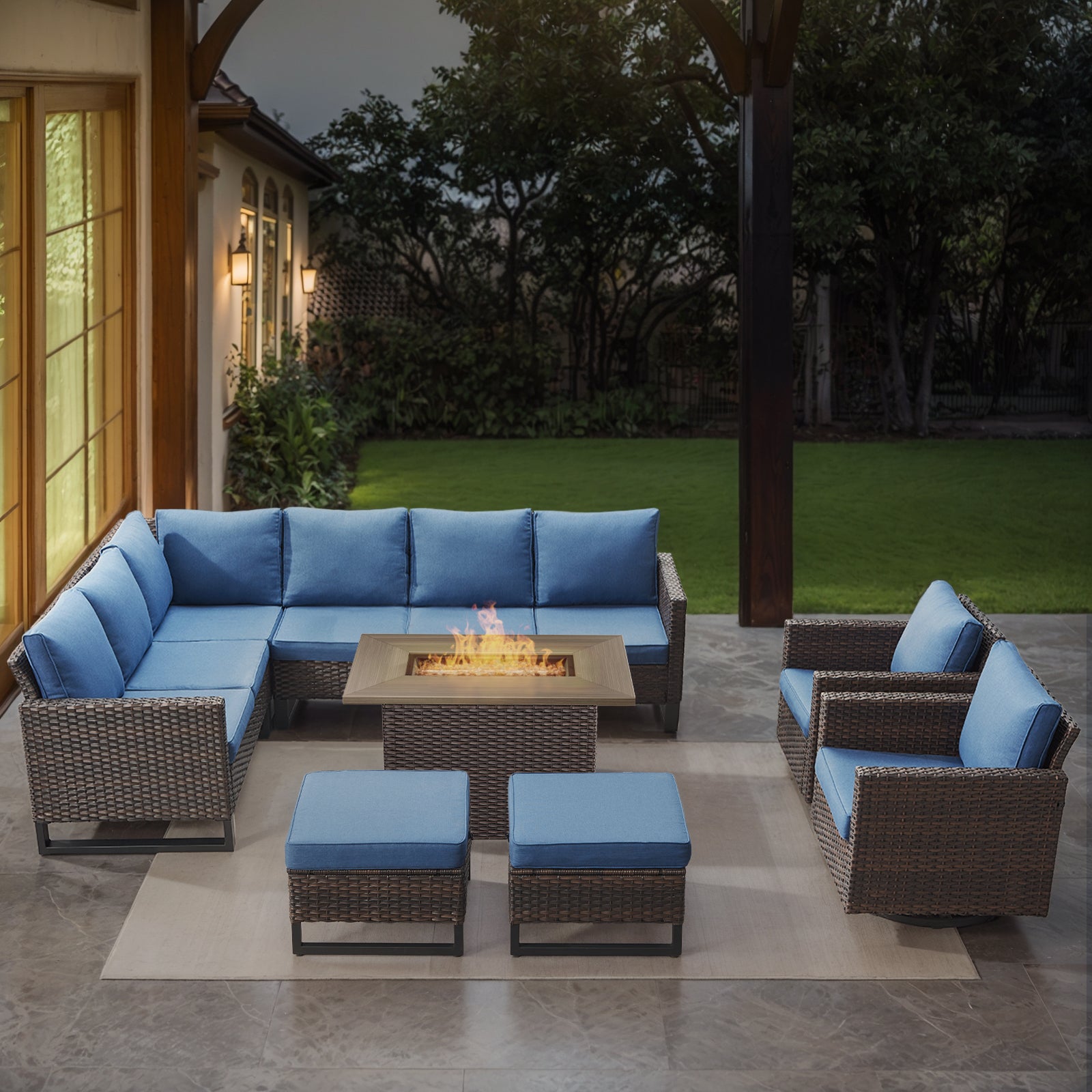 Elevate your outdoor living space with this stylish 11-piece patio conversation set, thoughtfully designed for comfort, durability, and modern appeal. Featuring a spacious corner sofa, two smooth swivel chairs, two versatile ottomans, and a 41" propane fire pit table with 55,000 BTU heat output, this set creates an inviting space for relaxing, entertaining, and cozy gatherings with family and friends. Crafted with weather-resistant PE wicker and a sturdy steel frame, the fire pit table easily converts into a coffee table with the included lid, making it a functional centerpiece for your patio, porch, or backyard.