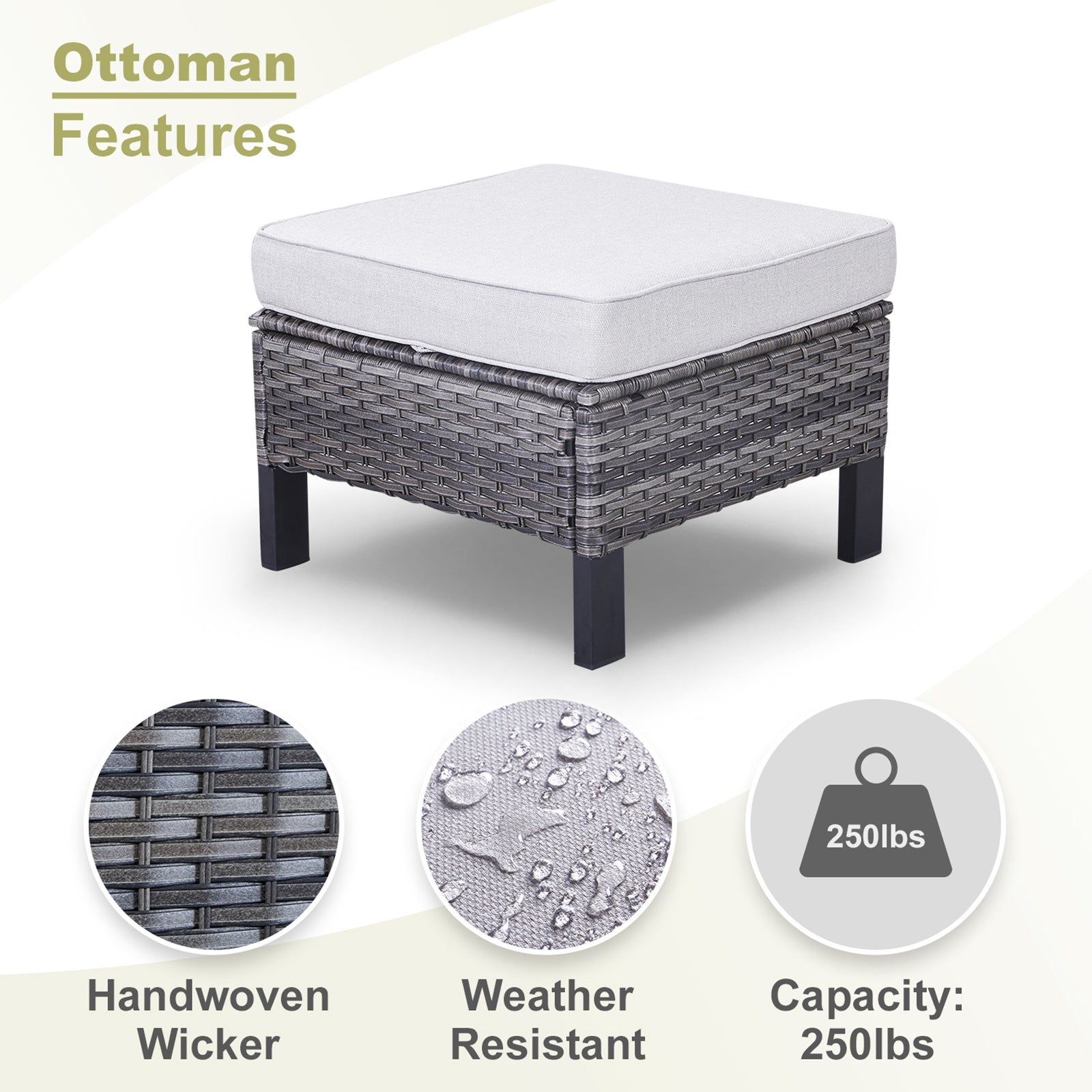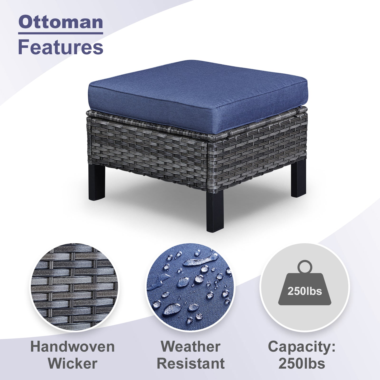 Versatile Ottomans: Two ottomans can be used as footrests, extra seating, or casual side tables to adapt to different outdoor needs.