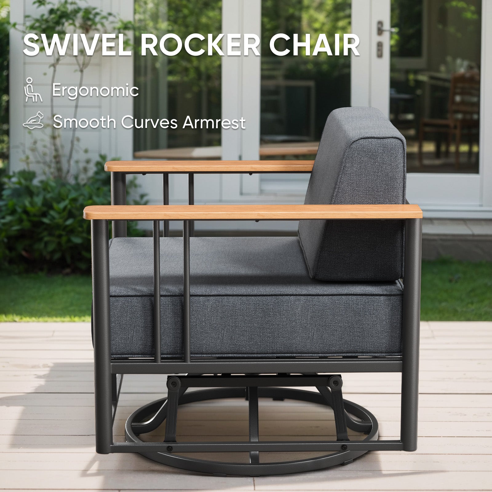 Unwind in complete comfort with our swivel rocker patio chairs, designed to bring effortless motion and plush support to your outdoor living space. Featuring a 360° swivel and gentle rocking mechanism, these chairs offer a smooth, soothing experience for any time of day. Each chair is oversized for generous seating, filled with 6" thick high-resilience foam, and wrapped in soft, breathable Olefin fabric. With a reinforced alloy steel frame built to withstand extreme weather, these chairs deliver both durability and relaxation season after season.