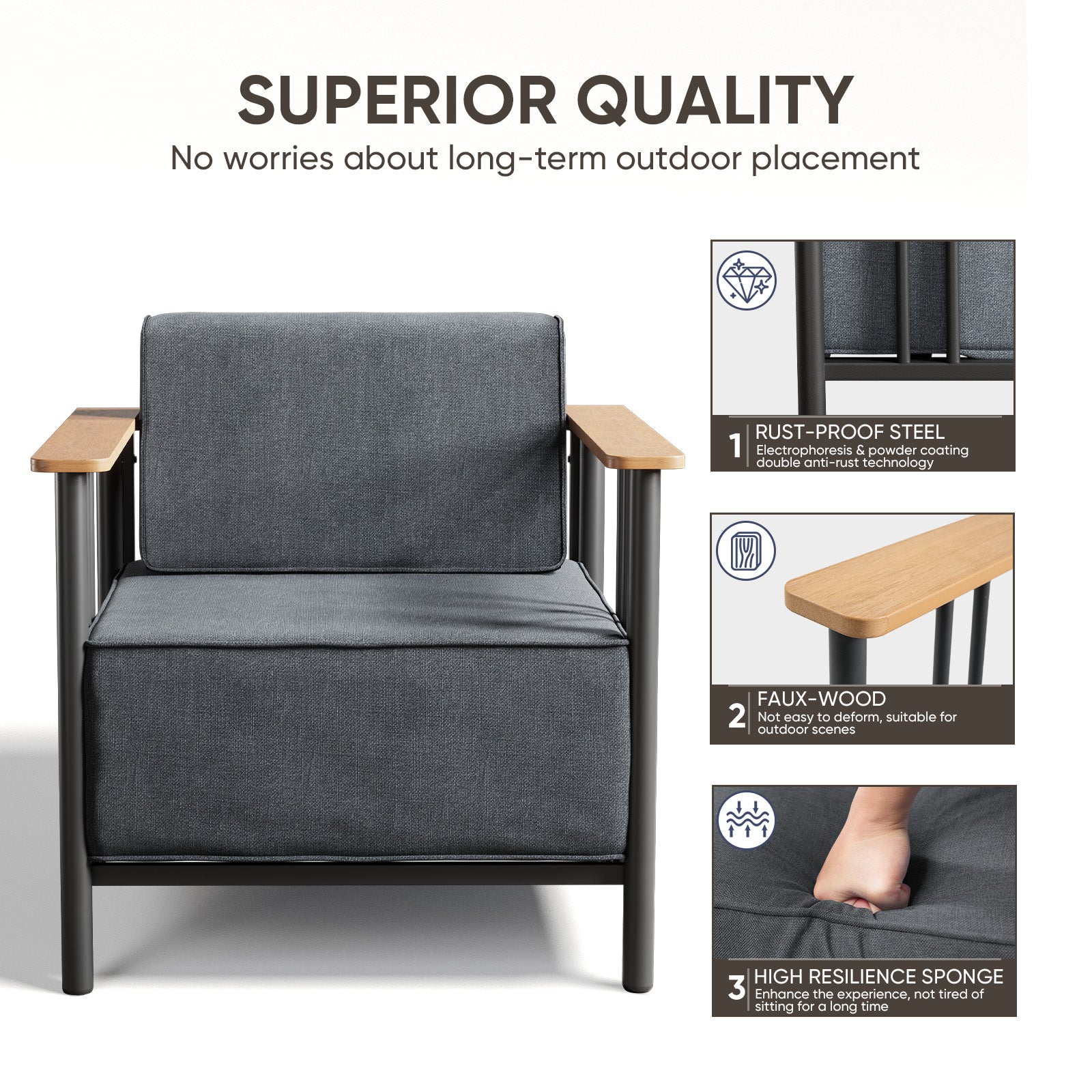 Experience cloud-like comfort with our oversized patio chairs, thoughtfully designed for outdoor lounging. Featuring 10" extra-thick, high-resilience foam cushions wrapped in breathable, water-repellent Olefin fabric, these chairs provide a cozy, cotton-like touch that's ideal for all-day relaxation. The spacious design accommodates larger body types comfortably, while the double-reinforced alloy steel frame ensures long-lasting durability in any climate.