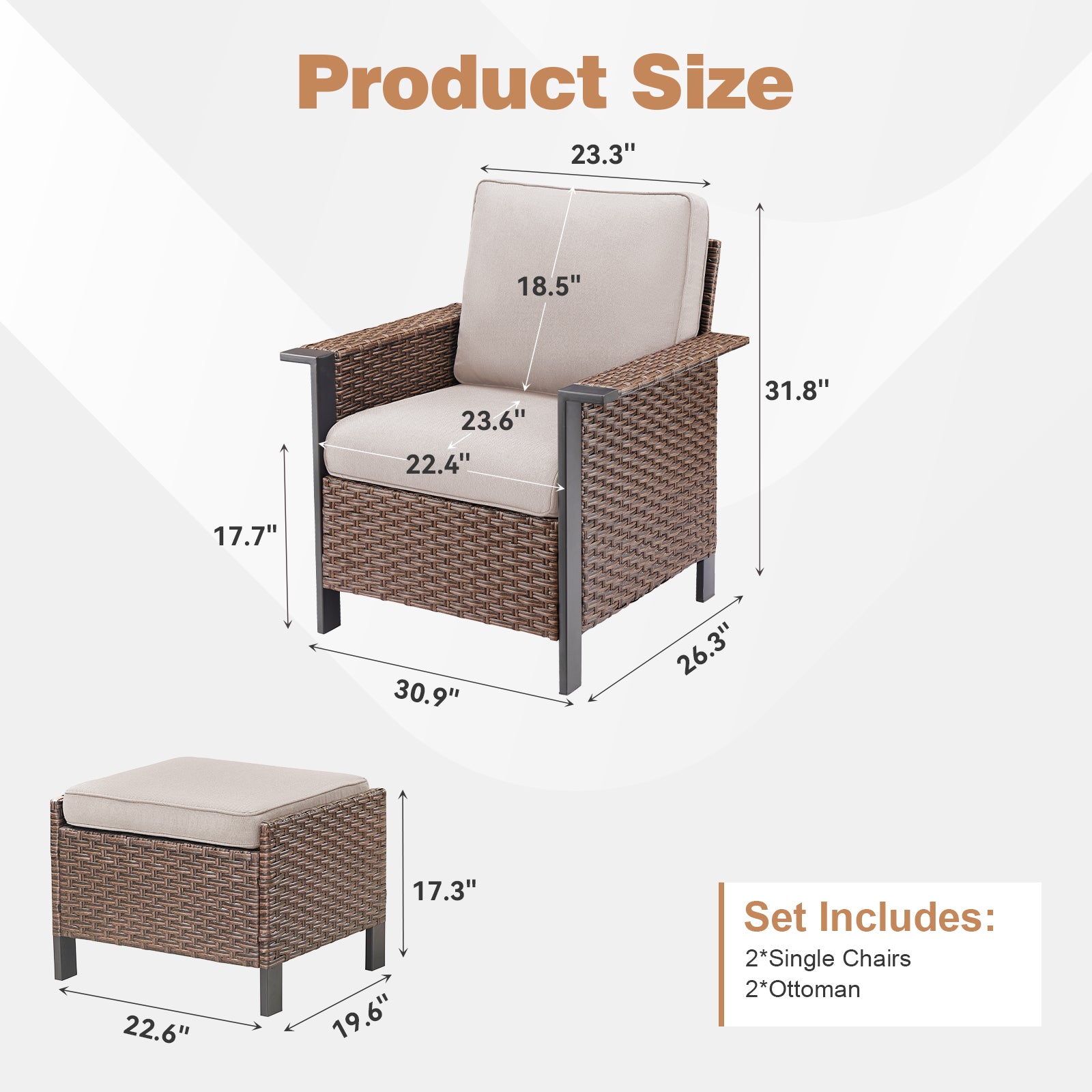 Ottoman: 17.3"H x 22.6"W x 19.6"D