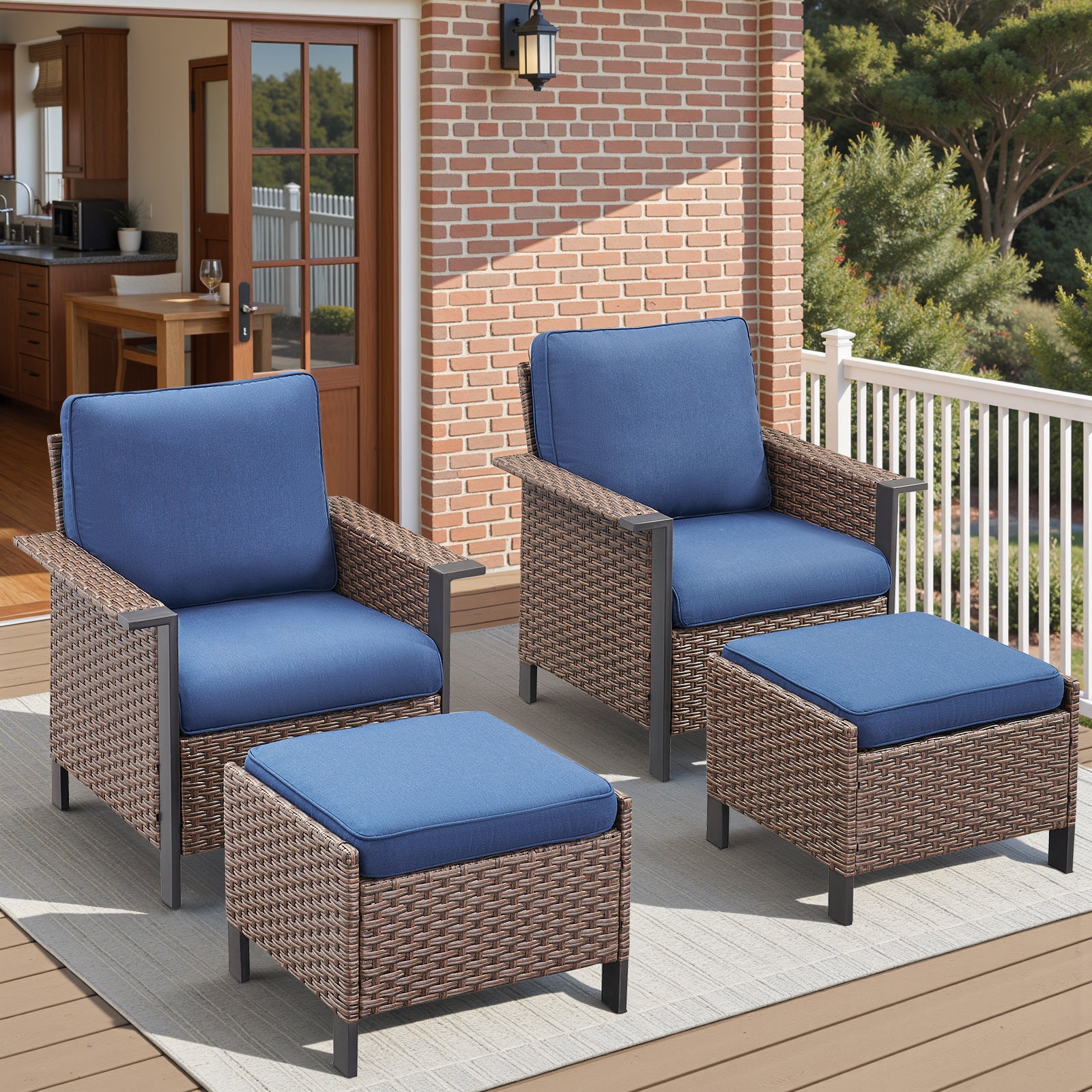 Create a cozy outdoor retreat with this elegant 4-piece patio set featuring two wicker patio chairs and two versatile ottomans. Designed for exceptional comfort and long-lasting durability, each piece is crafted with all-weather PE wicker and a rust-resistant steel frame, blending timeless style with reliable performance. The deep-seating design, ergonomic armrests, and UV-resistant cushions offer maximum relaxation on your porch, deck, balcony, or garden. The ottomans provide added flexibility—use them as footrests, extra seating, or pair them with trays to serve as side tables—making this set a perfect upgrade for both hosting guests and enjoying quiet outdoor moments.