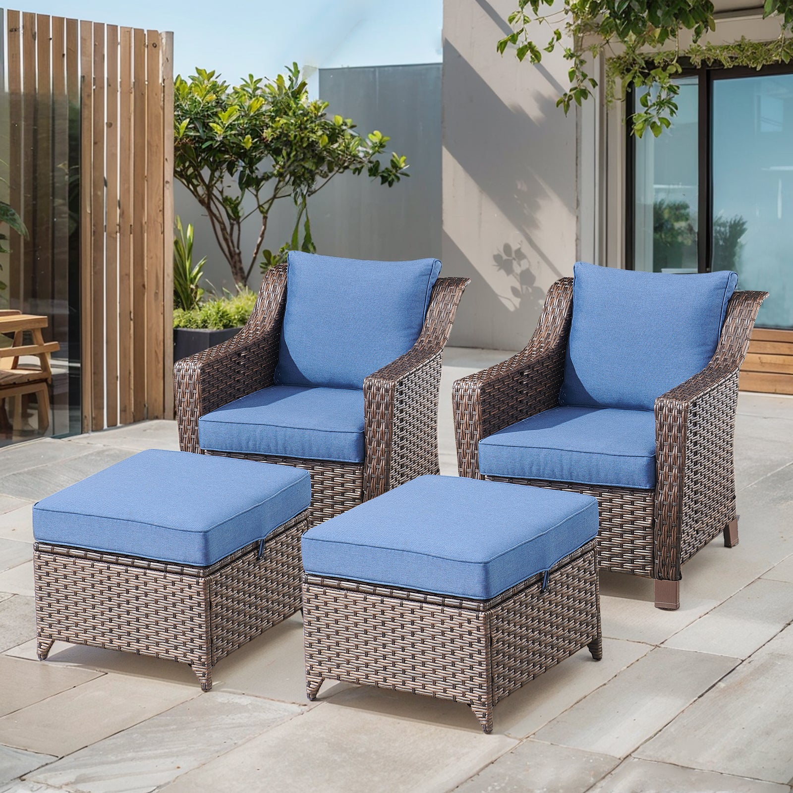 This patio lounge set pairs two single chairs with matching ottomans for added comfort and flexibility. The ottomans can be used as footrests or extra seating, adapting easily to different outdoor moments.