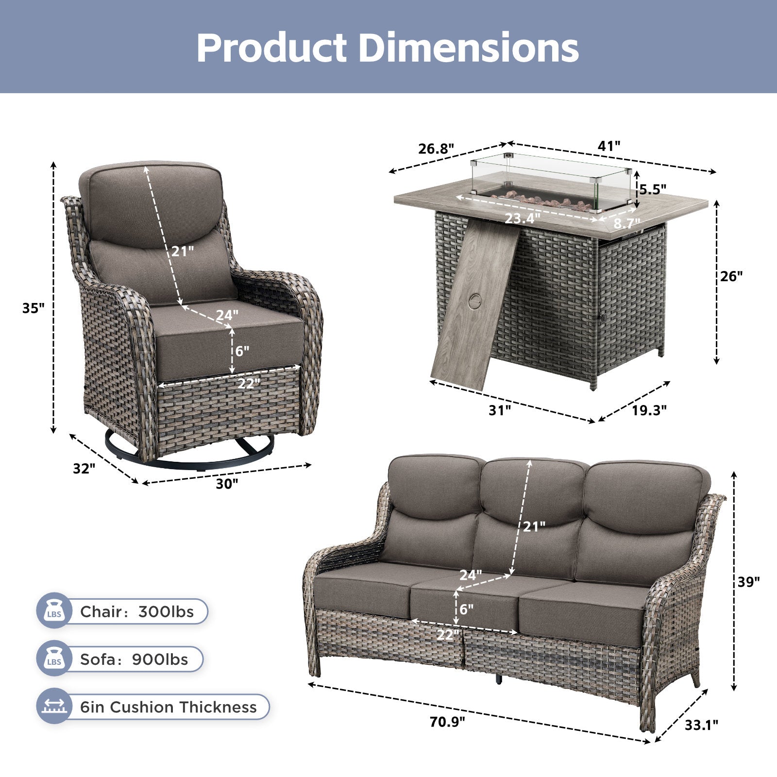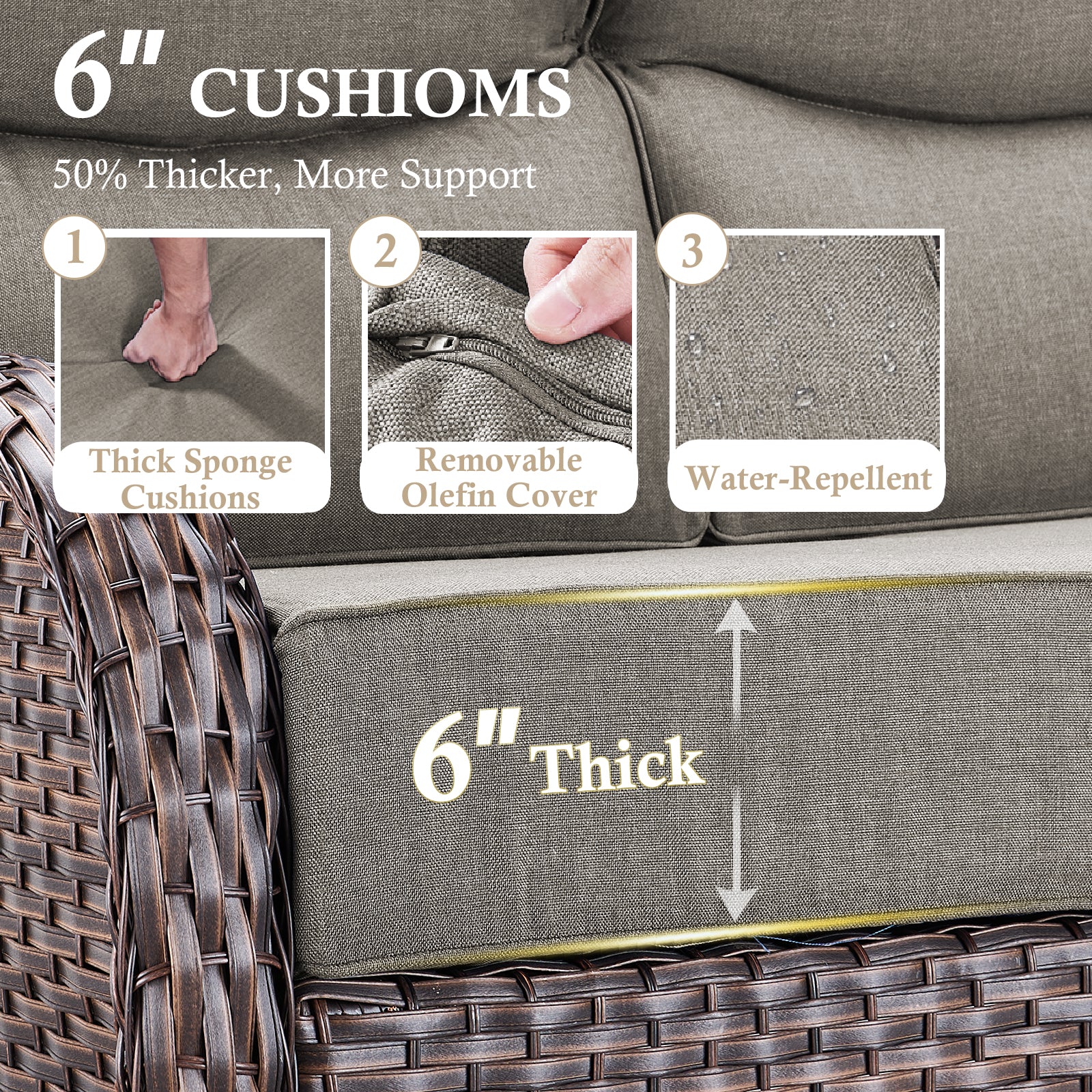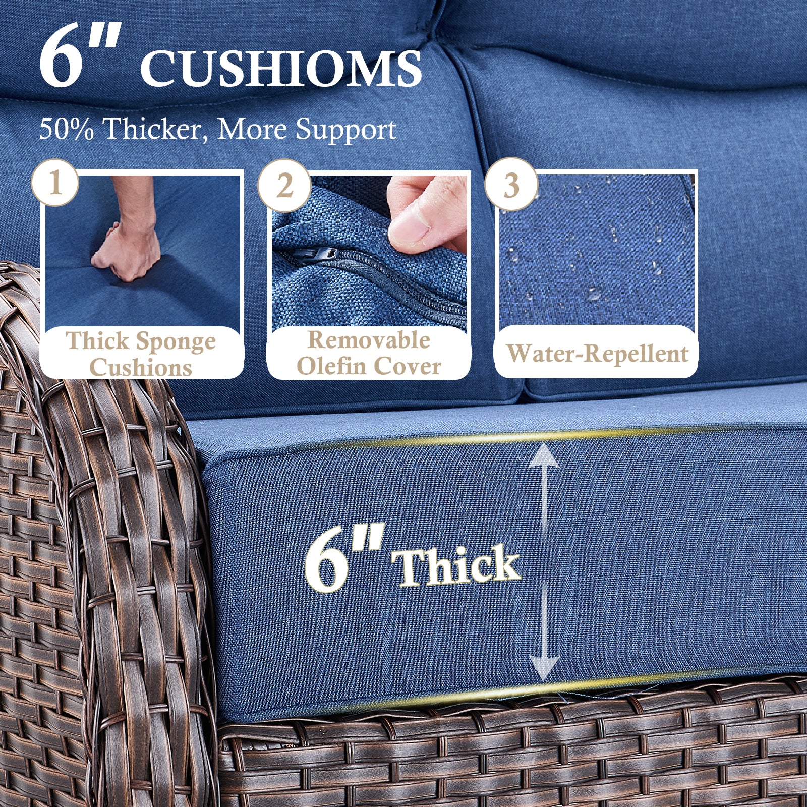 - 6" thick cushions with supportive high backs