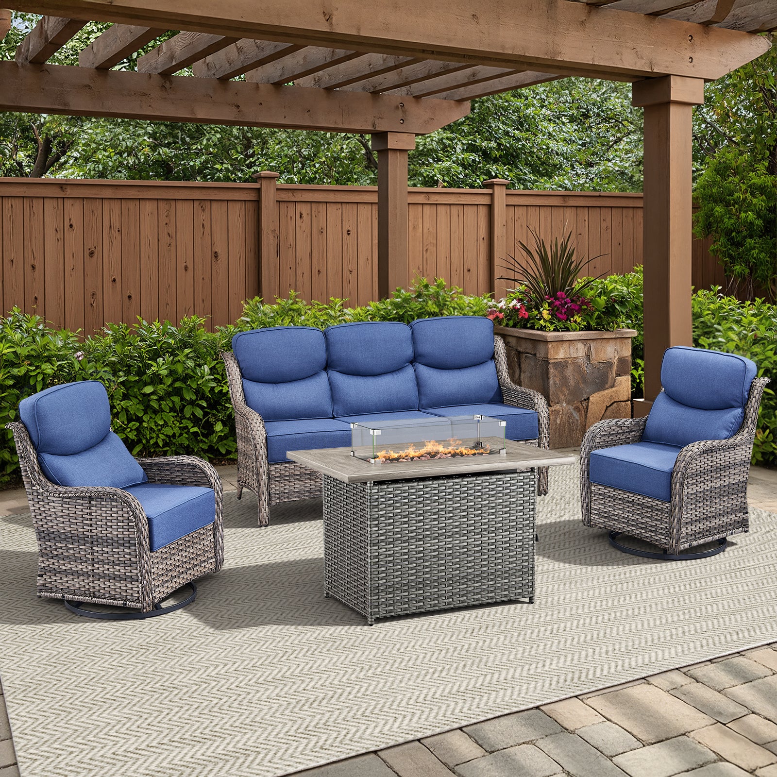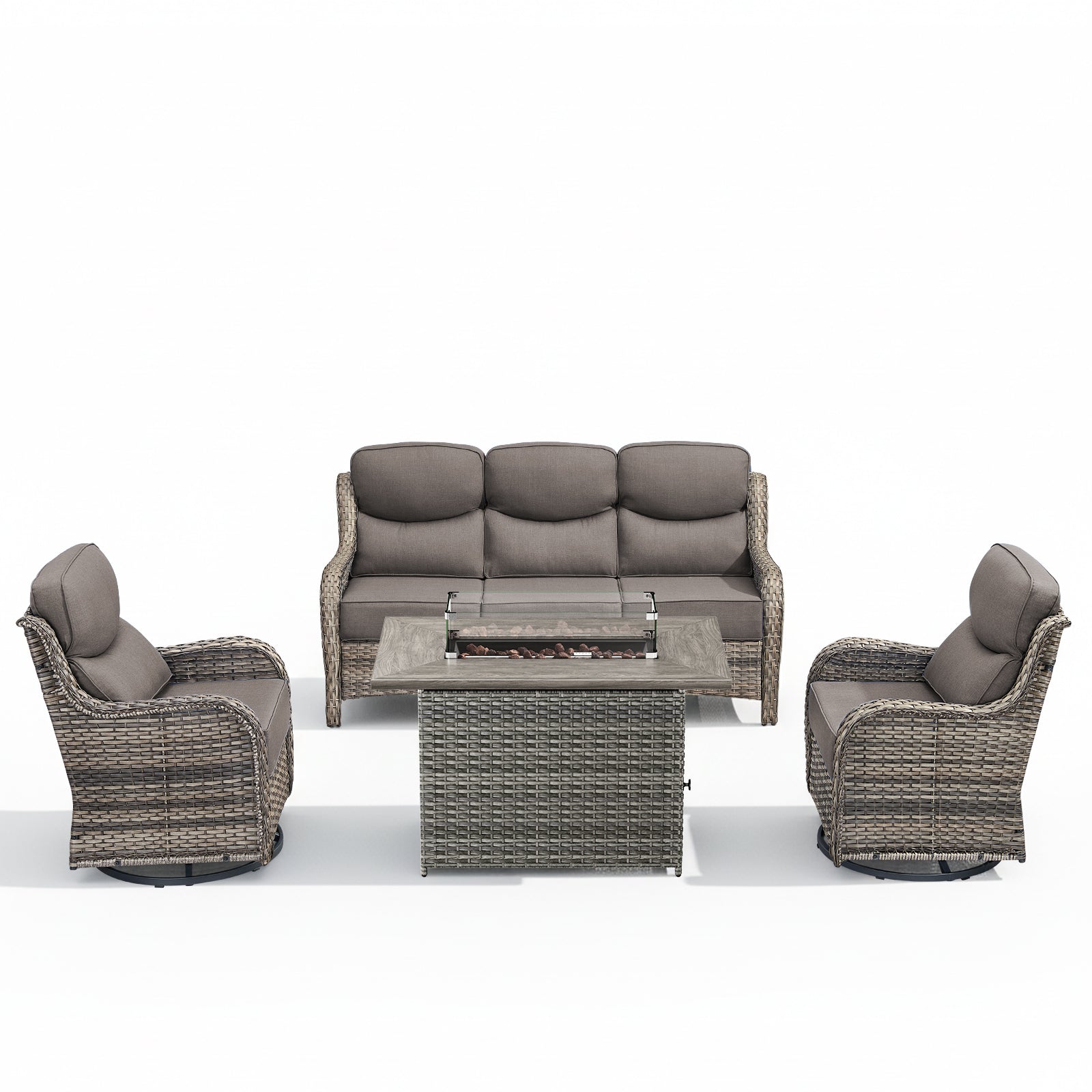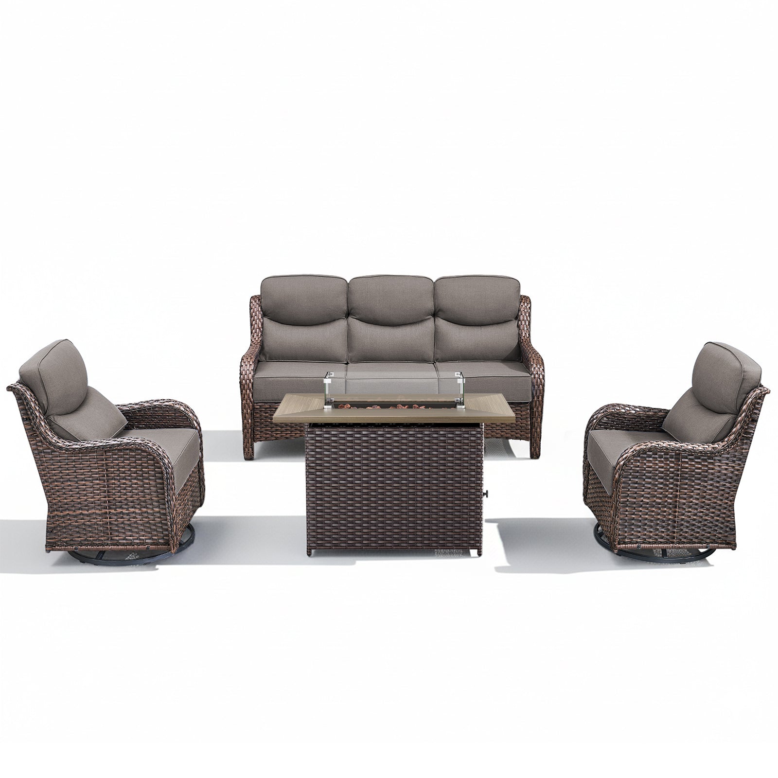 4PCS Outdoor Patio Fire Pit Set for Garden Parties, Rattan Sofa & Swivel Chairs with Rectangular Fire Table and Wind Glass, NT Series