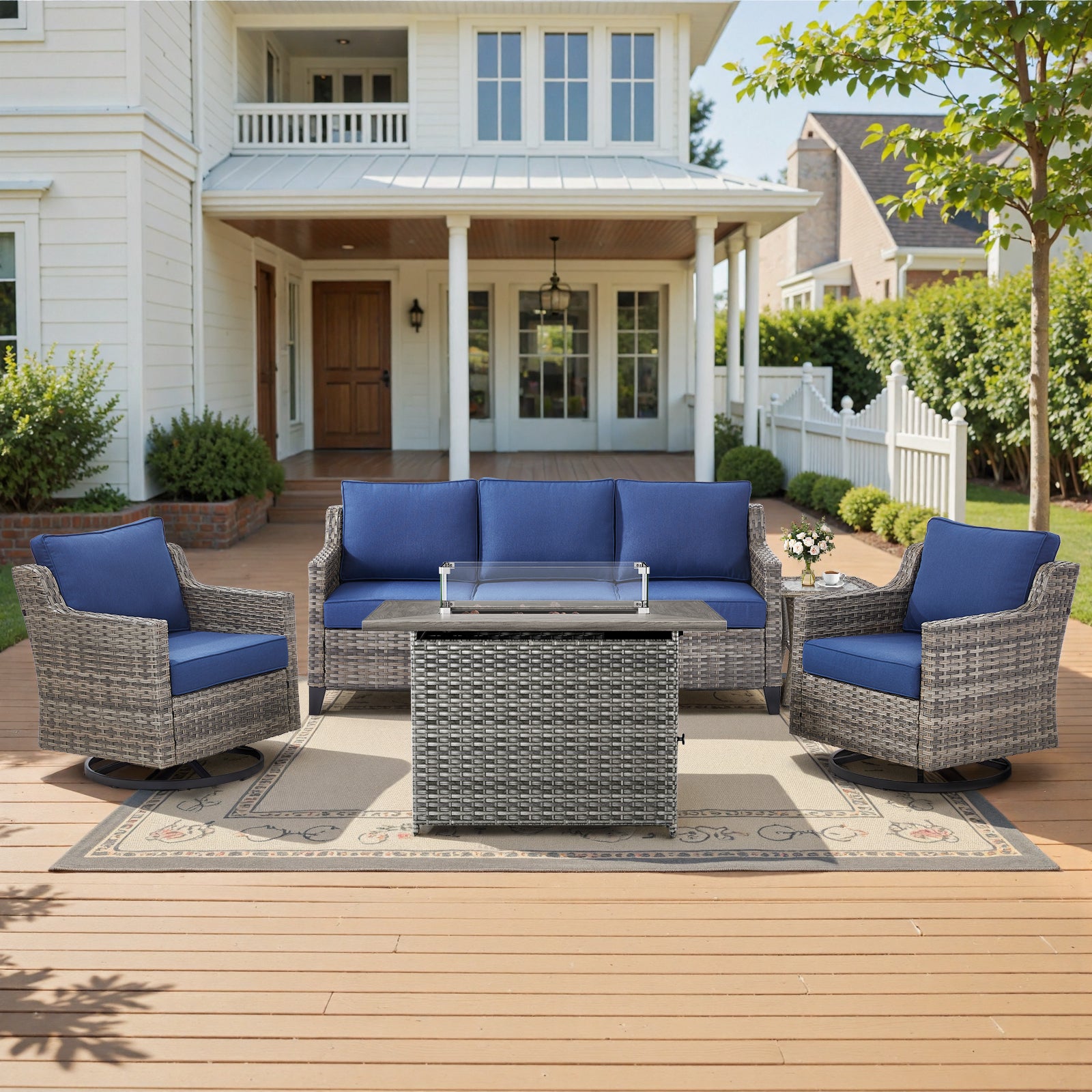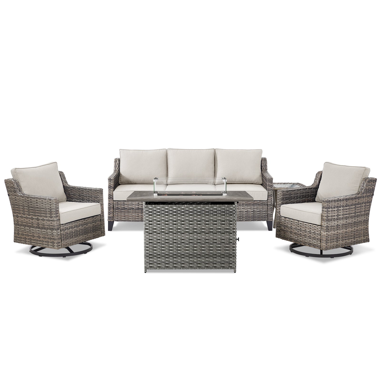 5-Piece Patio Furniture Set: Includes 1 sofa, 2 high-back swivel chairs, 1 long gray wicker fire pit table, and 1 side table. Flexible arrangement allows you to create a customized outdoor seating area.