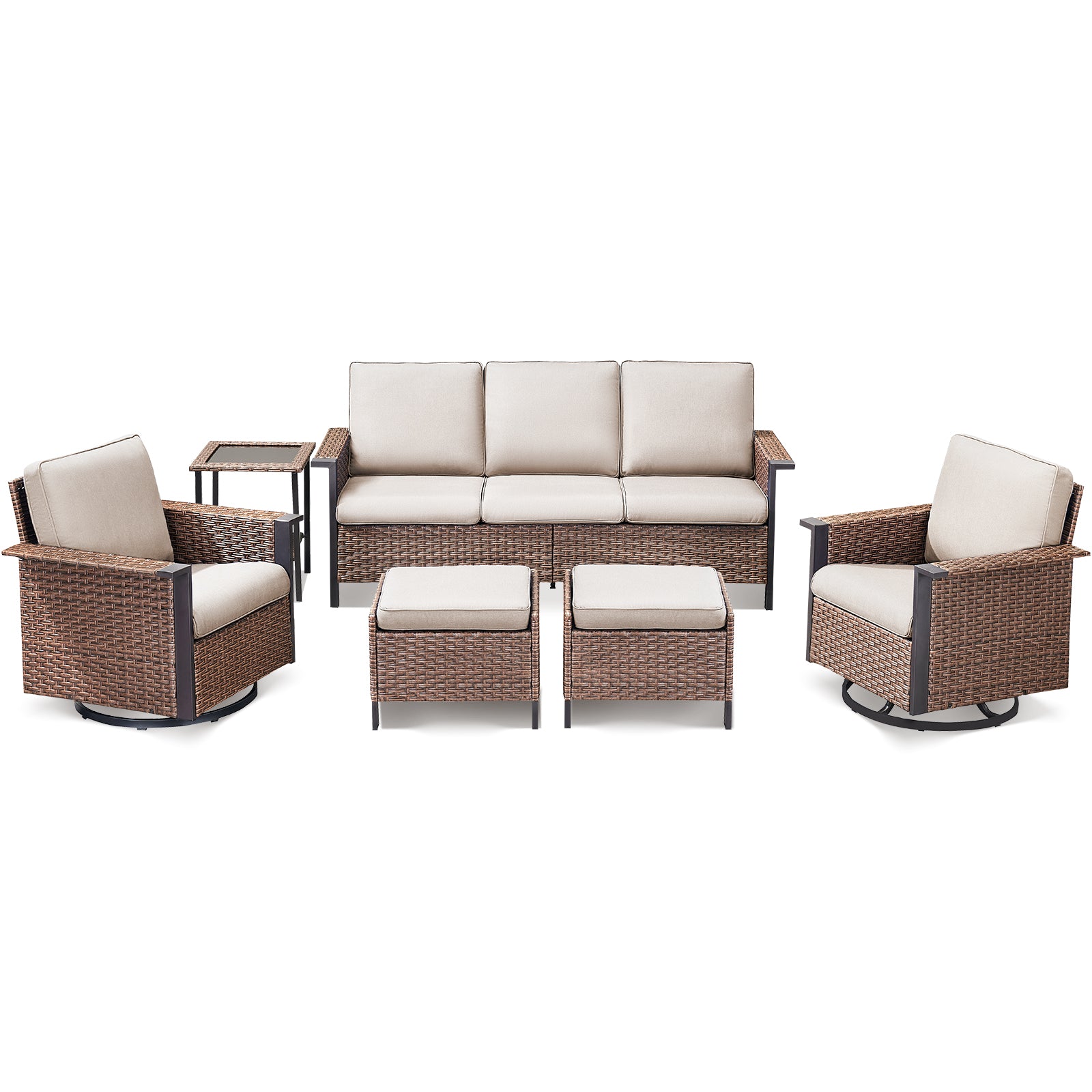 Transform your outdoor living space with this versatile wicker patio furniture set, designed for comfort, durability, and flexible arrangement. Featuring a hand-woven wicker sofa, two high-back swivel chairs, two ottomans, and a side table, this set easily adapts to both small and large outdoor areas. The 360° swivel and gentle gliding motion of the chairs provide an elevated relaxation experience, while the premium PE wicker, thick cushions, and sturdy powder-coated steel frame ensure long-lasting performance in all weather conditions. Perfect for patios, decks, gardens, and poolside lounging, this set brings style, comfort, and adaptability to any outdoor environment.