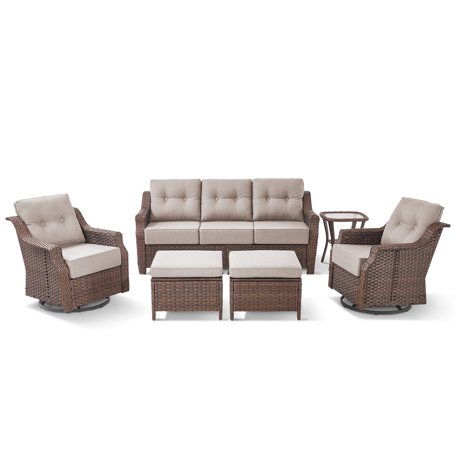 Transform your outdoor living space with the Belord 6-piece wicker patio furniture set, a perfect fusion of comfort, durability, and style. This complete set includes two swivel rocker chairs, a 3-seat sofa, two versatile ottomans, and a tempered glass-top side table—ideal for patios, porches, poolside areas, and backyards. With ergonomic designs, thick cushions, and smooth swivel-glide functionality, it offers an inviting retreat for relaxation or entertaining.