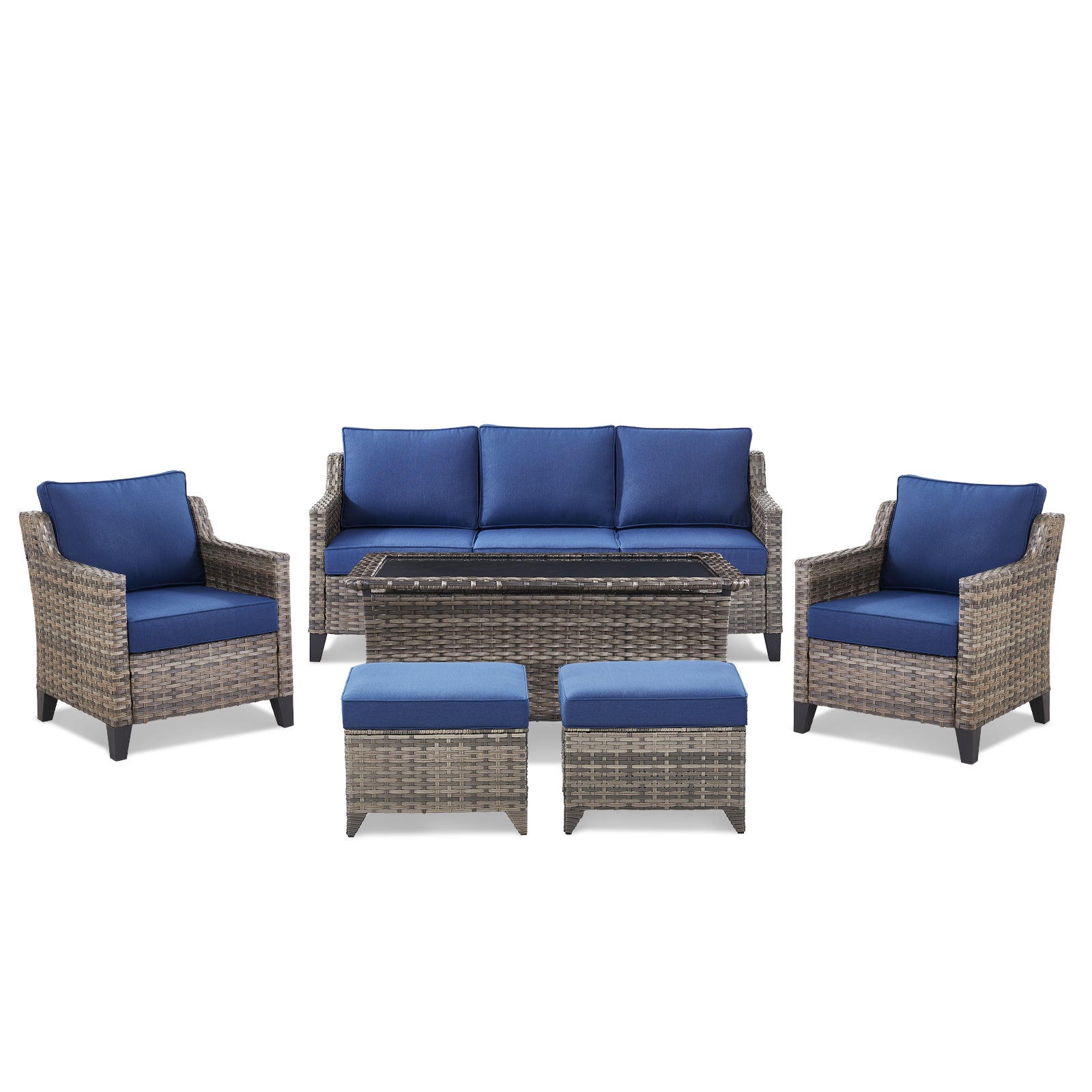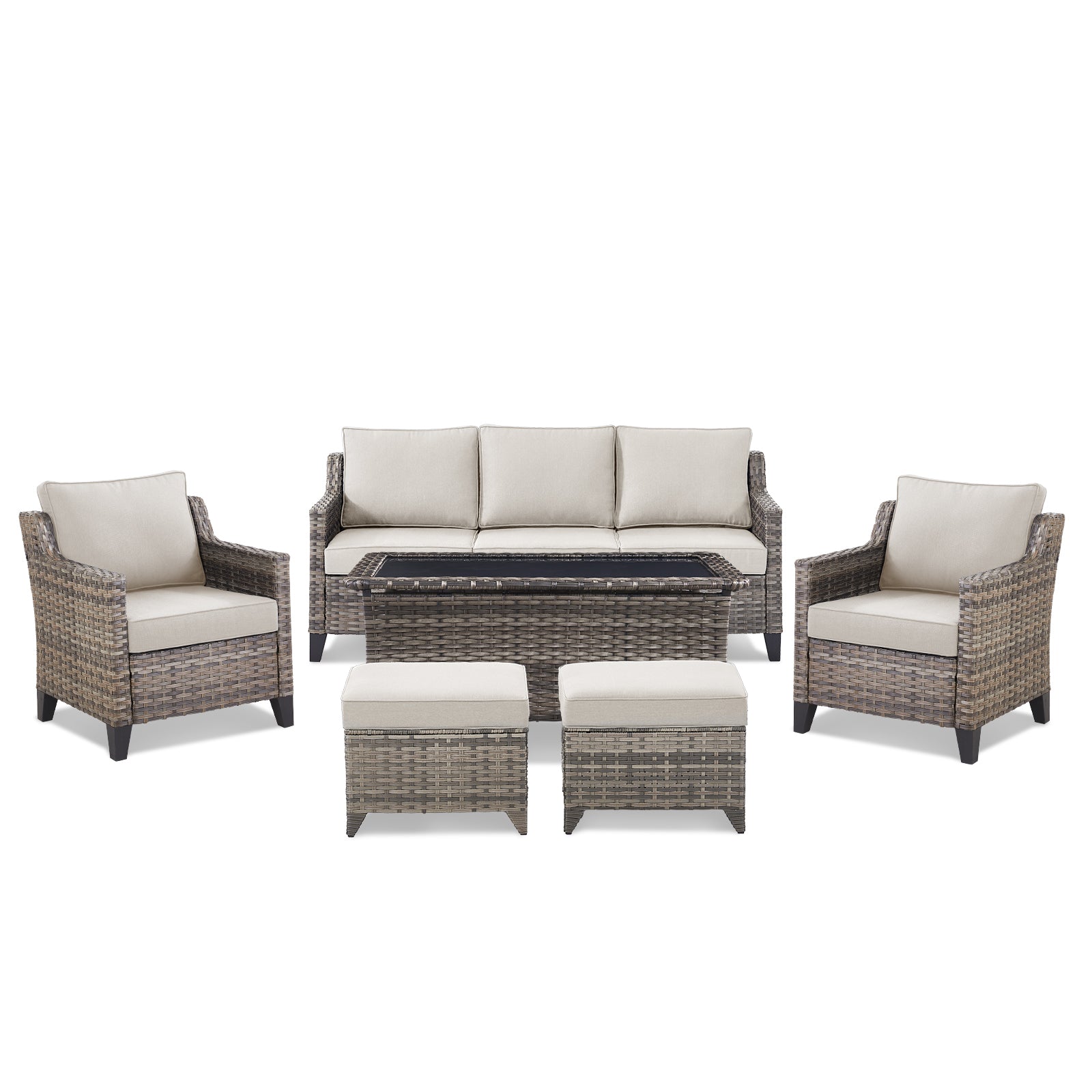 5-Piece Patio Furniture Set: Includes 1 outdoor wicker sofa, 2 high-back single chairs, 1 tempered glass coffee table, and 2 ottoman. Modular layout allows flexible arrangements to suit your space.