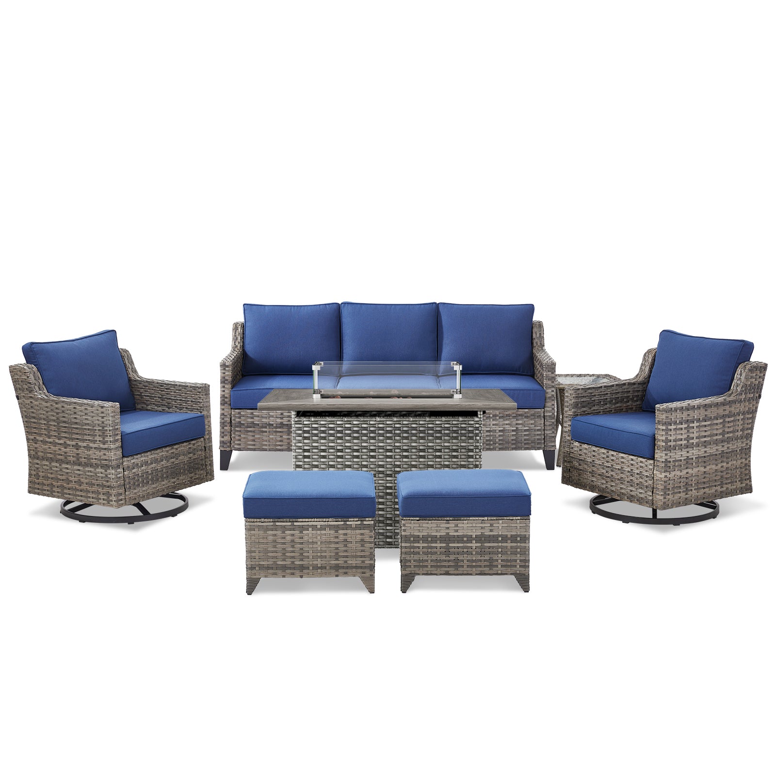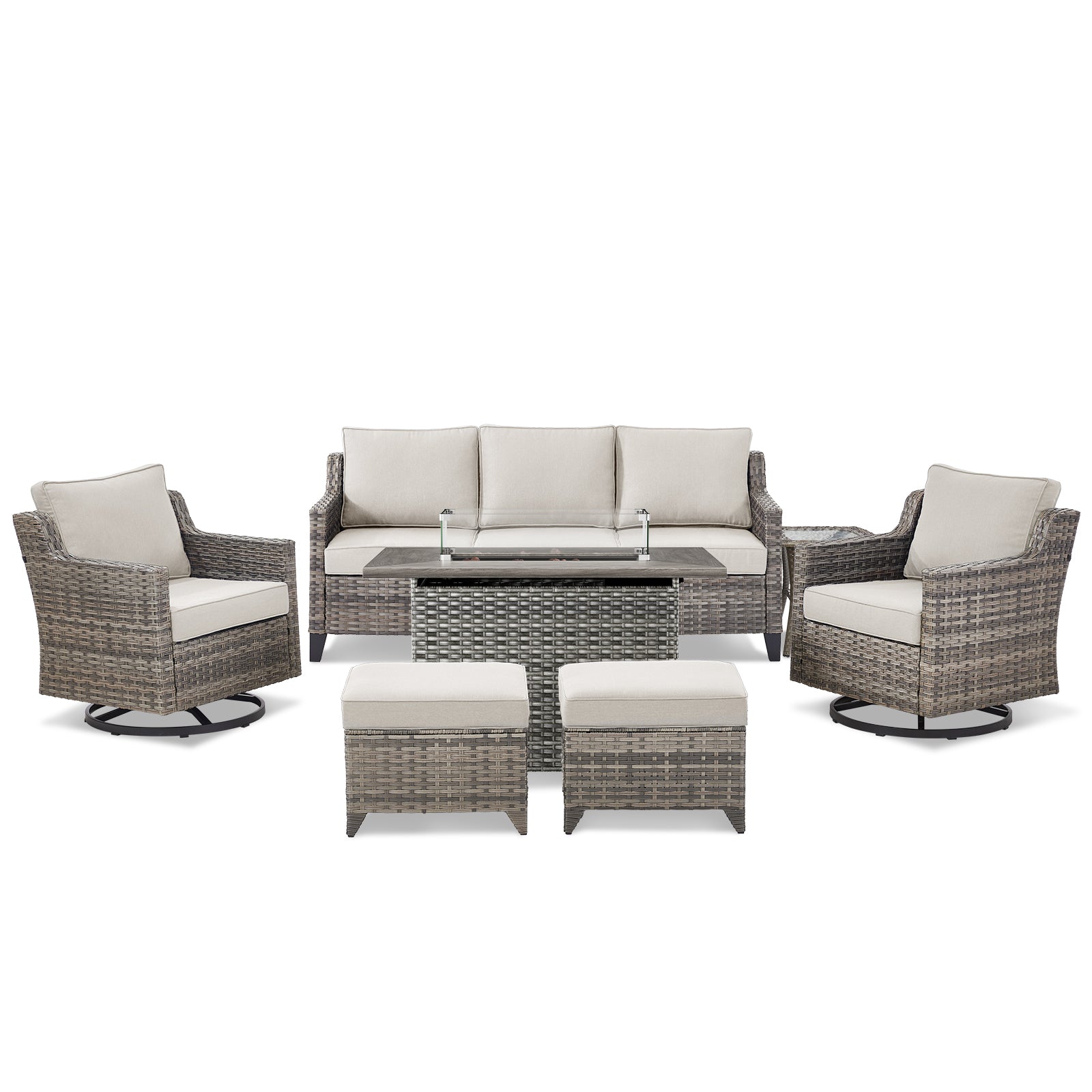 Includes 1 wicker sofa, 2 swivel chairs, 2 ottomans, 1 long gray wicker fire pit table, and 1 side table. The modular design allows you to customize your outdoor seating layout with ease.