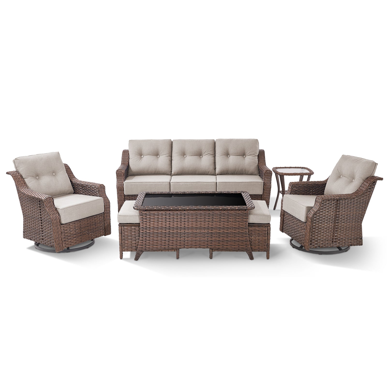 Enjoy cozy outdoor moments with the Belord 7-piece patio conversation set—designed to blend comfort, function, and style. This complete wicker set includes two swivel rocker chairs, two ottomans, one 3-seat sofa, side tables, and a 40-inch coffee table. Perfect for lounging, entertaining, or relaxing in your backyard, patio, or balcony.