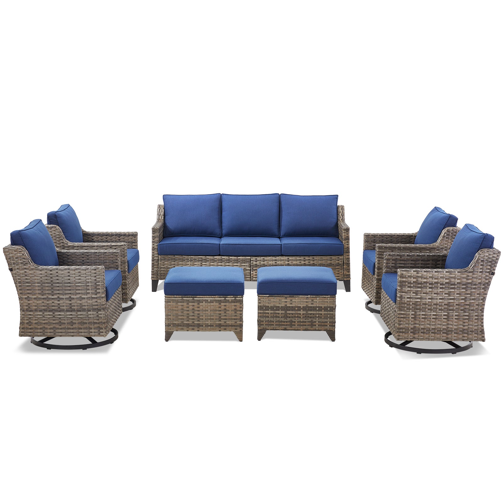 Includes 1 wicker sofa, 4 high-back swivel patio chairs, and 2 ottomans. The modular layout allows you to customize your outdoor seating arrangement to fit your space and lifestyle.