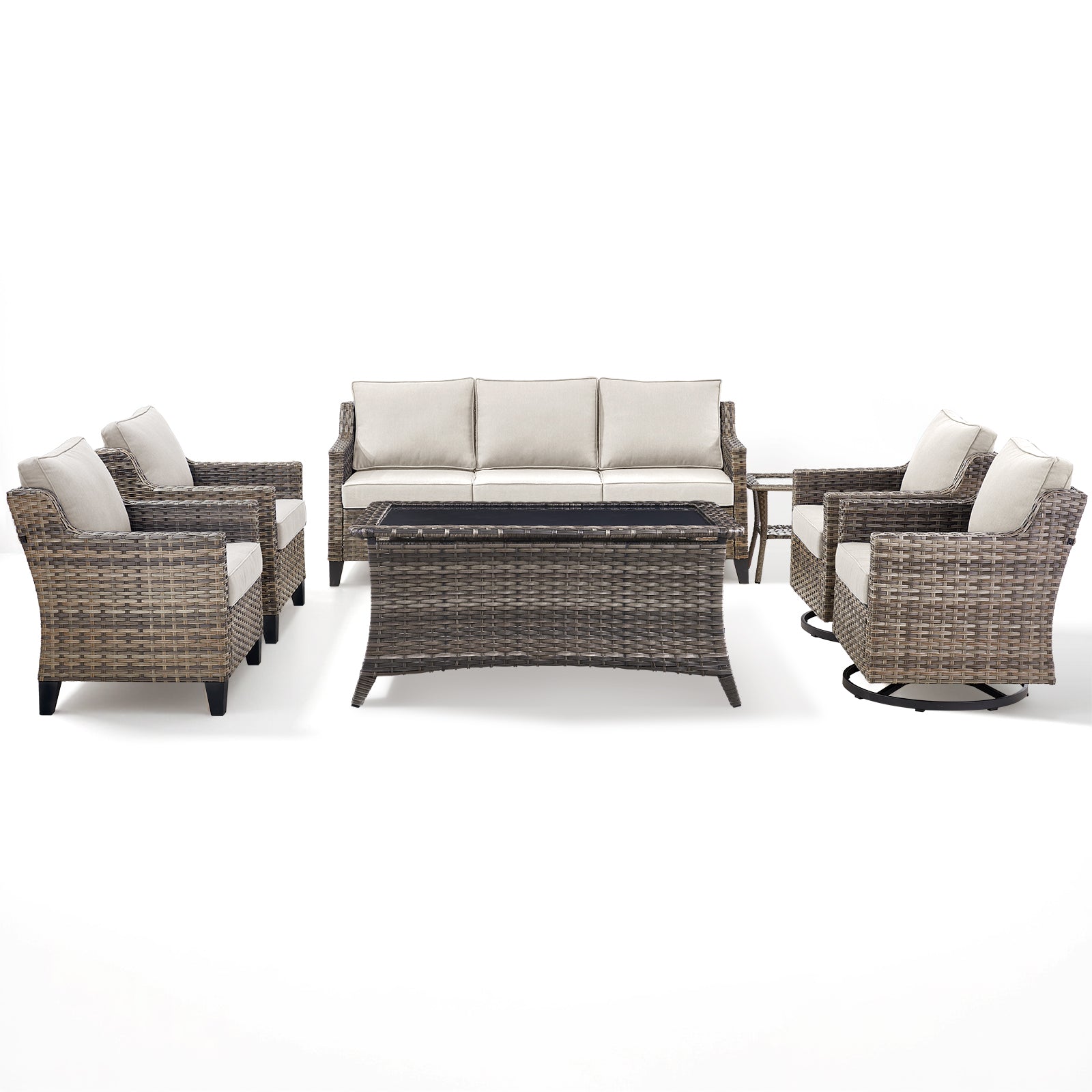 Includes 1 sofa, 2 single chairs, 2 swivel chairs, 1 coffee table, and 1 side table. The modular layout allows you to create a customized outdoor seating arrangement that fits your space and lifestyle.