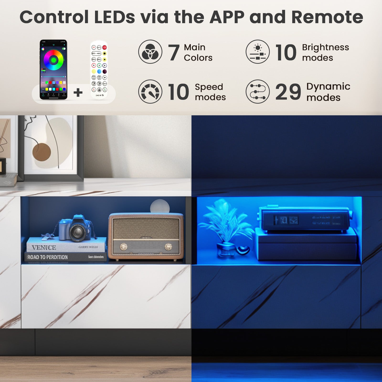 The Belord Modern TV Stand for 65-inch and larger TVs combines elegance and practicality with its marble-inspired design and ample storage space. Featuring customizable RGB LED lighting, it enhances your living room or bedroom with a luxurious and modern touch while keeping your entertainment area organized and stylish.