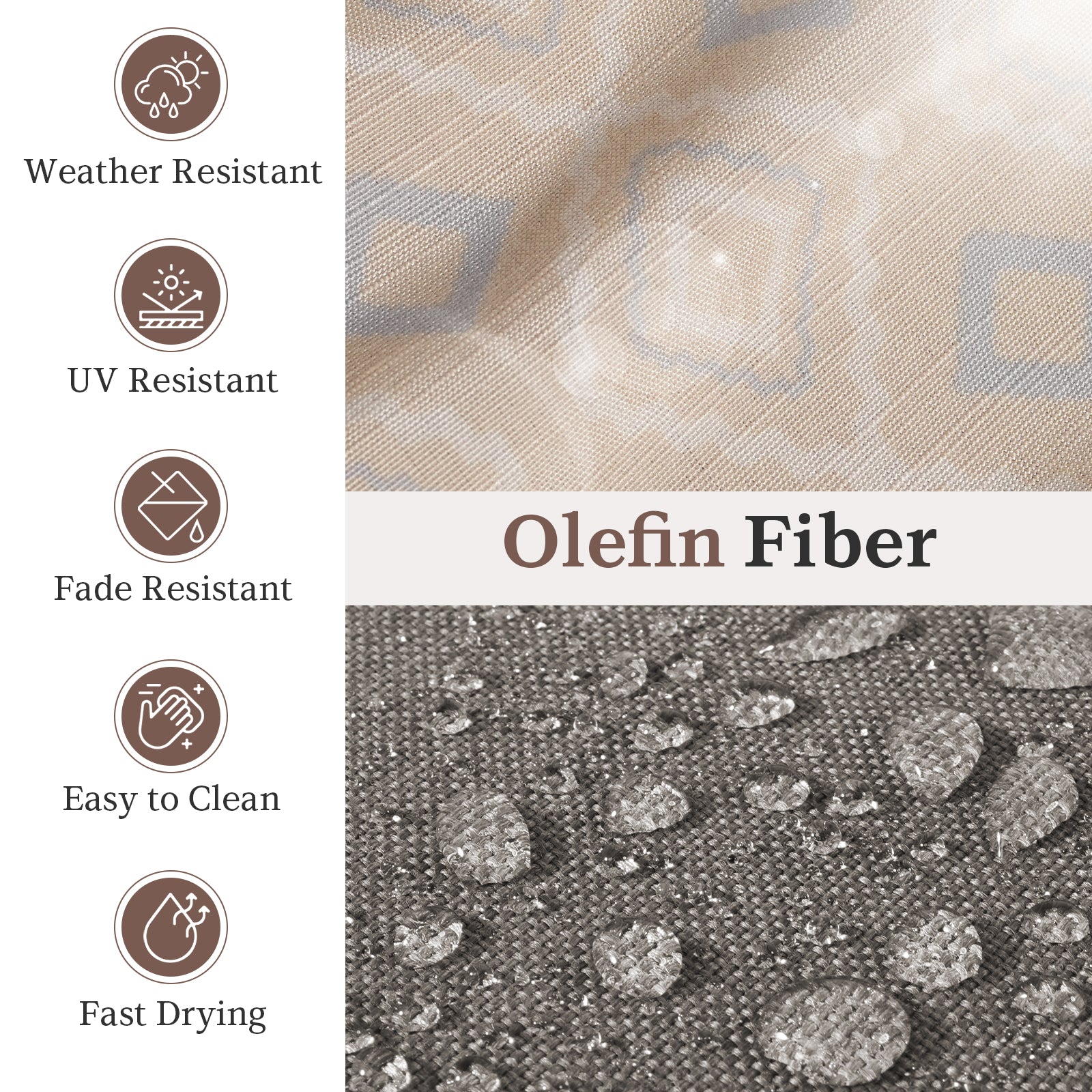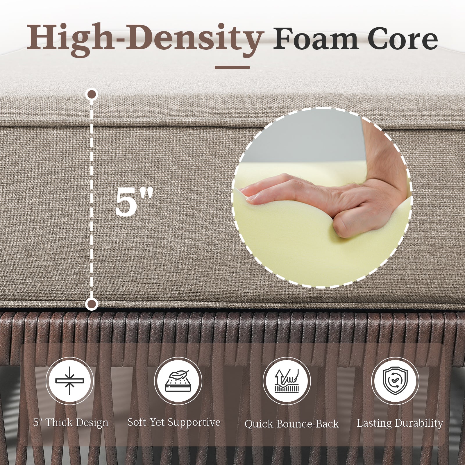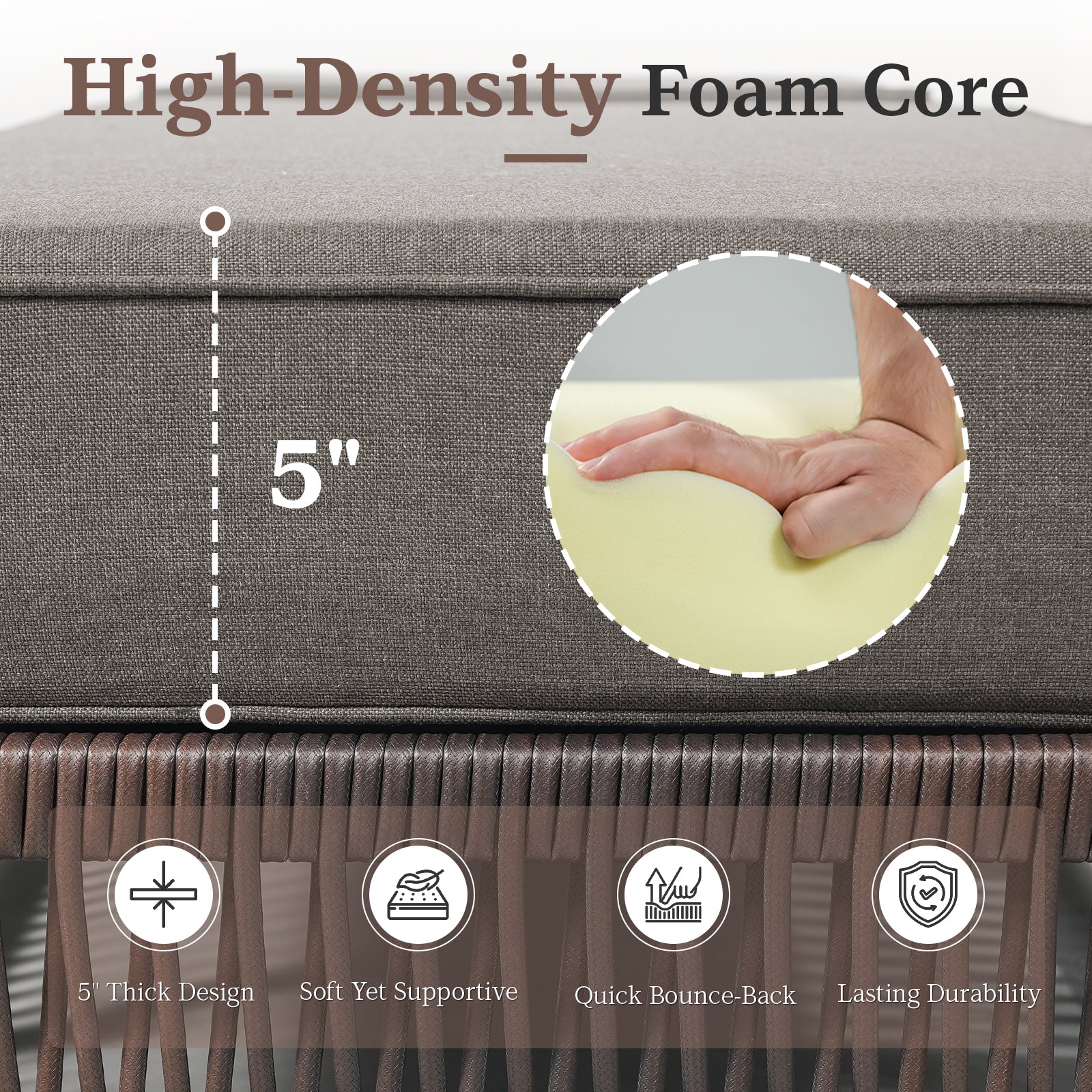 Seat and back cushions are upholstered in premium Olefin fabric that is water-resistant, UV-resistant, and fade-resistant. High-density 28D foam provides excellent support, comfort, and shape retention.
