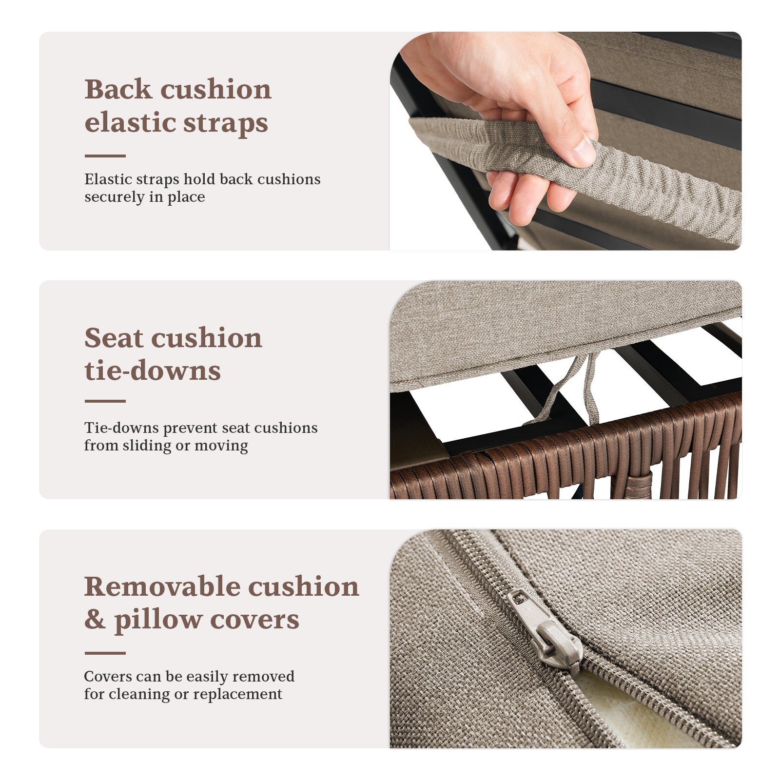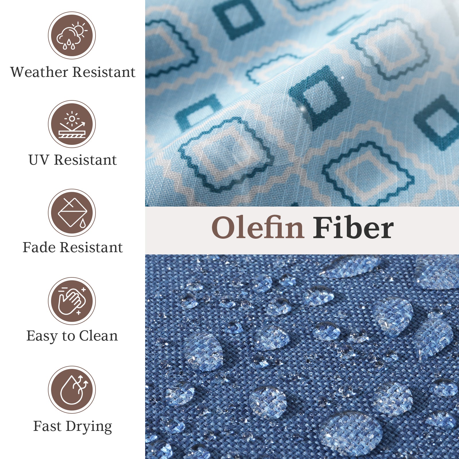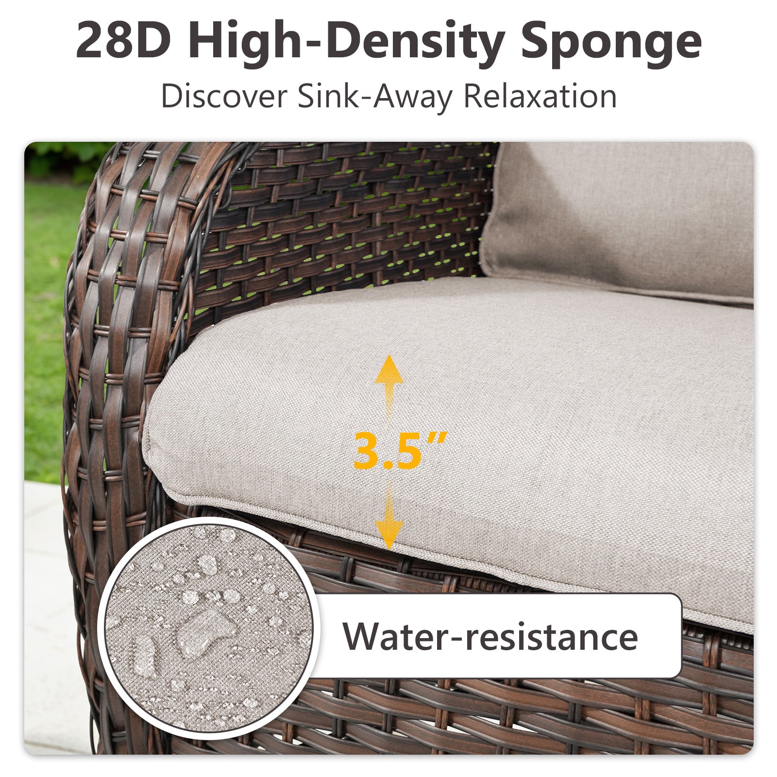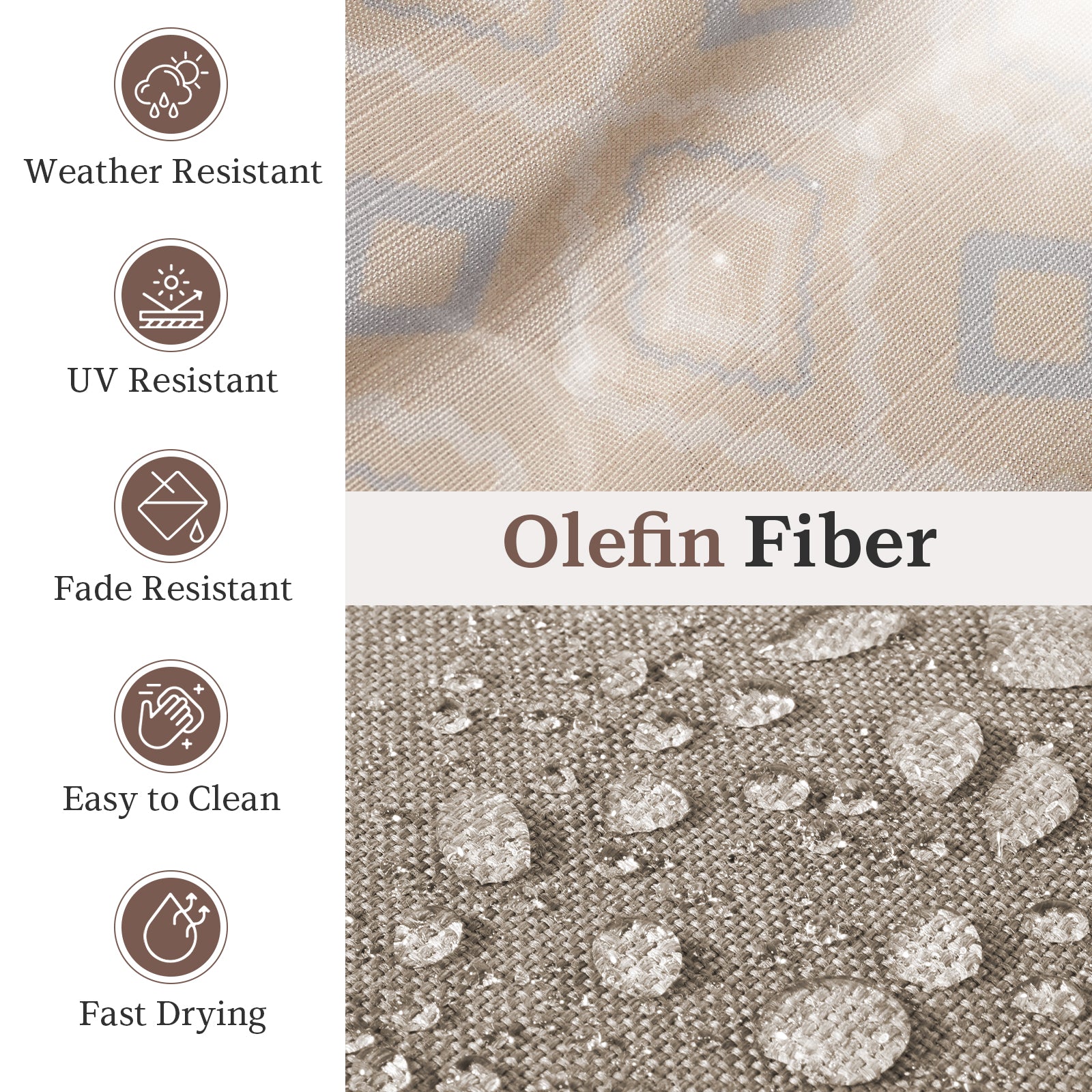 Seat and back cushions are upholstered in premium Olefin fabric that is water-resistant, UV-resistant, and fade-resistant. High-density 28D foam provides excellent support, comfort, and shape retention.