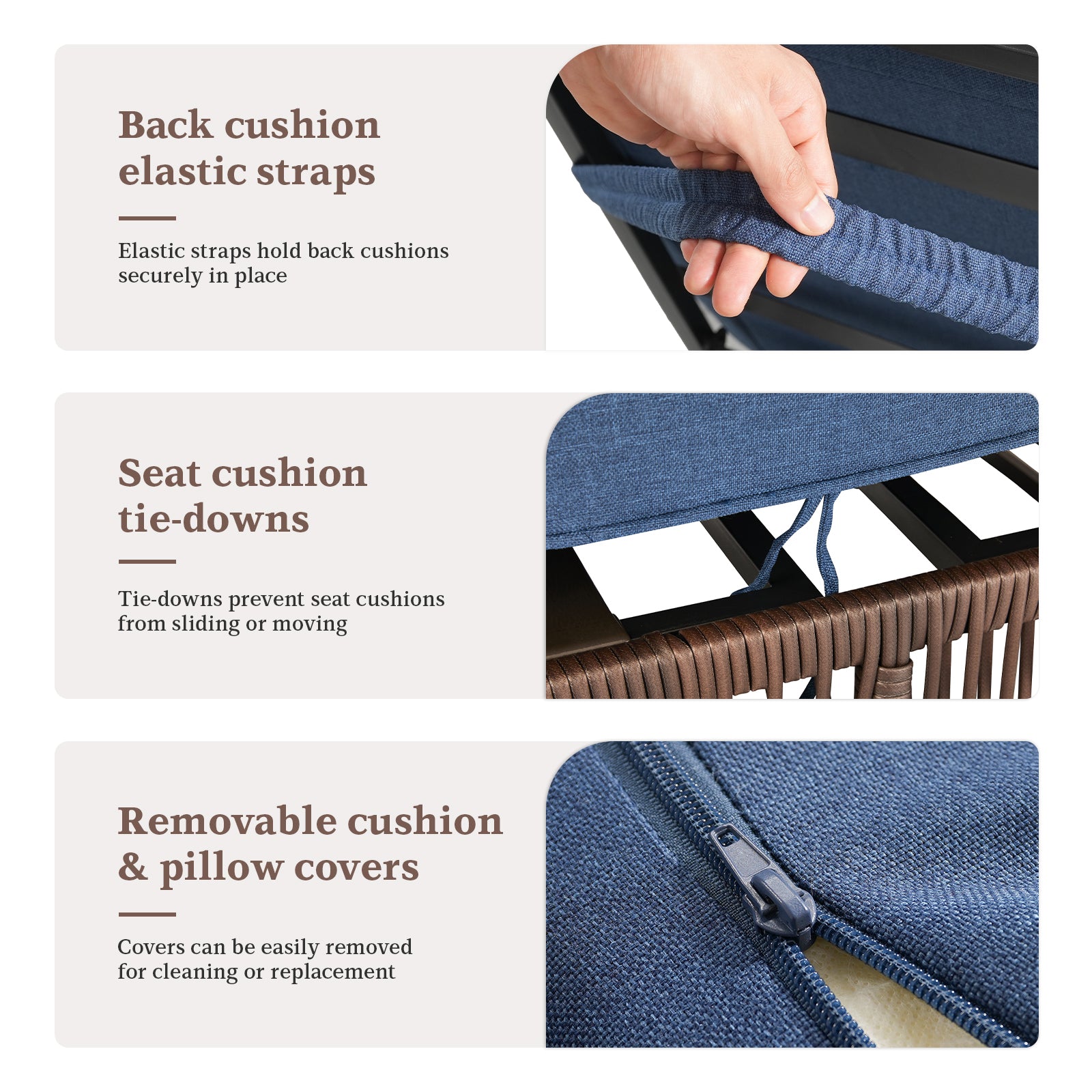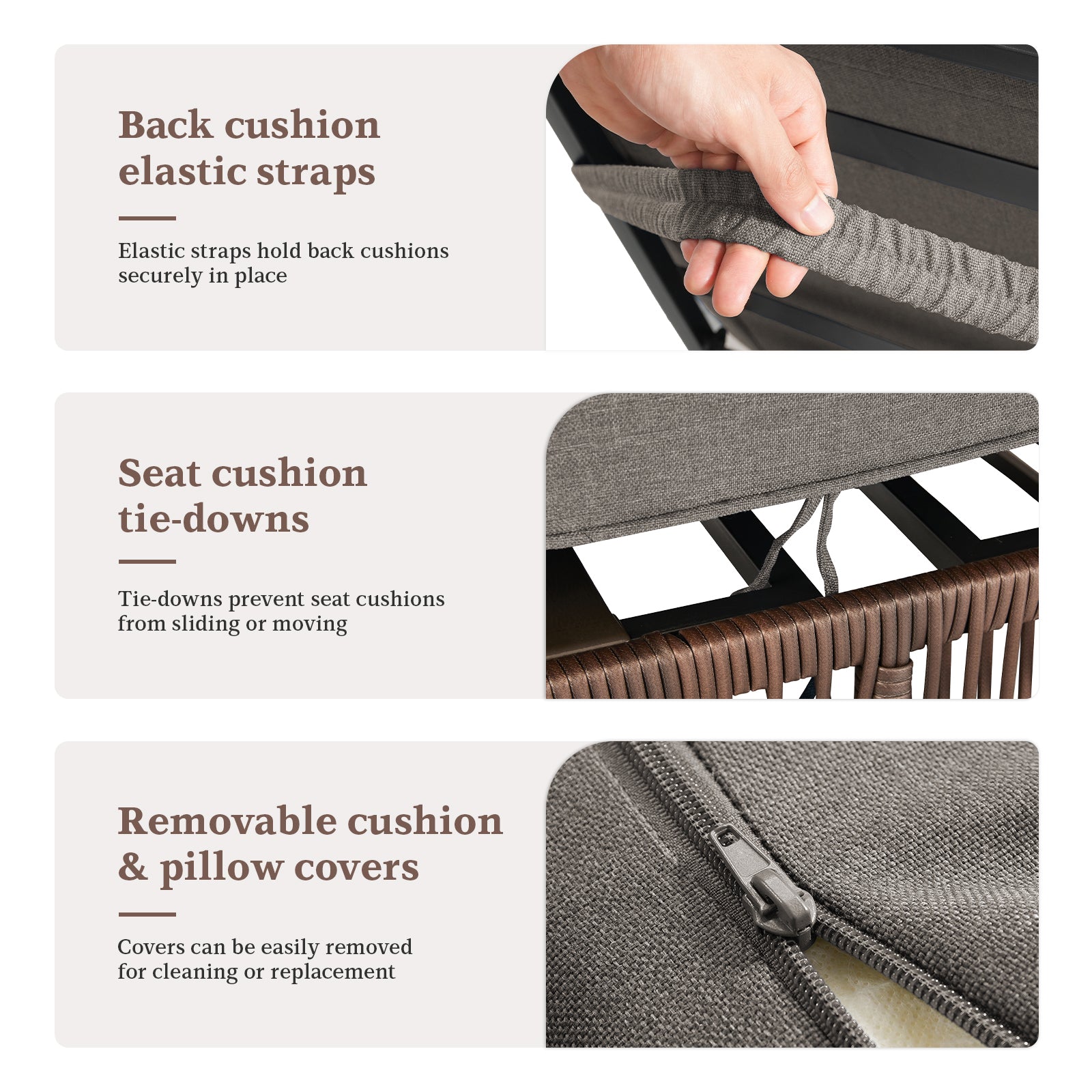Built with all-weather hand-woven PE wicker, rust-resistant powder-coated steel frames, and reinforced support structures. Each seating piece supports up to 350 lbs for reliable everyday use.