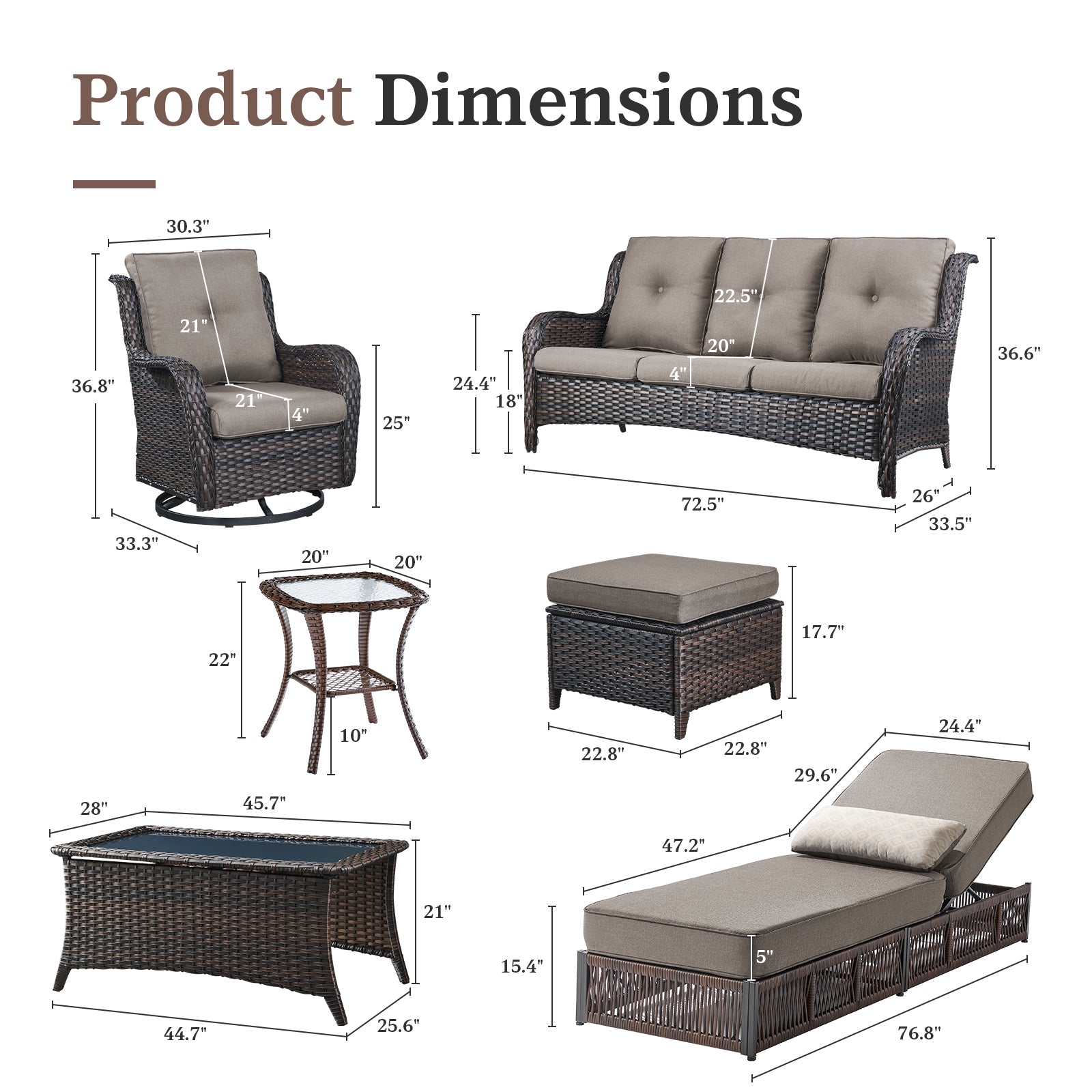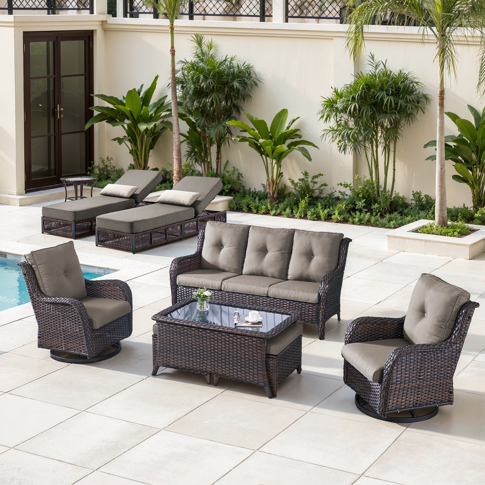 Includes one sofa, two swivel rocker chairs, two adjustable chaise lounges, two ottomans, one coffee table, and one side table—designed to accommodate lounging, seating, and entertaining in one coordinated setup.