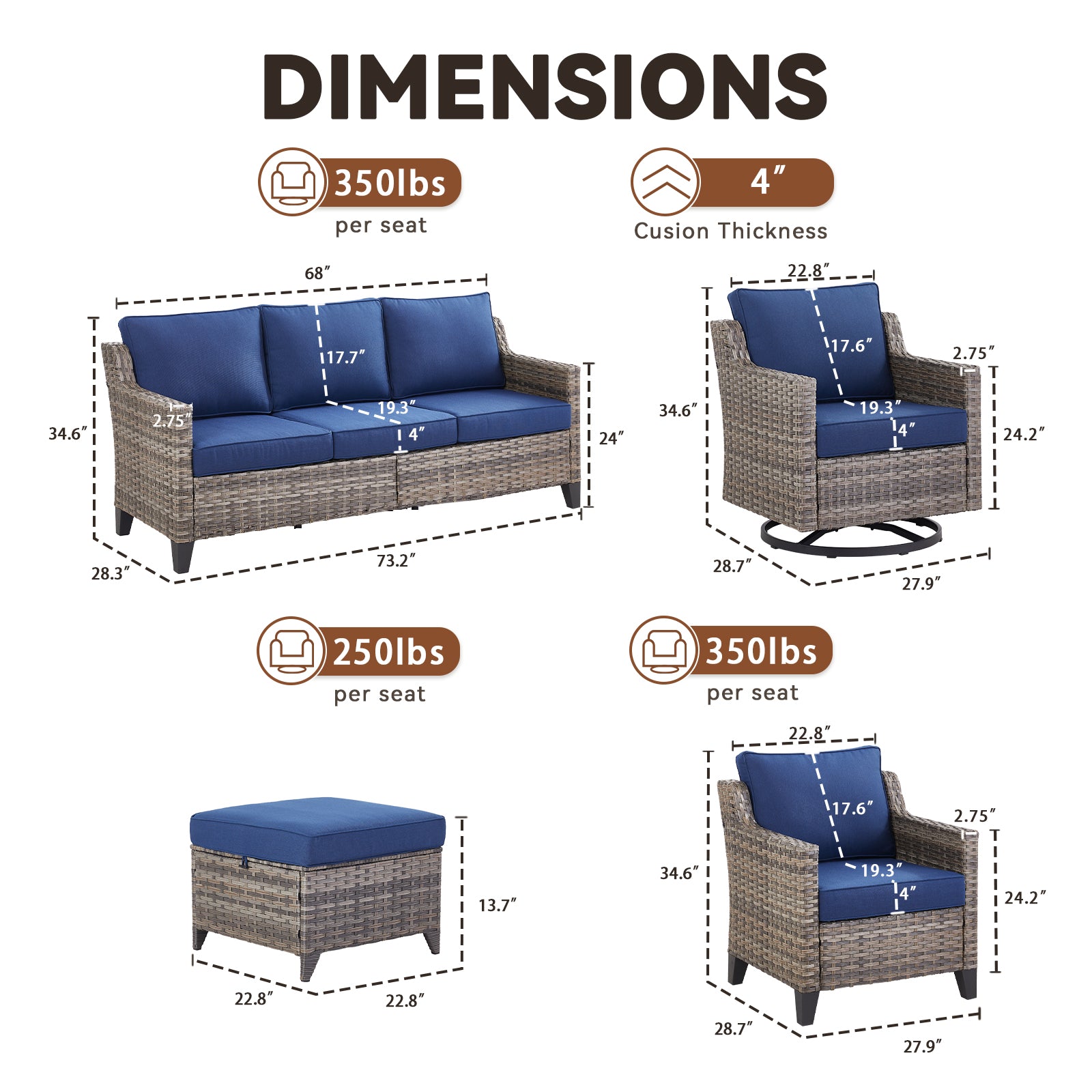 This outdoor patio furniture set includes 1 hand-woven wicker sofa, 2 swivel patio chairs, 2 Rattan wicker chairs, and 2 ottomans, providing a versatile and comfortable seating solution for your patio, deck, garden, or poolside. The modular design allows you to freely arrange the pieces to suit both small and large spaces, making it ideal for relaxing, socializing, or hosting guests.