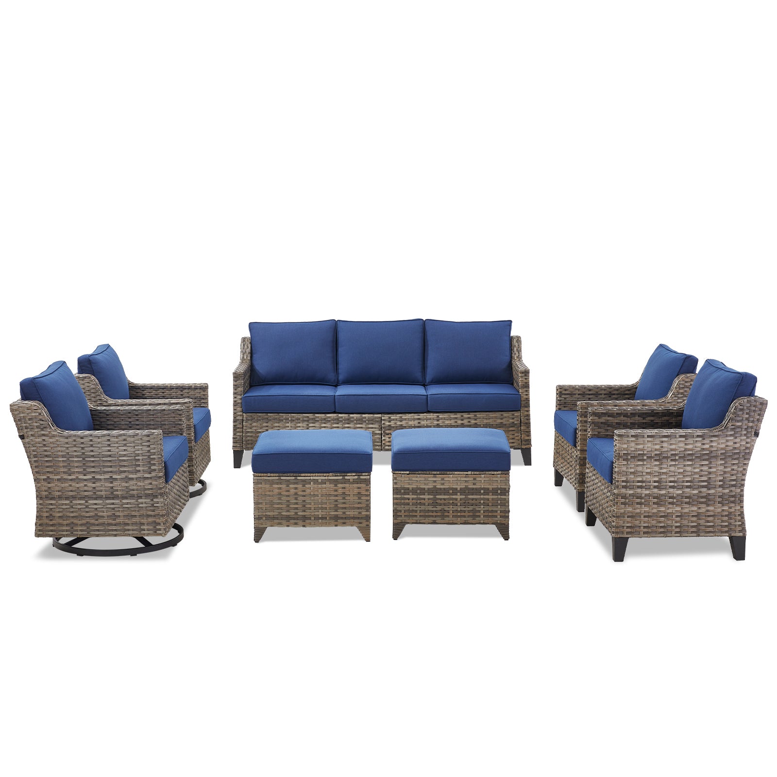Includes 1 sofa, 2 swivel chairs, 2 Rattan chairs, and 2 ottomans. The flexible layout lets you create a customized seating arrangement for your outdoor space.