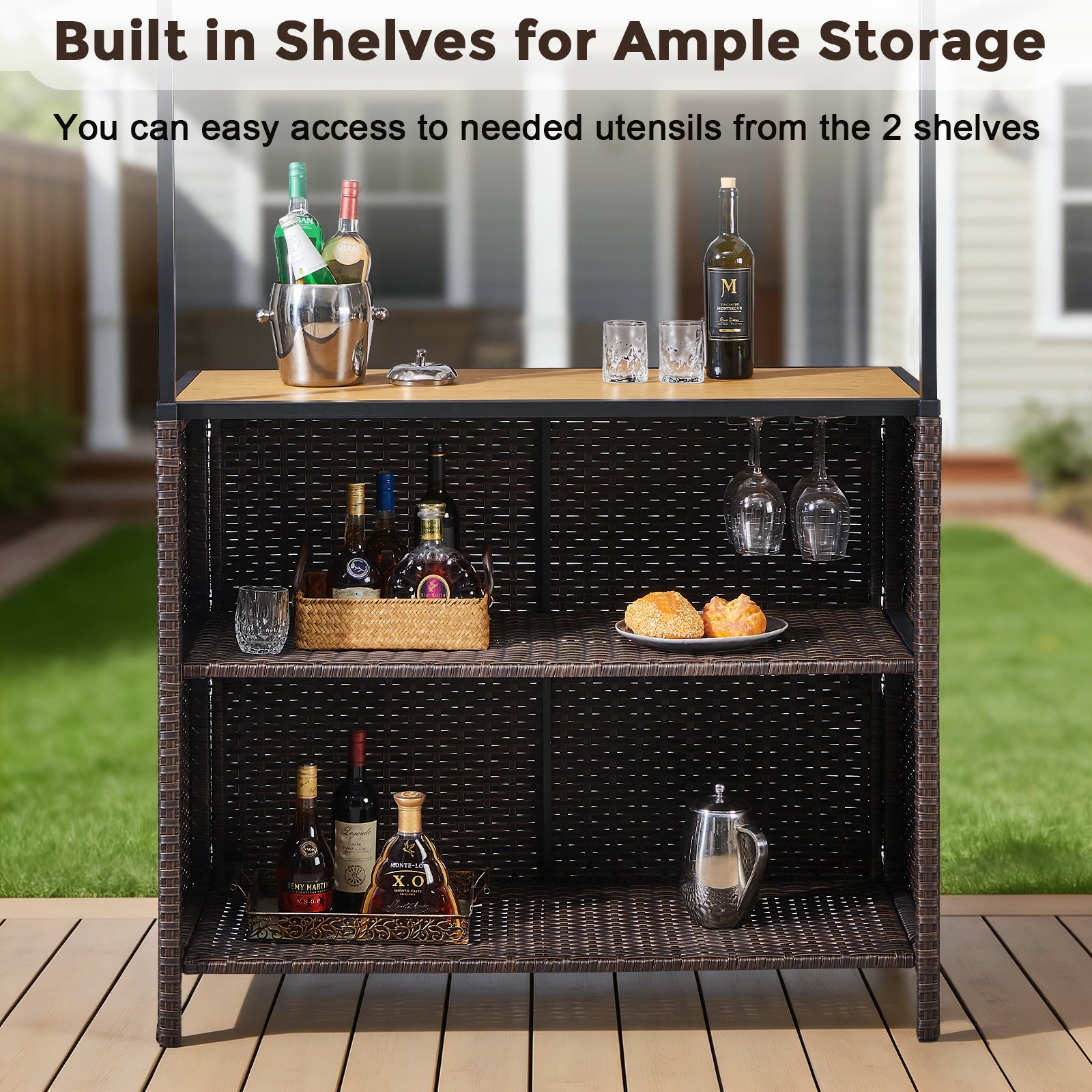 Designed for seamless entertaining, this outdoor bar height set includes two spacious storage shelves for bottles, mixers, and décor, along with a built-in wine glass rack to keep stemware neatly organized. The wood-plastic composite (WPC) tabletop offers a smooth, durable, and easy-to-clean surface, perfect for serving drinks and snacks with ease.