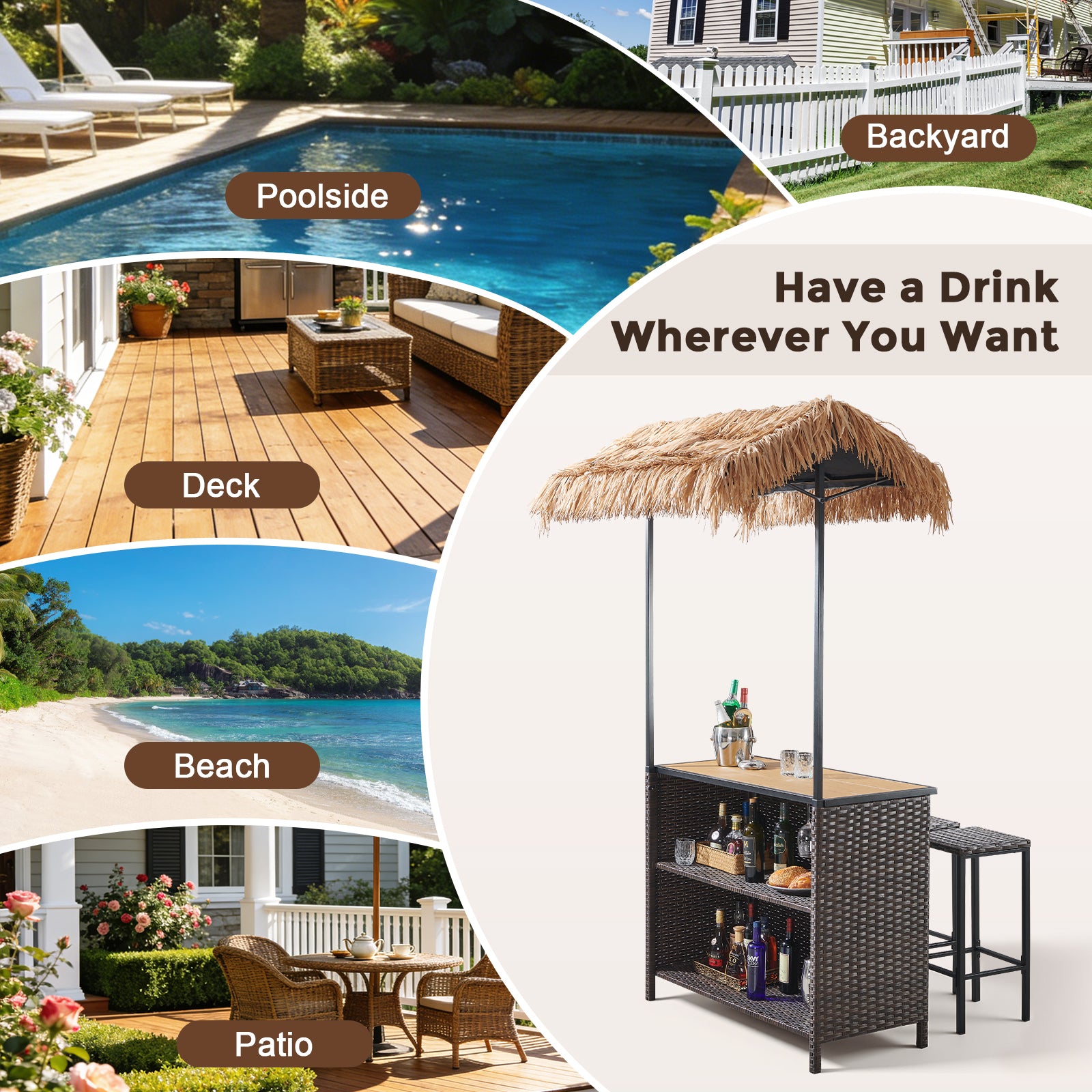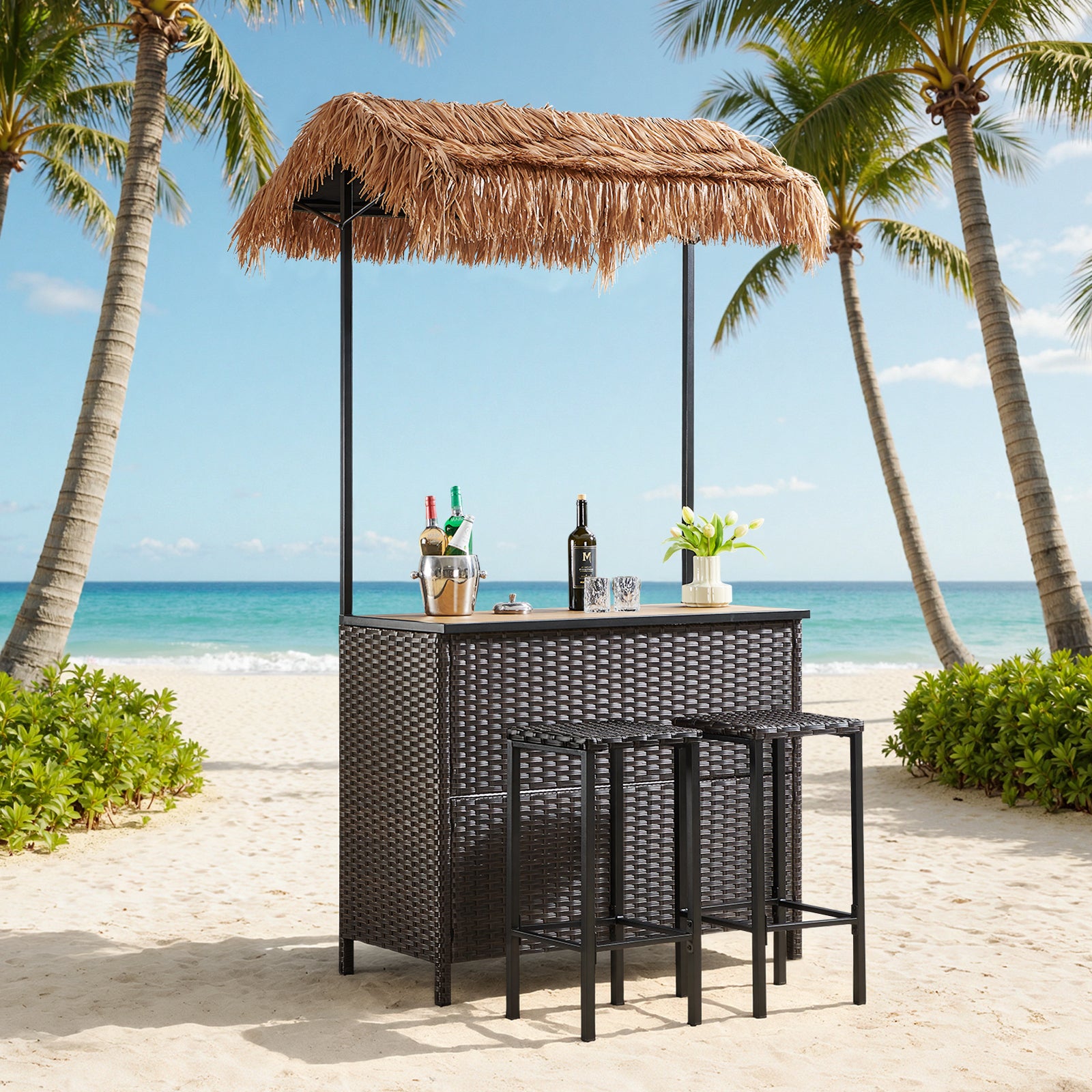 Belord 3-Piece Outdoor Tiki Bar Set, All-Weather Wicker Patio Bar with Palapa Canopy, Stools & Storage