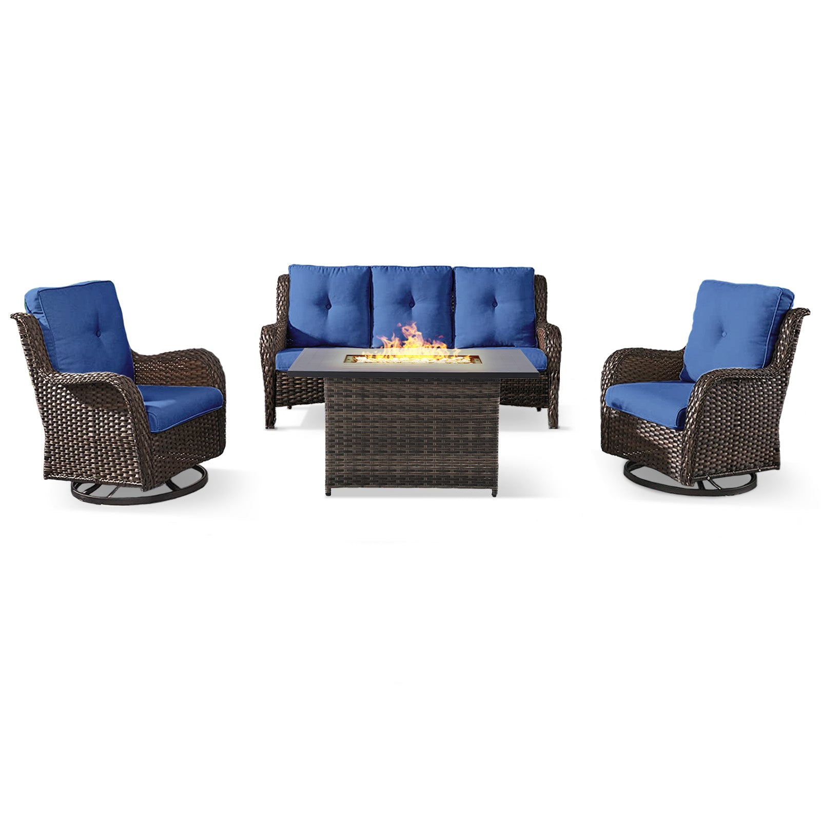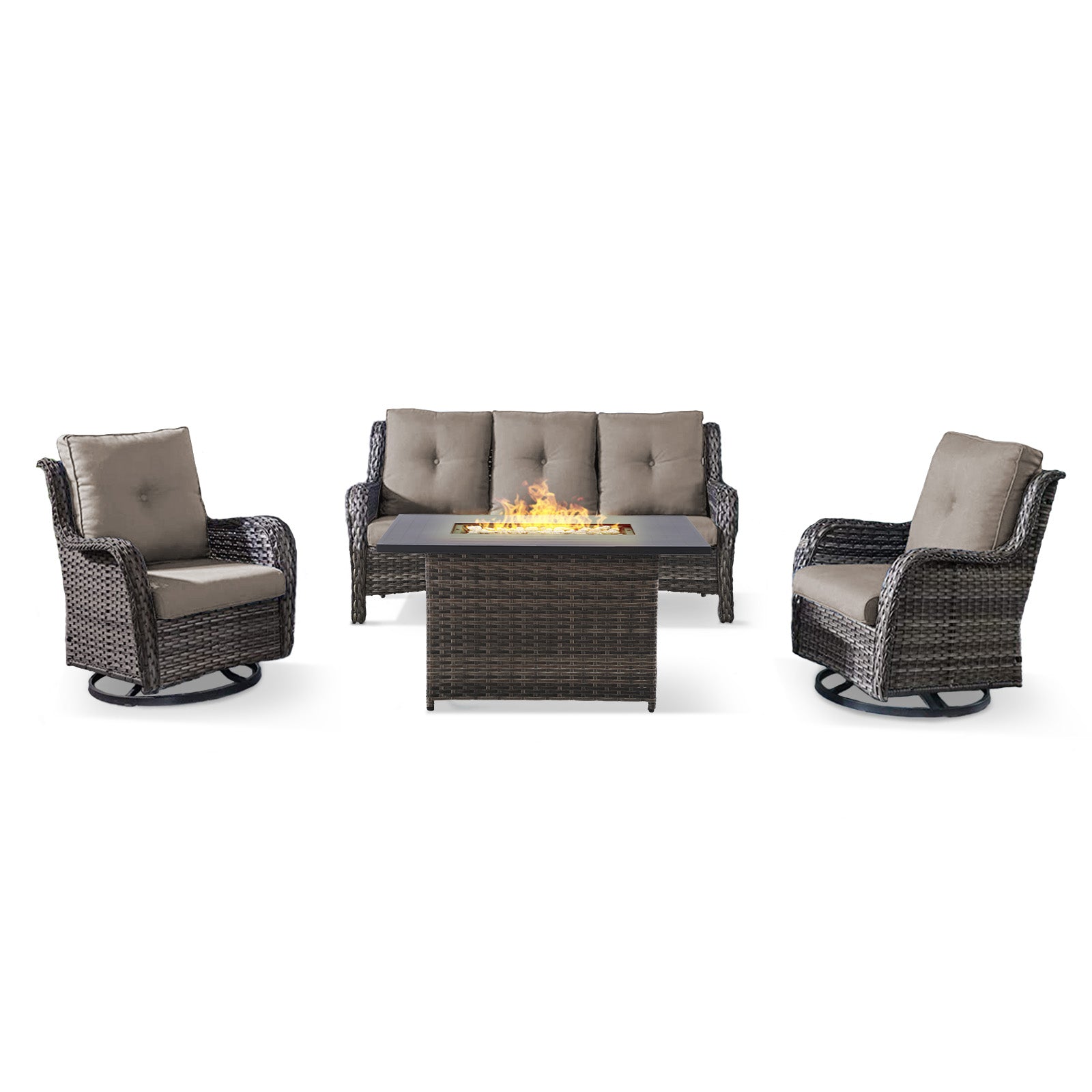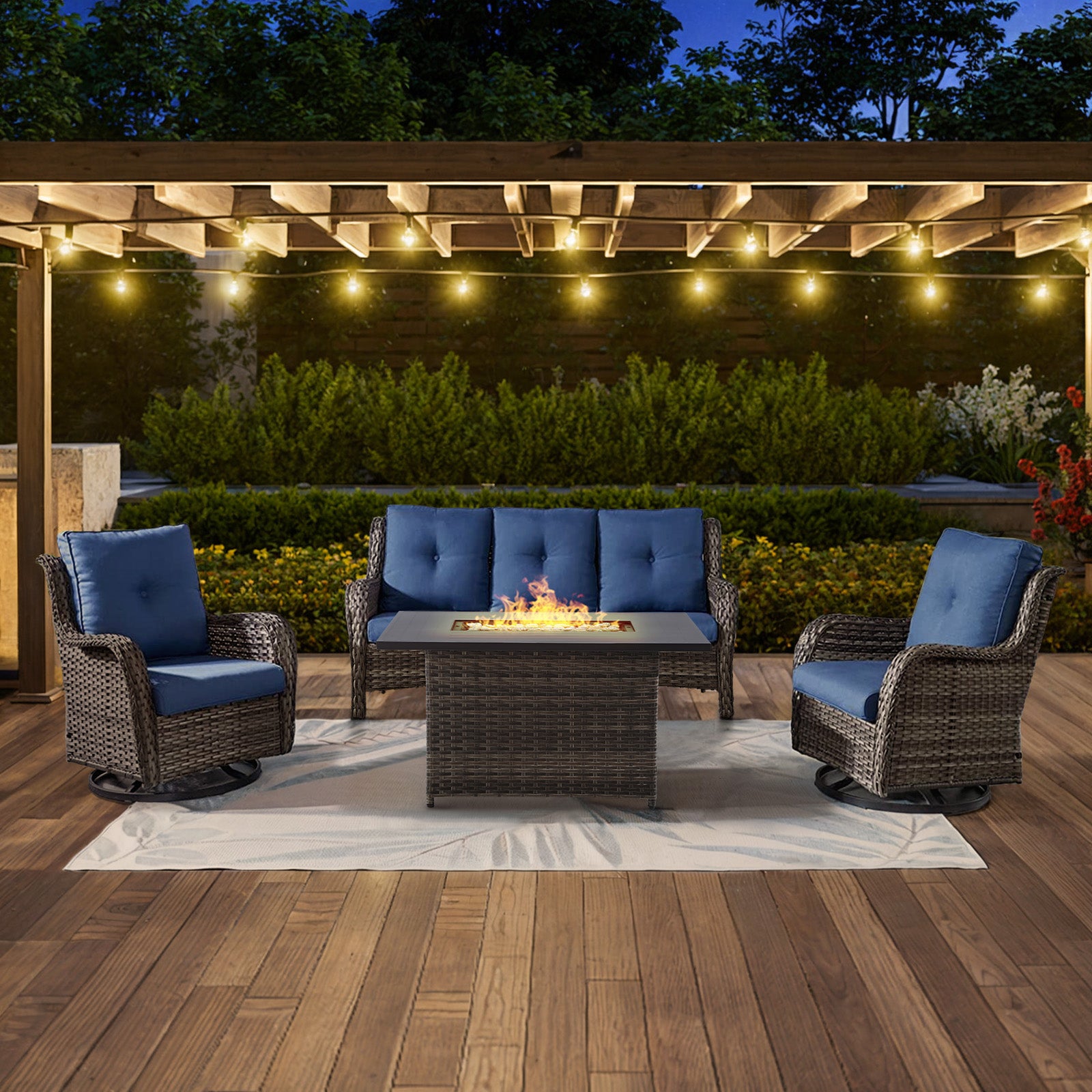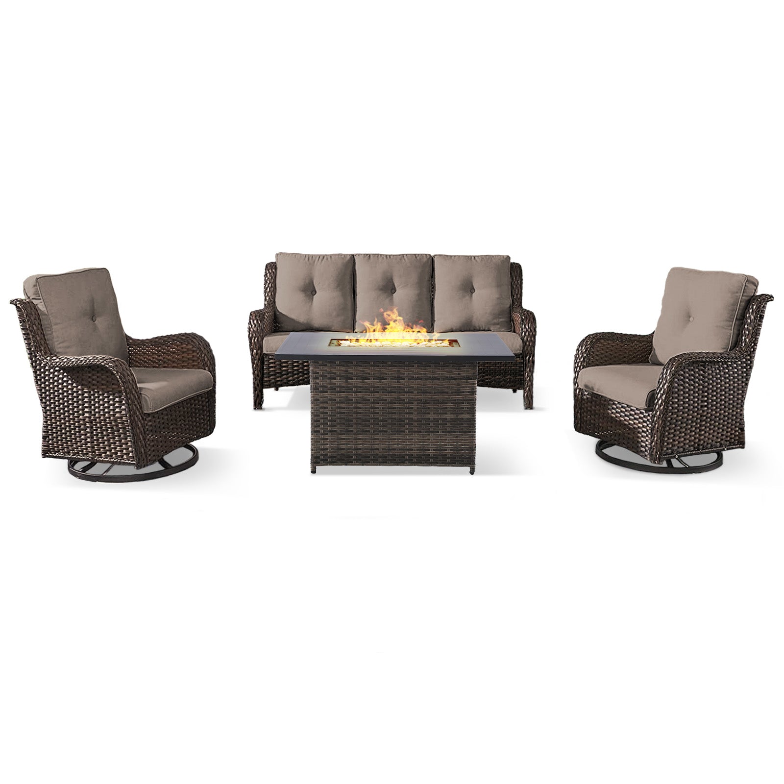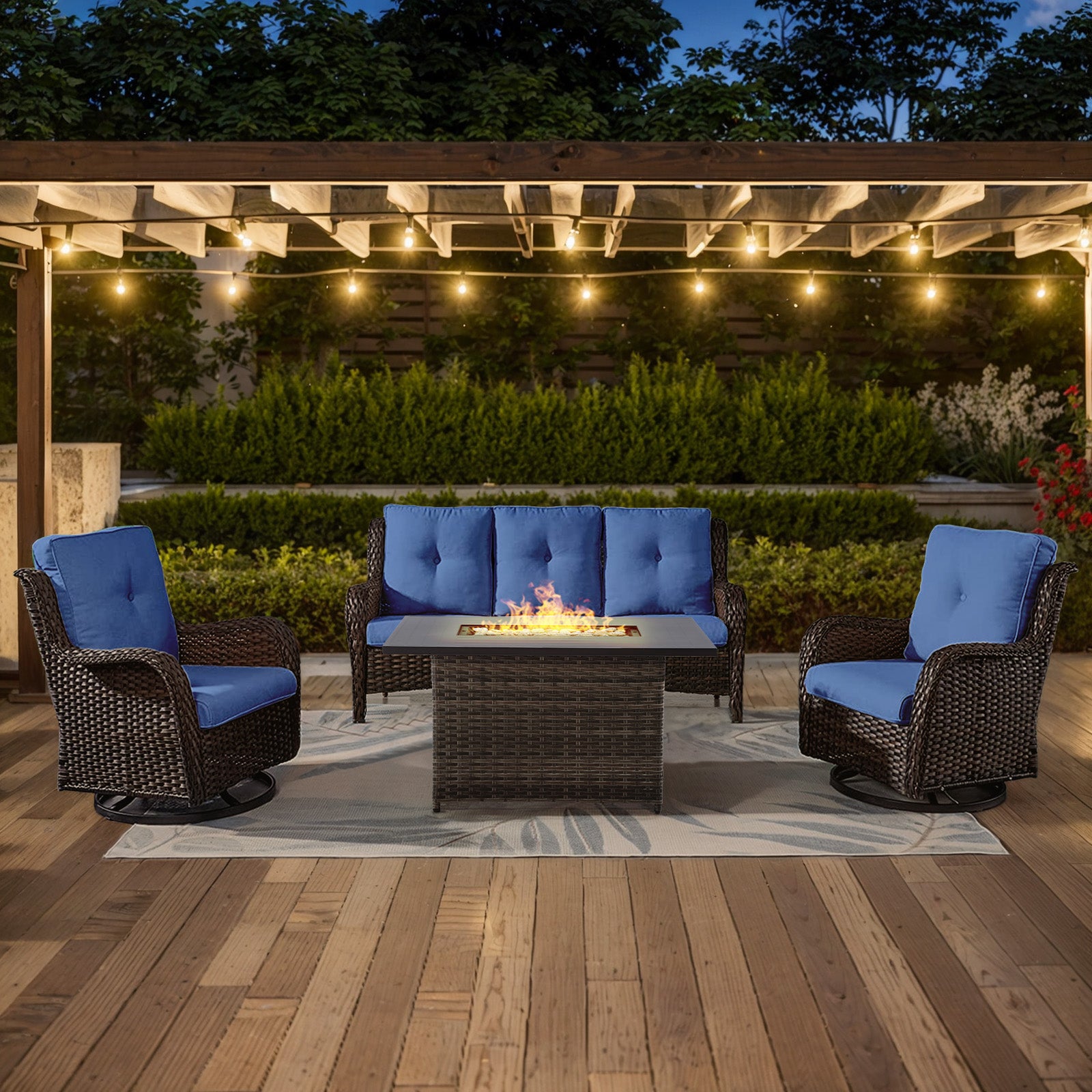 Transform your outdoor space into a luxurious and versatile retreat with this 4-piece patio wicker furniture set. Designed for comfort, durability, and modern living, it includes two swivel glider chairs, a sofa, and a height-adjustable propane fire pit table—perfect for relaxing evenings, dining, and memorable gatherings on your patio, deck, or garden.