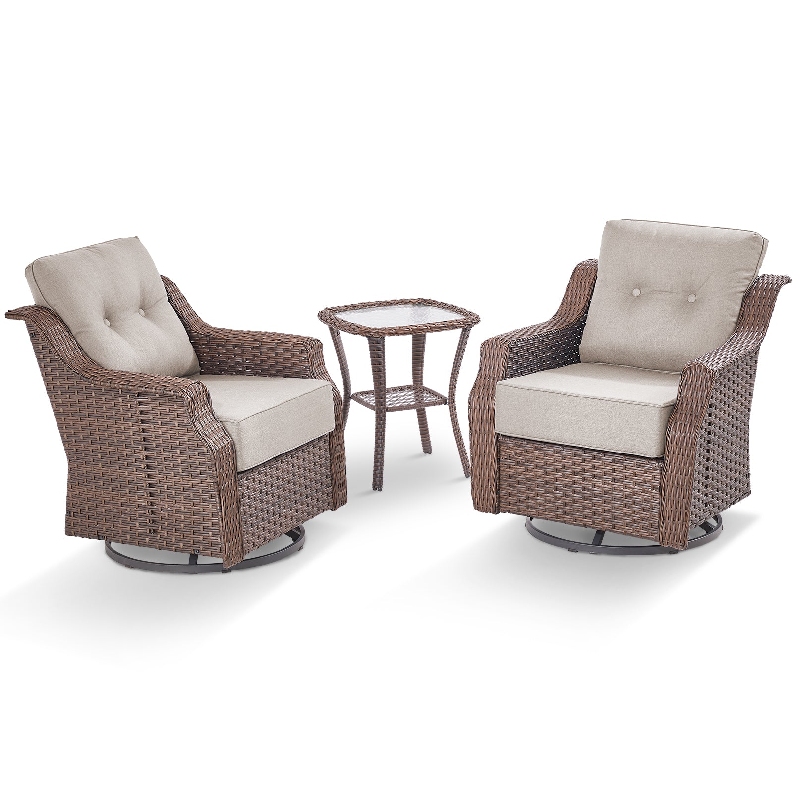 Upgrade your outdoor space with this complete 3-piece wicker patio furniture set, featuring two swivel rocker glider chairs and a tempered glass-top side table. Combining timeless style with unmatched comfort and durability, this set is perfect for your patio, balcony, garden, or backyard. With smooth 360° rotation, gentle gliding motion, and thick, high-density cushions, the chairs offer the ideal spot for lounging or entertaining. Built with a rust-resistant steel frame and handwoven all-weather wicker, this set ensures long-lasting performance and easy maintenance, season after season.