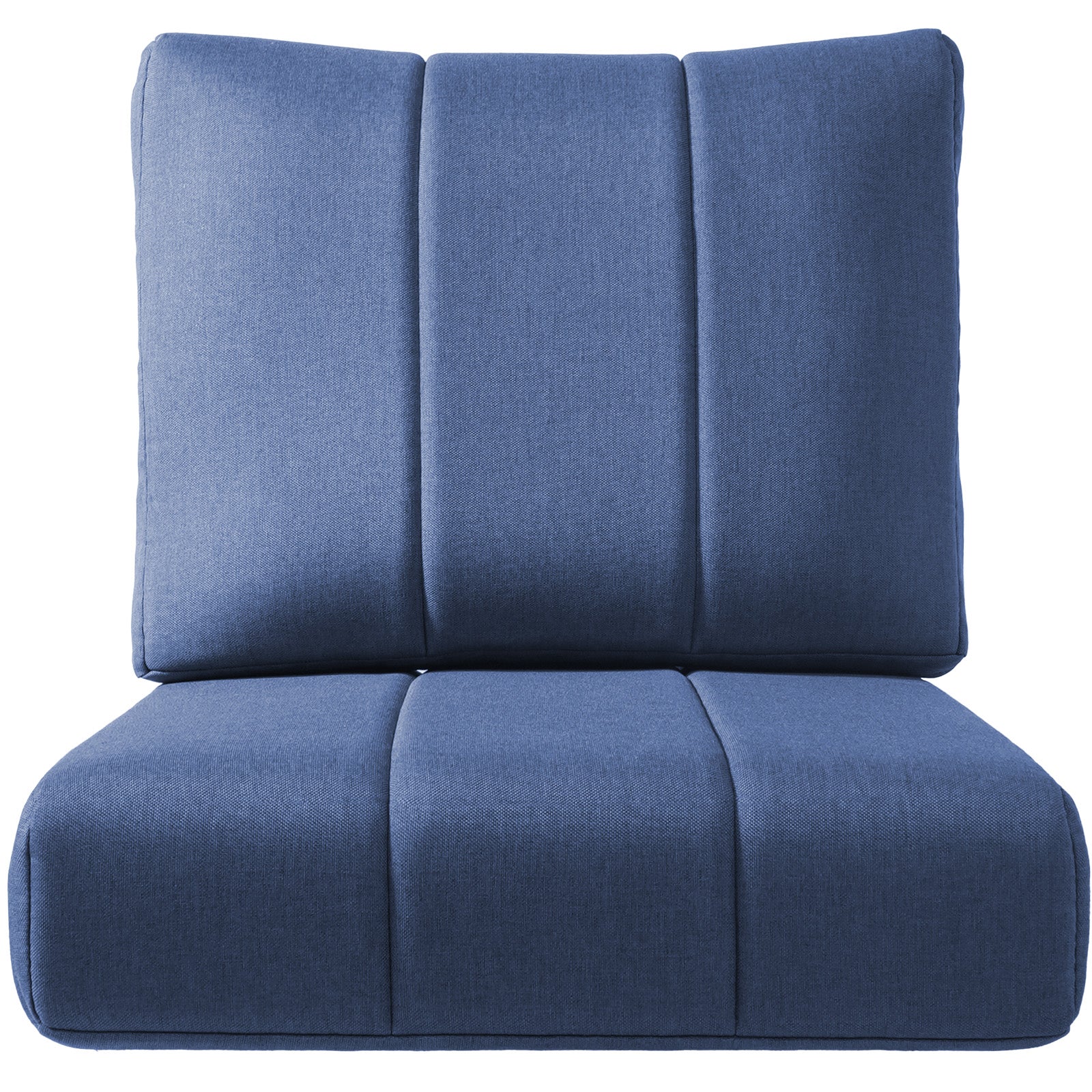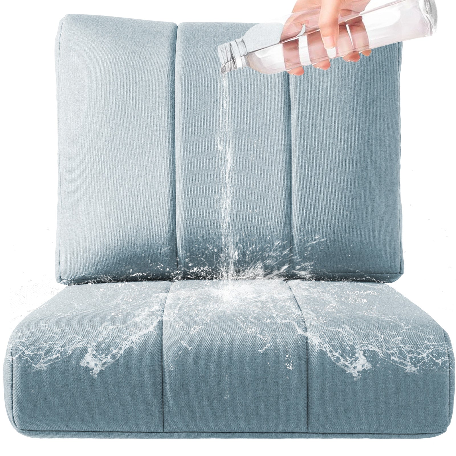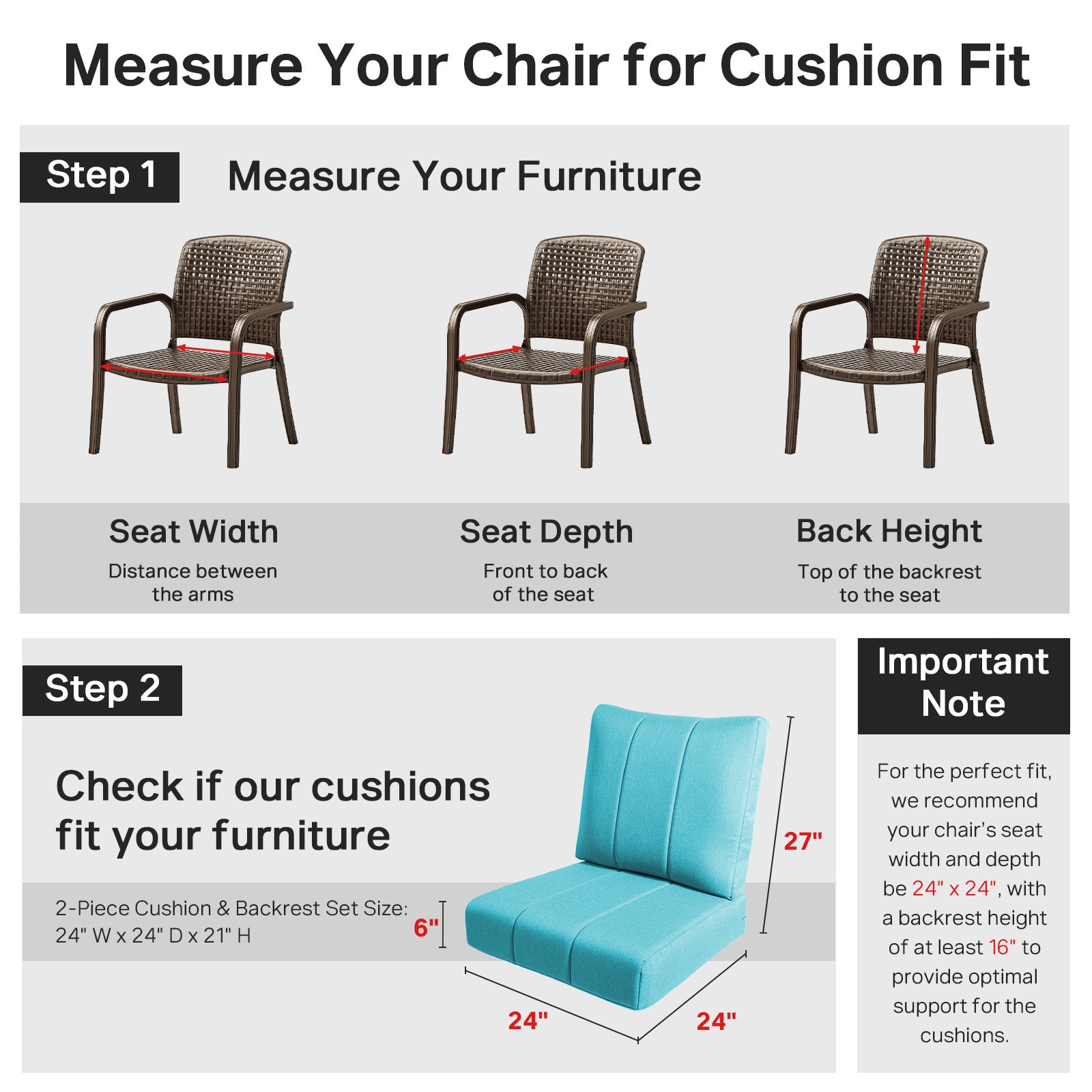 Includes one (1) 24" x 24" x 6" seat cushion and one (1) 24" x 21" x 5.9" back cushion. Available in eight versatile colors—Blue, Baby Blue, Beige, Orange, Red, Teal, Peacock Green, and Grey—to complement patios, porches, and garden spaces with ease.