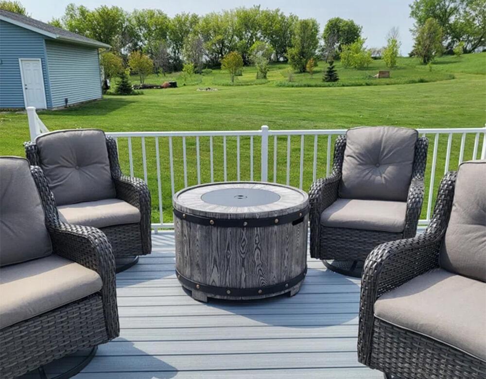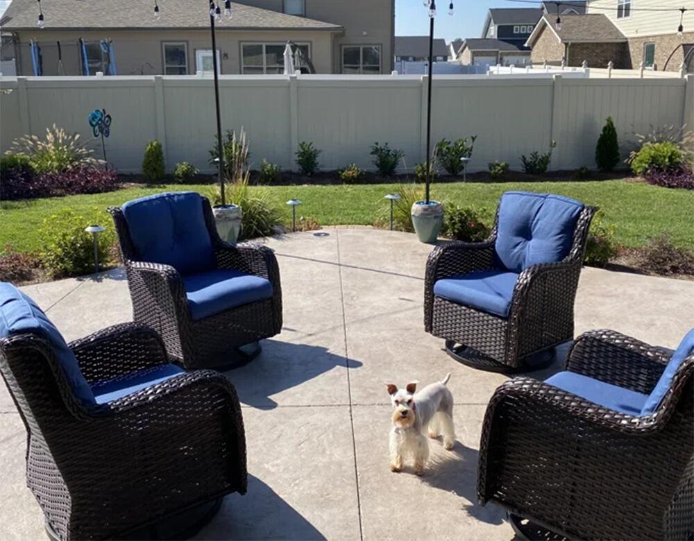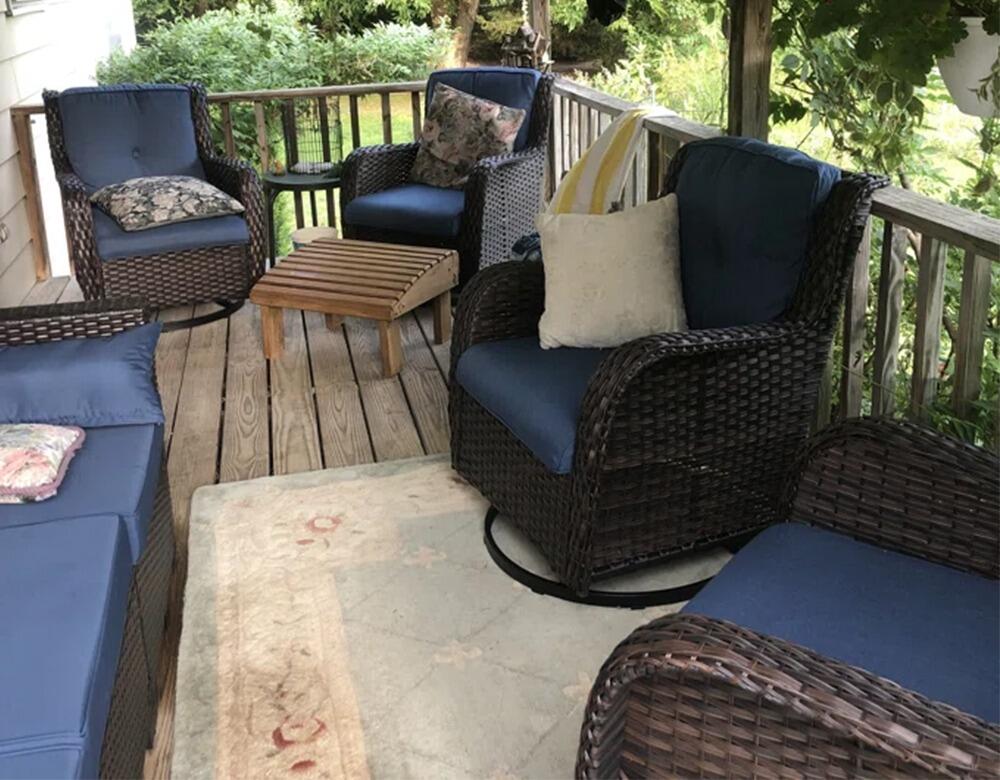 We put this furniture on a reclaimed brick patio. The patio is large and I was concerned about the furniture being too small. It is not! It was relatively simple to put together. It seems to be sturdy and looks beautiful. I looked at a lot of patio furniture, both online and in the big box stores. After reading the reviews on this set, I ordered it during Prime Days and I am glad I did. I feel like I got a lot of bang for my buck!