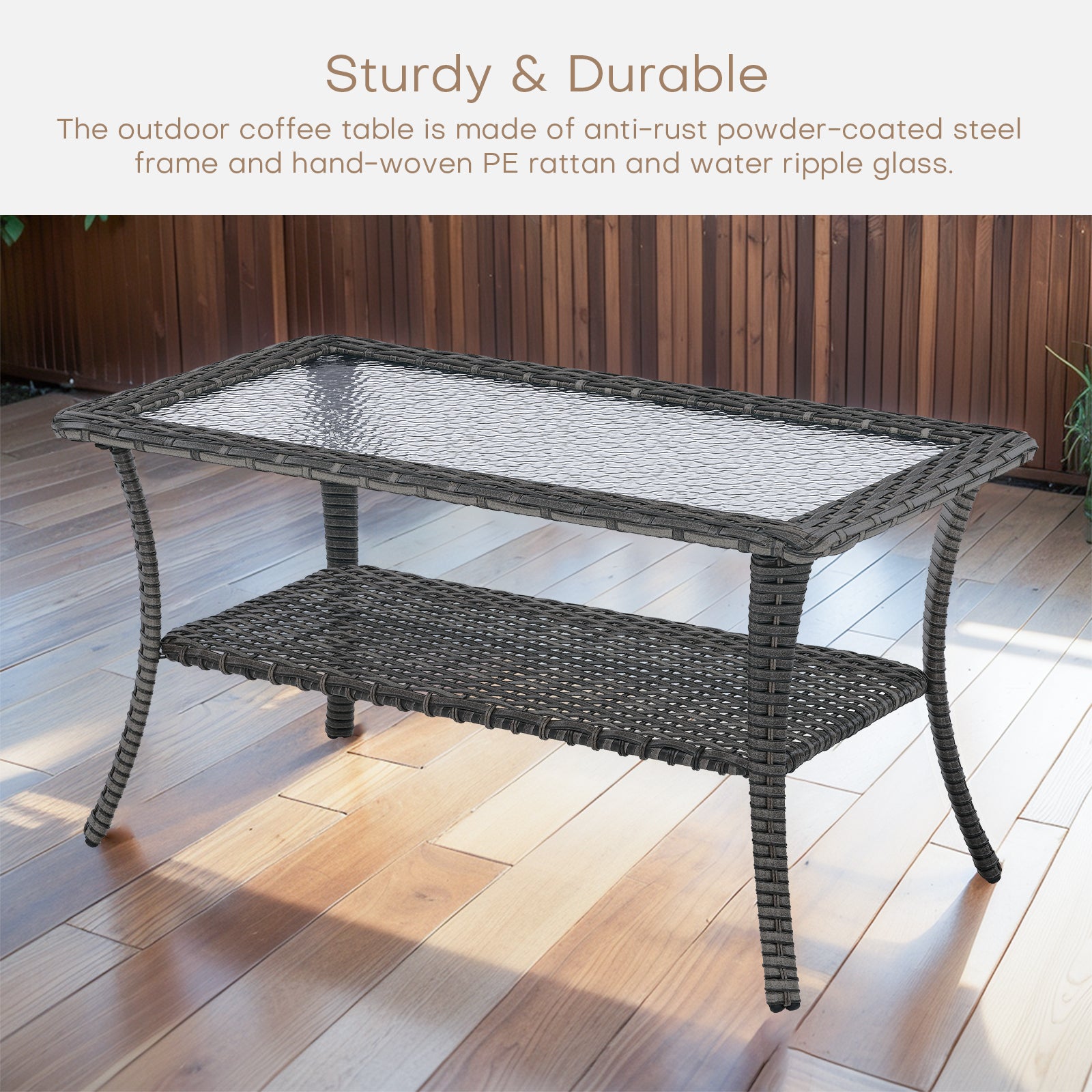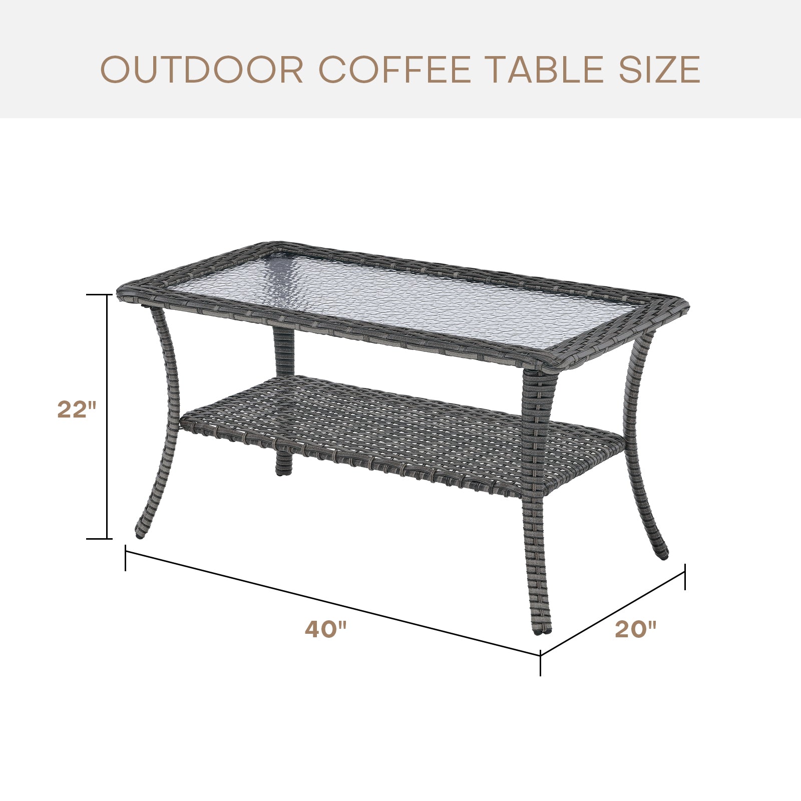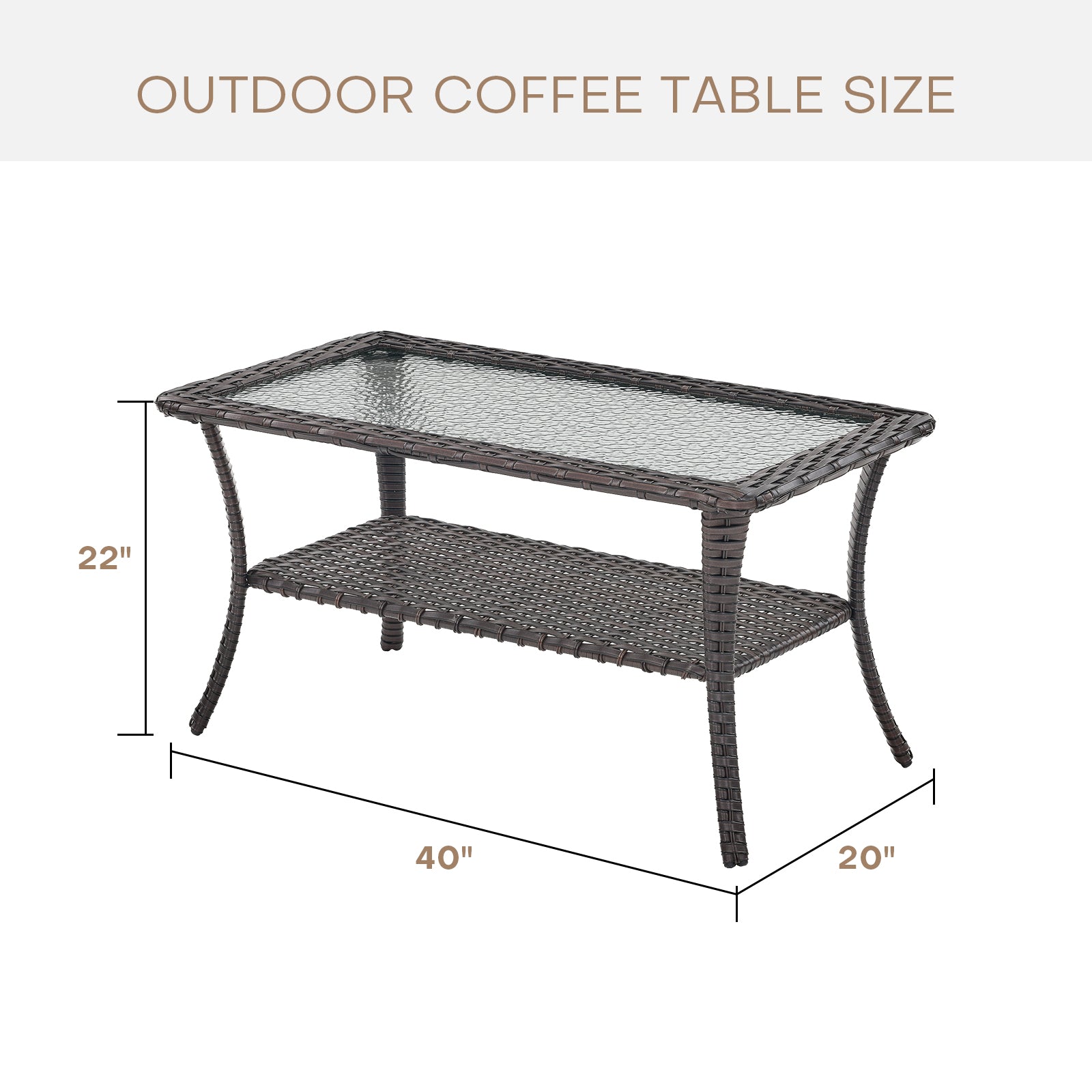 Elevate your outdoor space with this handwoven wicker coffee table, featuring a natural look and practical design. Measuring 40"L x 22"W x 20"H, this patio coffee table includes a ripple-style tempered glass top and a convenient lower storage shelf. Whether placed on a balcony, porch, or in a sunroom, its durable structure and natural charm make it the perfect centerpiece for any outdoor lounge setup.