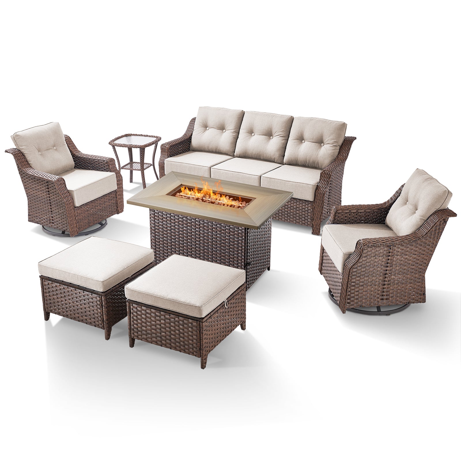 Enjoy cozy moments outdoors with the Belord 7-piece patio conversation set, thoughtfully designed for comfort, versatility, and durability. This complete set includes two swivel rocker chairs, one 3-seat sofa, two ottomans, two tempered glass-top side tables, and a 41-inch propane fire pit table—ideal for relaxing, socializing, or enjoying a warm fire on your patio, balcony, or backyard.