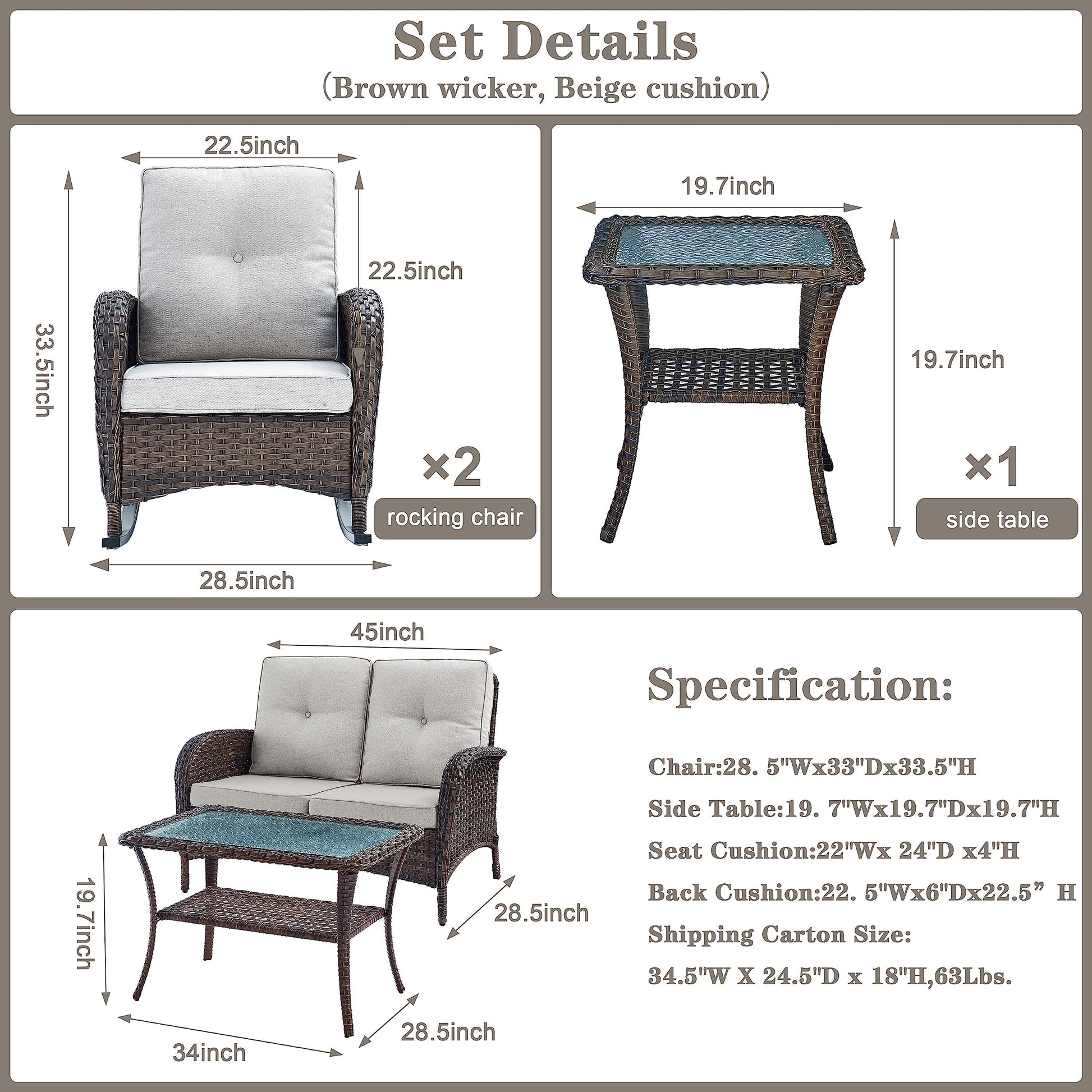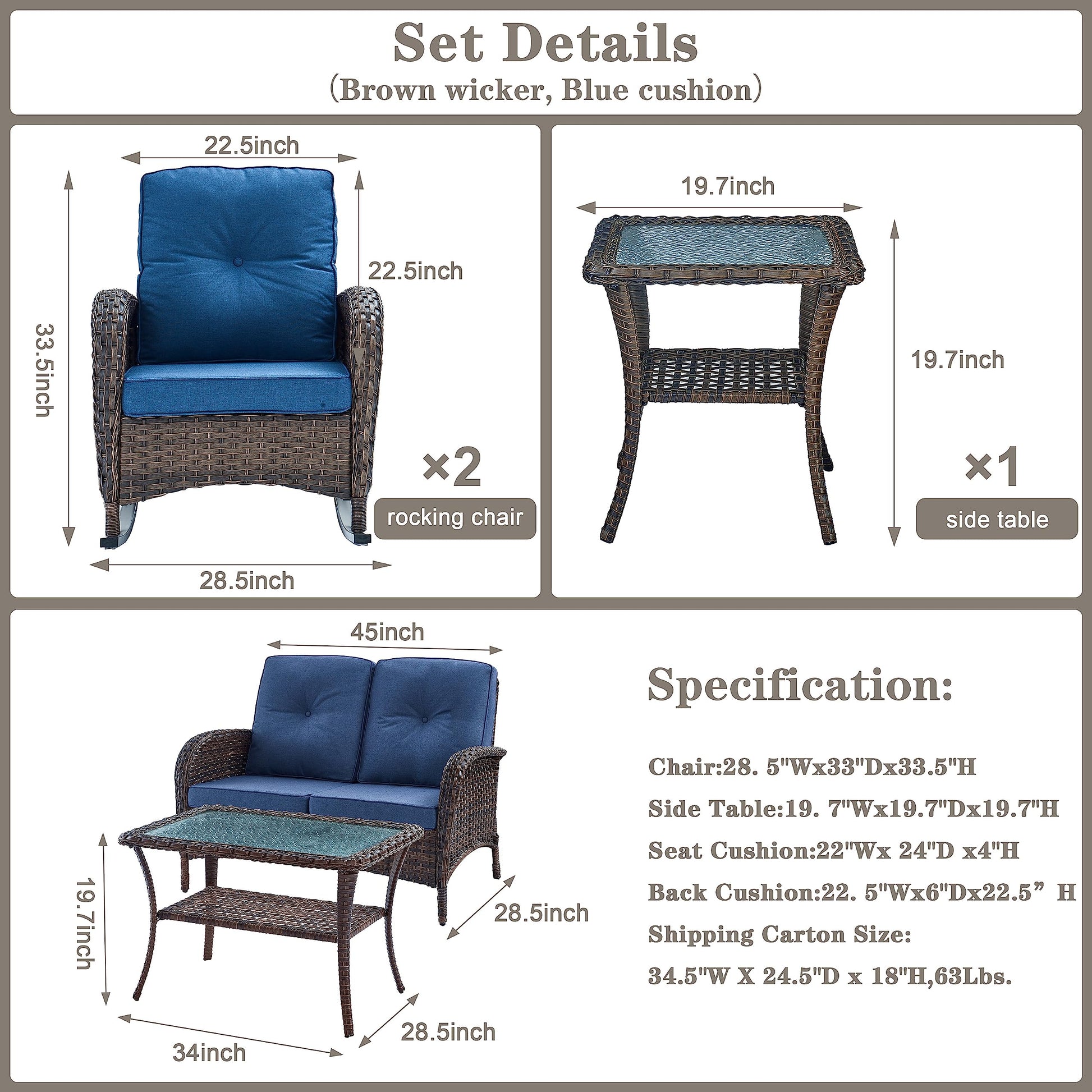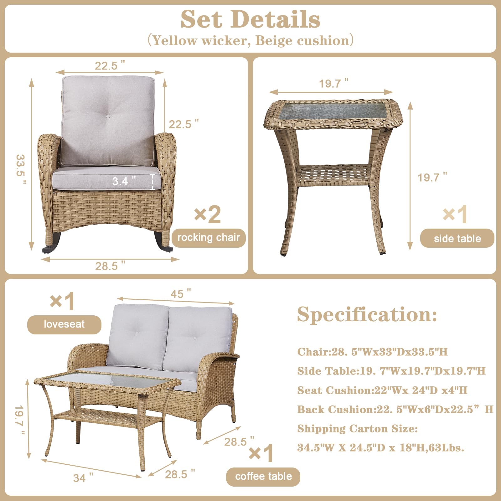 The 5-piece patio furniture rocking chair set is the best choice for your patio, backyard or other outdoor space for your chatting needs. This 5 pieces patio furniture set includes a total of 2 outdoor rocking chairs, 1 2-seater loveseat, 1 glass coffee table and 1 glass side table with removable and washable cushions.
