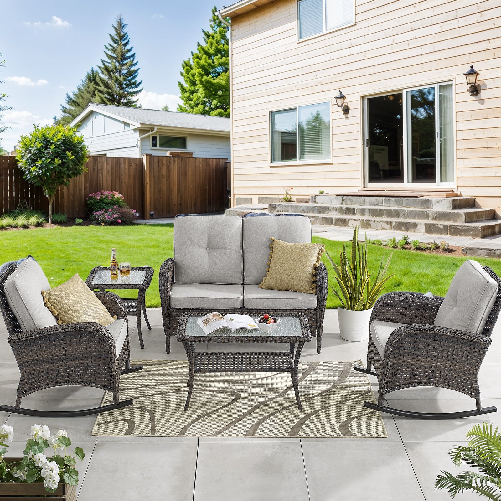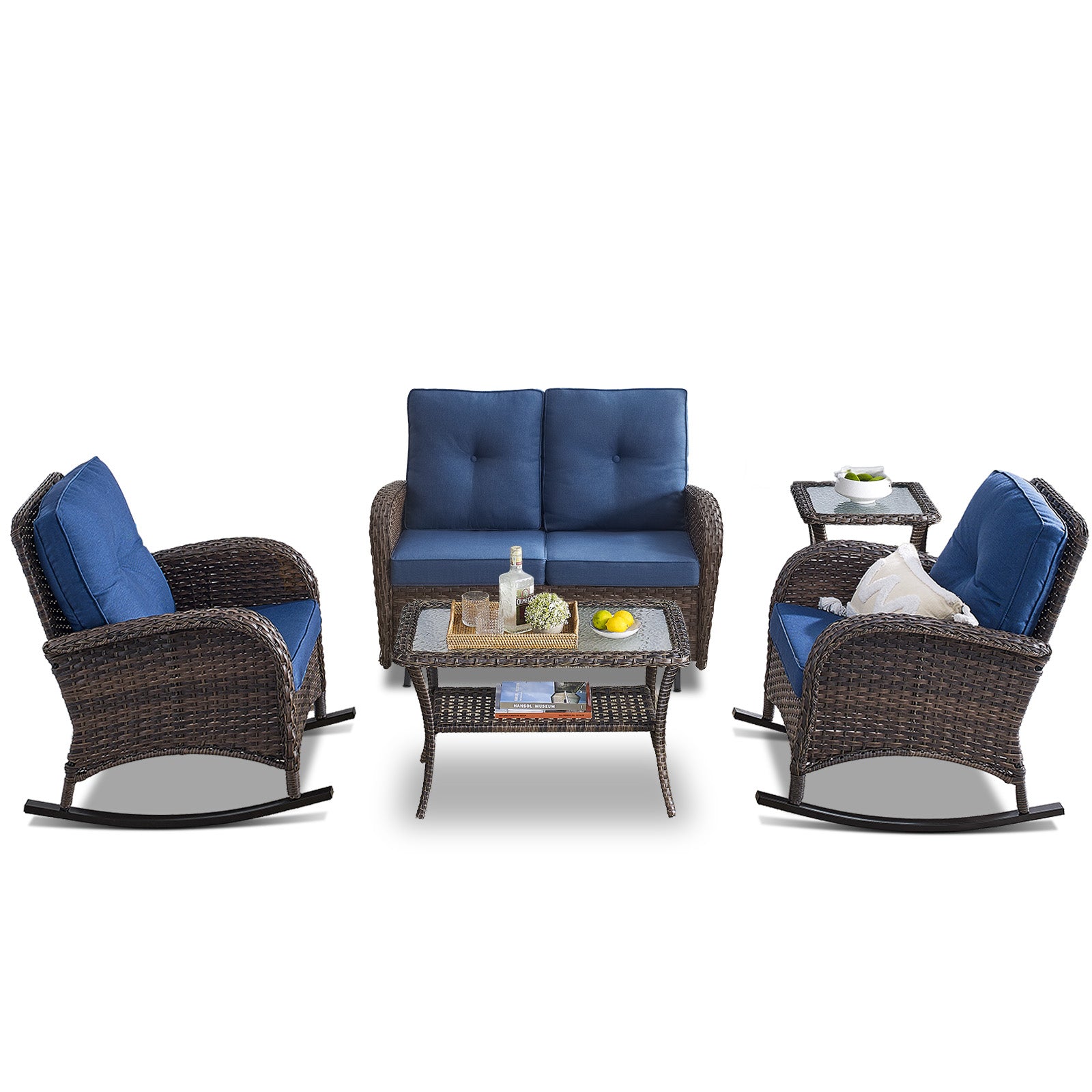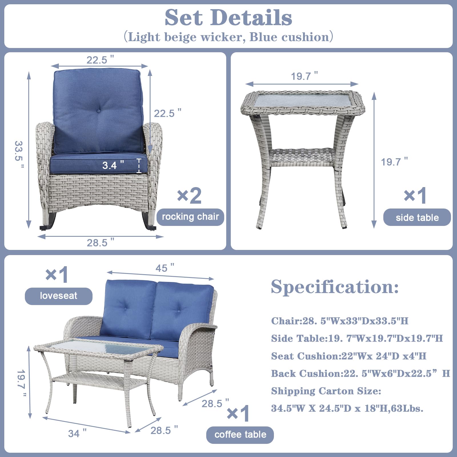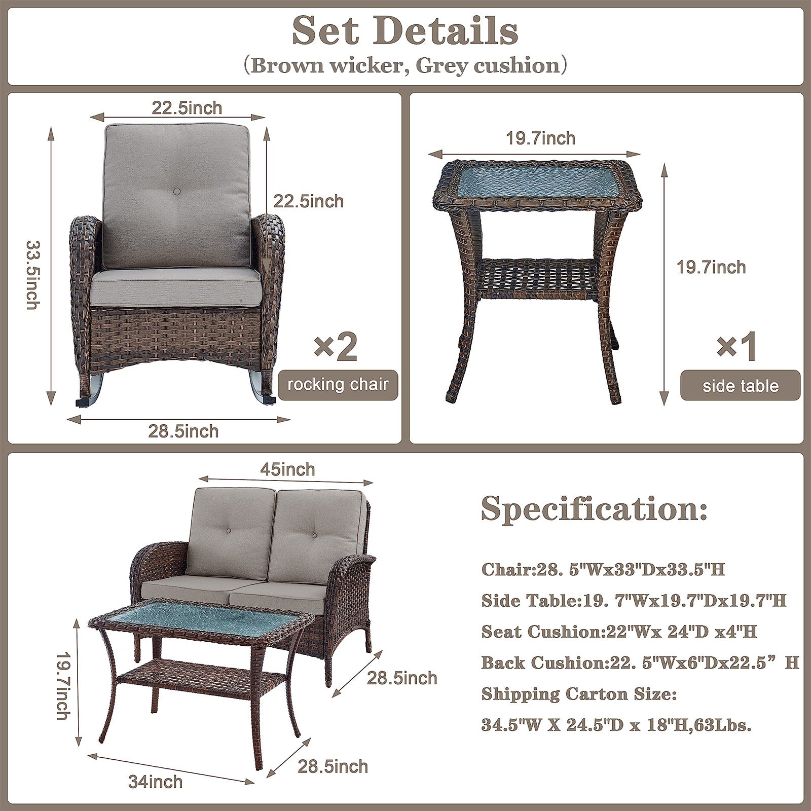 The 5-piece patio furniture rocking chair set is the best choice for your patio, backyard or other outdoor space for your chatting needs. This 5 pieces patio furniture set includes a total of 2 outdoor rocking chairs, 1 2-seater loveseat, 1 glass coffee table and 1 glass side table with removable and washable cushions.