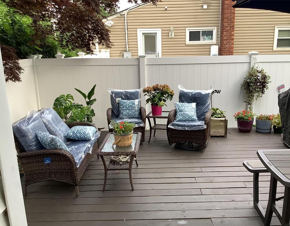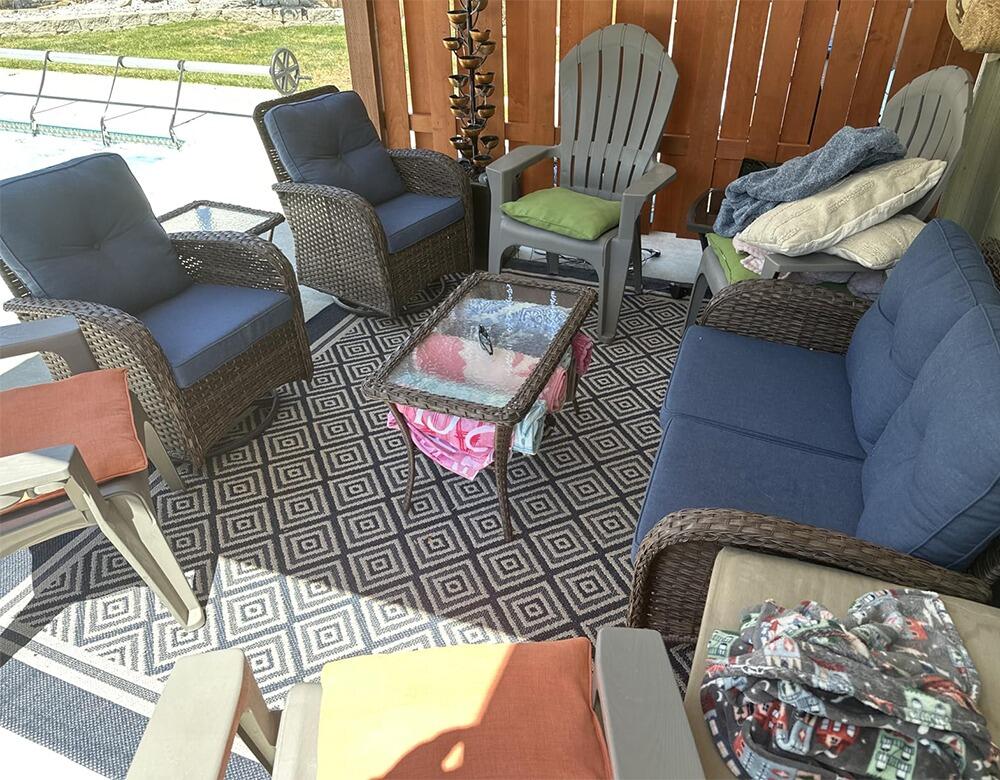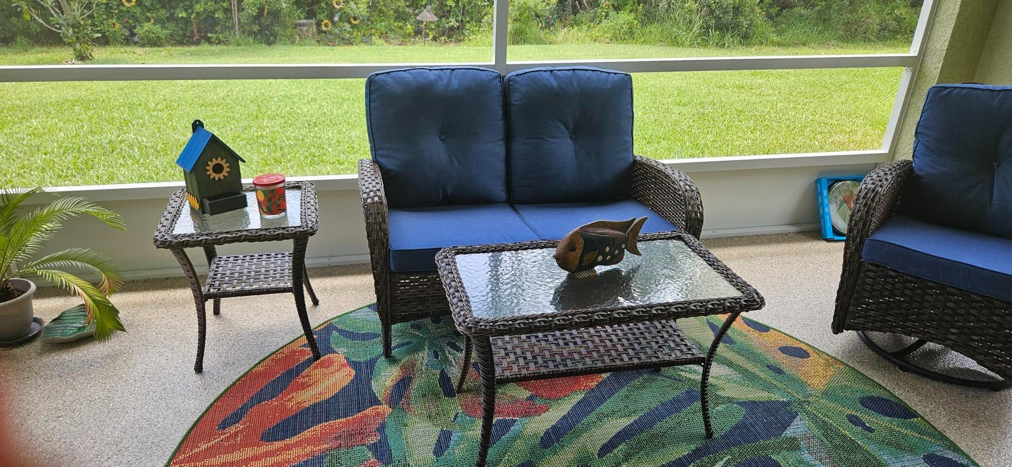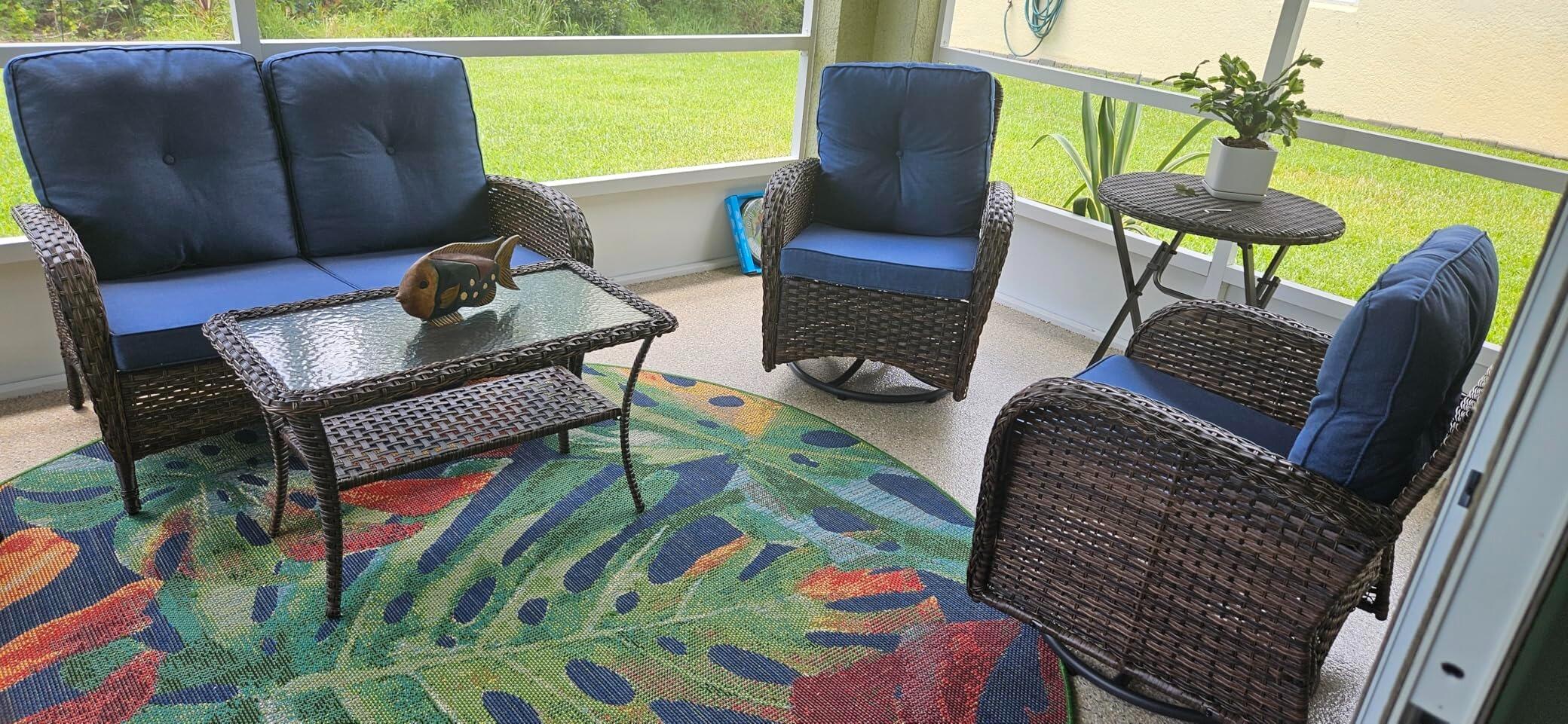 The 6 pcs patio furniture set includes 2 wicker rocking chairs, 1 couch, 2 ottomans and 1 glass top side table. Patio Rocking chair dimension W28.5*L33*H33.5 inches, weight capacity 300 lbs. Patio glass side table dimension W19.7*L19.7*H19.7 inches, weight capacity 50 lbs. You'll love the addition of this charming patio rocking chair for porch that will make a big difference in your outdoor relaxation space.