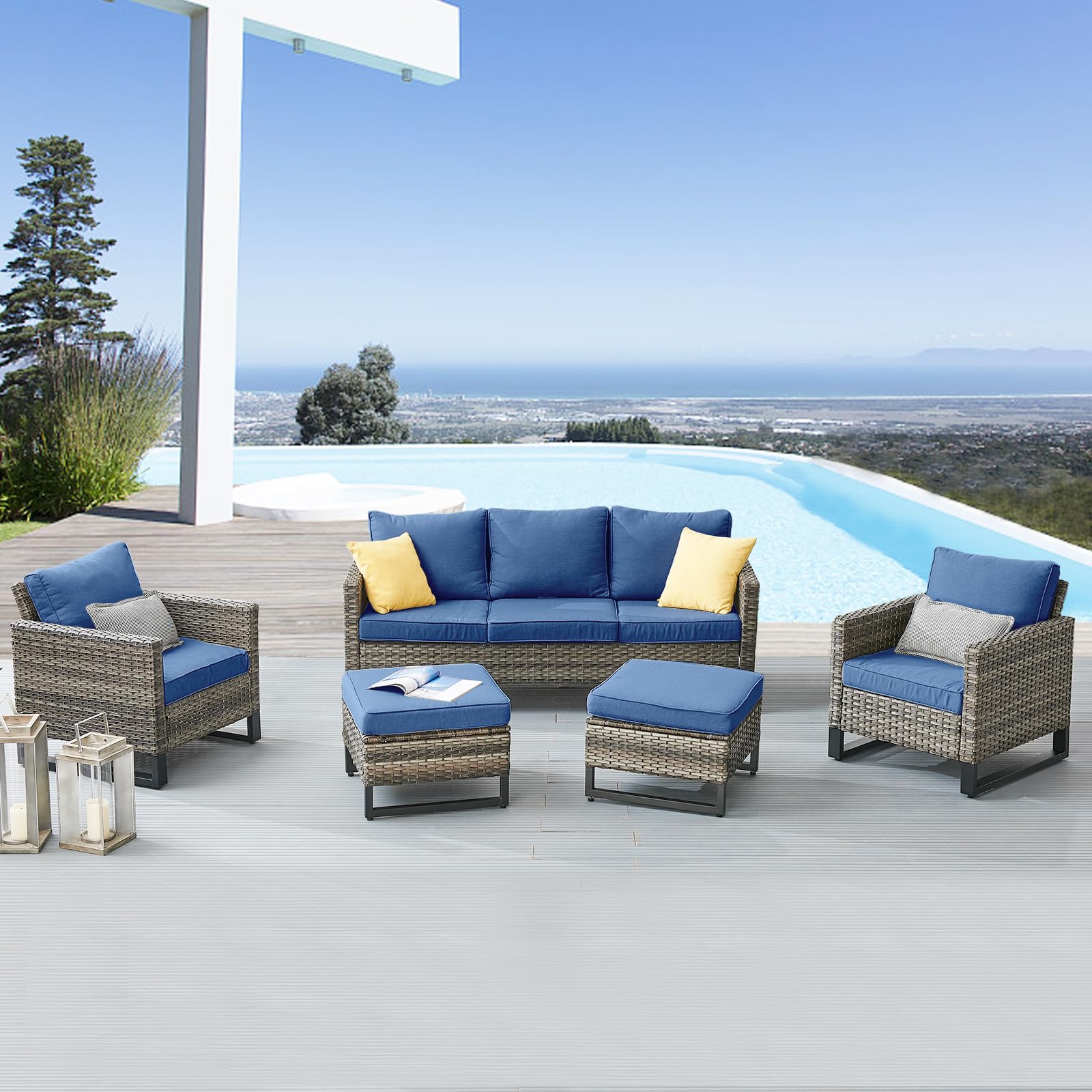 This Belord 5 piece outdoor furniture set include 2 wicker patio chairs, 1 outdoor wicker sofa, 2 outdoor rattan ottomans, the outdoor patio wicker chairs have an 18.5" high back and 25.5" deep seat (cushion thickness not included), the oversized patio chair offers plenty of room for your body, 3.4" wide arms for better arm support and a maximum weight capacity of 350 lbs, perfect for relaxing in the warm sunshine.