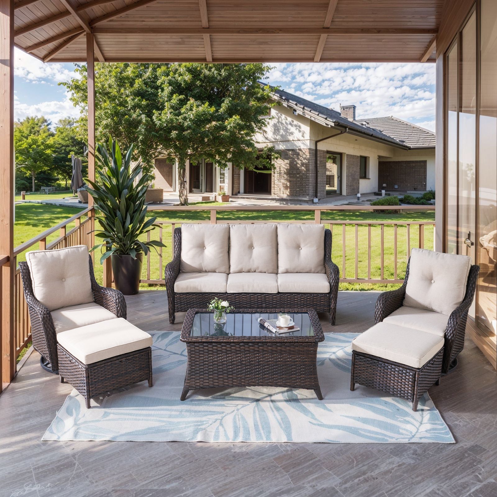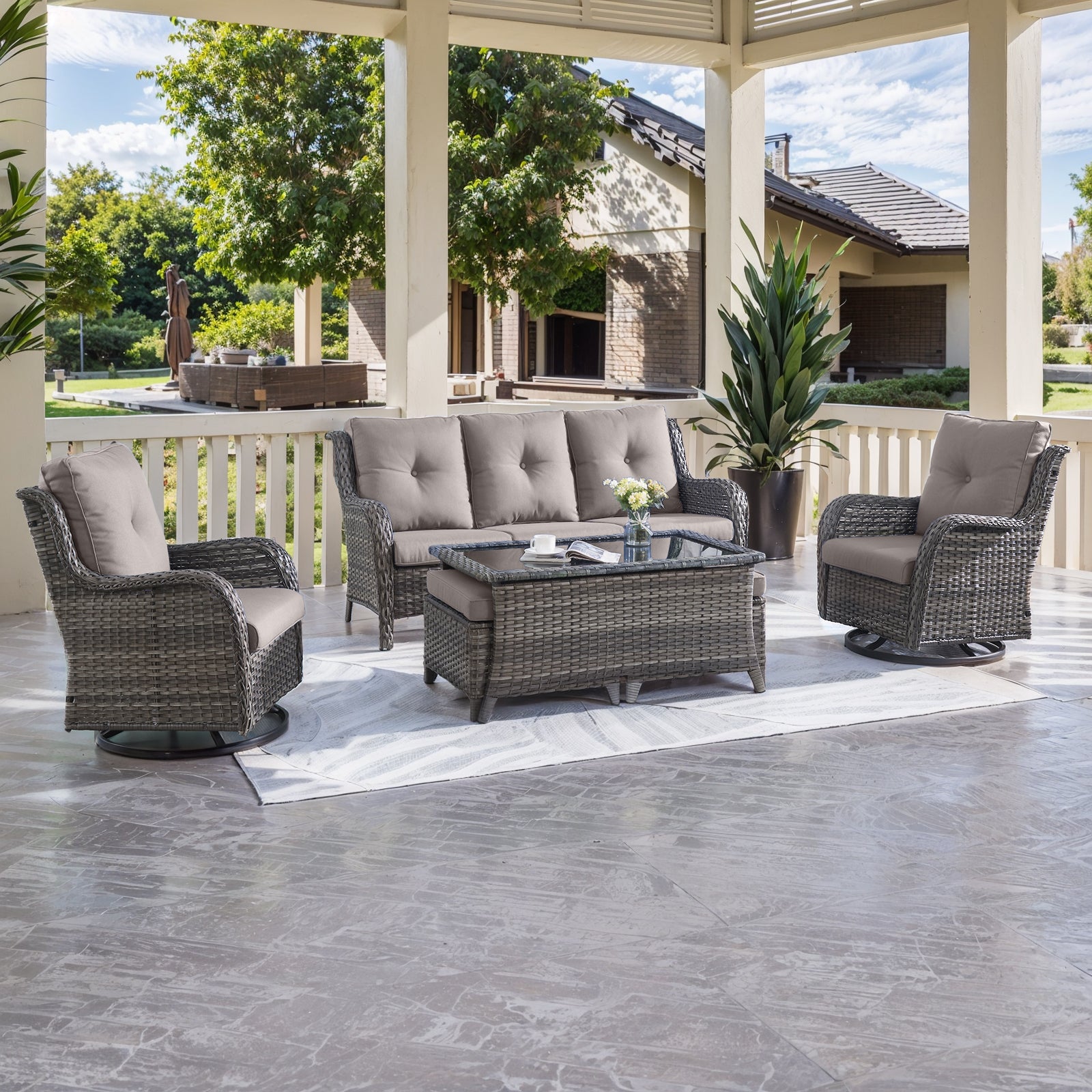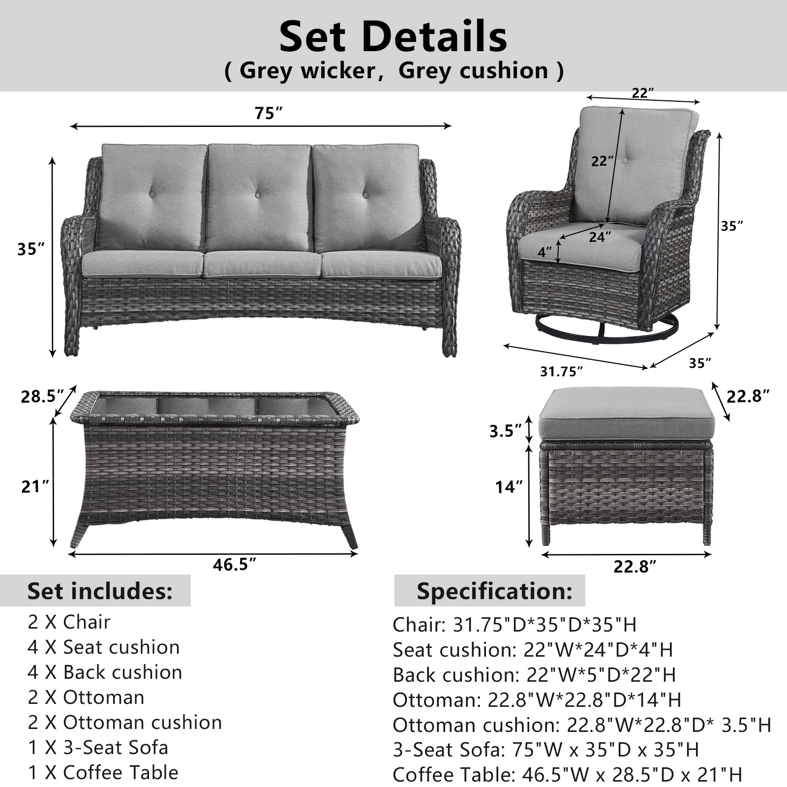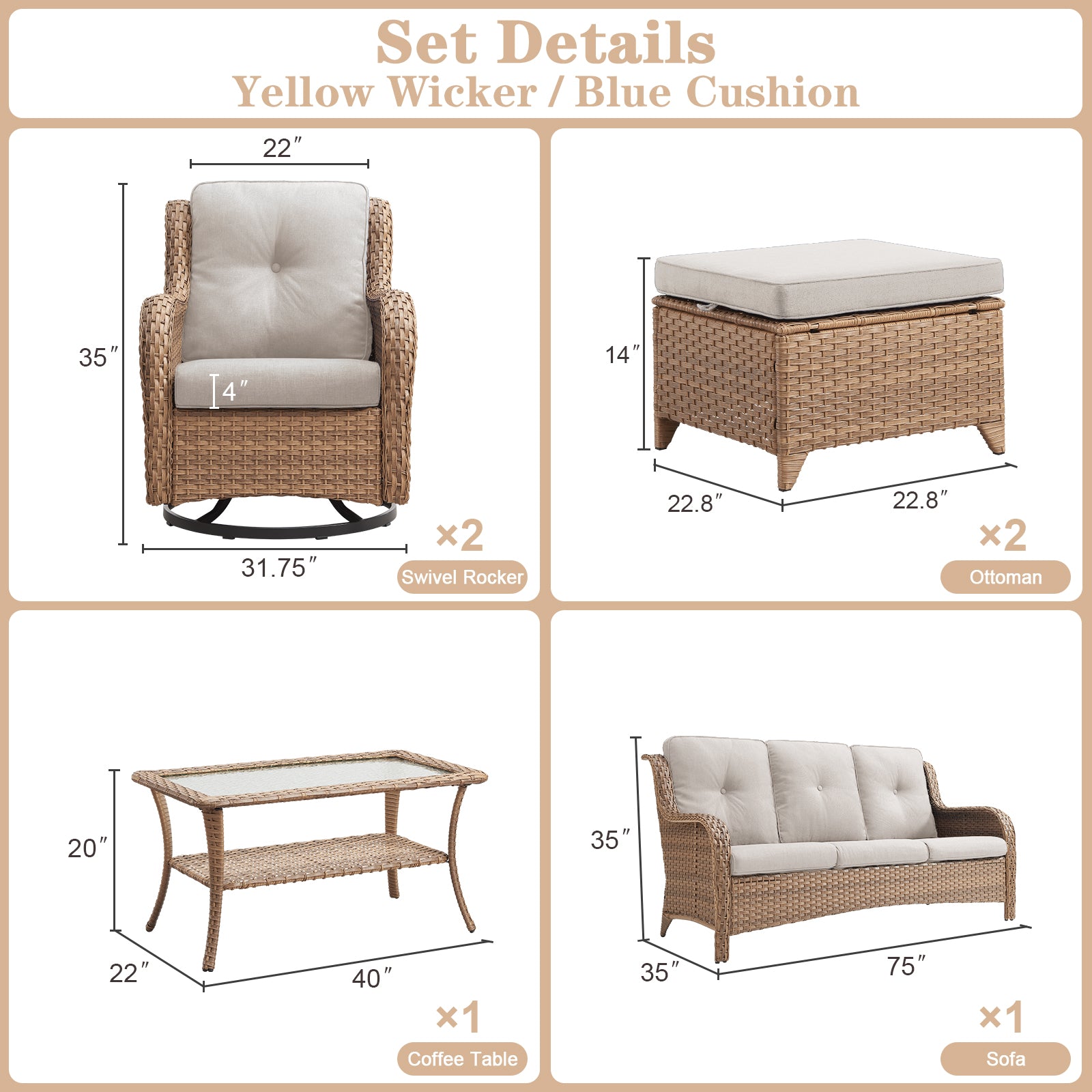 The NTC Series 6-Piece Patio Furniture Set includes 2 swivel glider chairs, 2 ottomans, 1 sofa, and 1 glass top coffee table—ideal for creating a versatile and comfortable outdoor seating area. The ottomans serve multiple purposes, functioning as leg rests, small stools, or even side tables. Designed with both style and functionality in mind, this set is perfect for patios, porches, decks, poolside, balconies, and gardens. The swivel chairs support up to 350 lbs and feature a smooth 360° rotation and gentle gliding motion for enhanced relaxation.