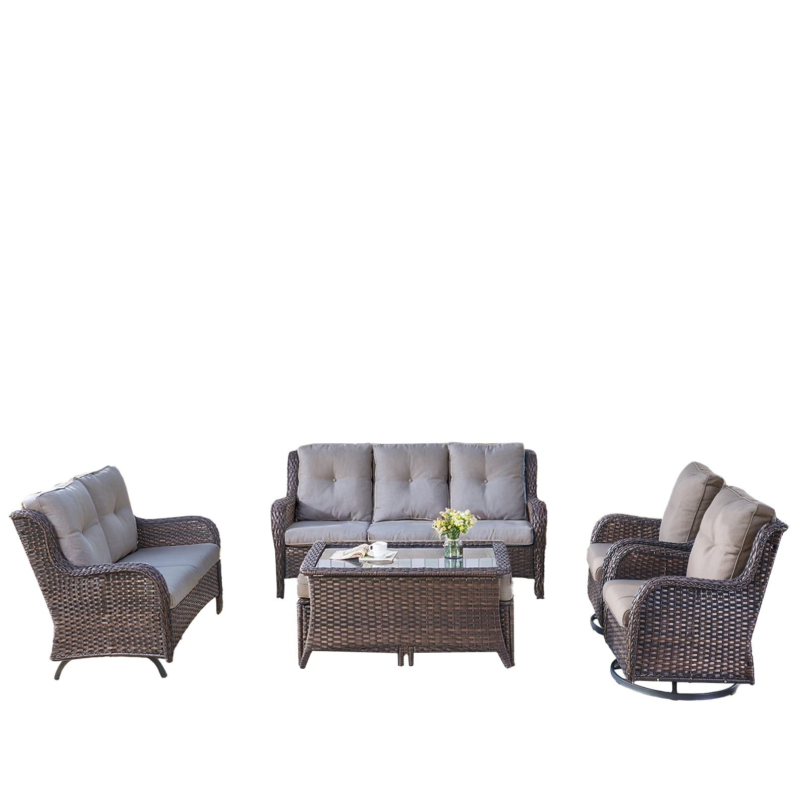 3-seat sofa & Glider Loveseat & Swivel Glider Chair & Coffee Table & Ottoman: PE Wicker & Steel Frame