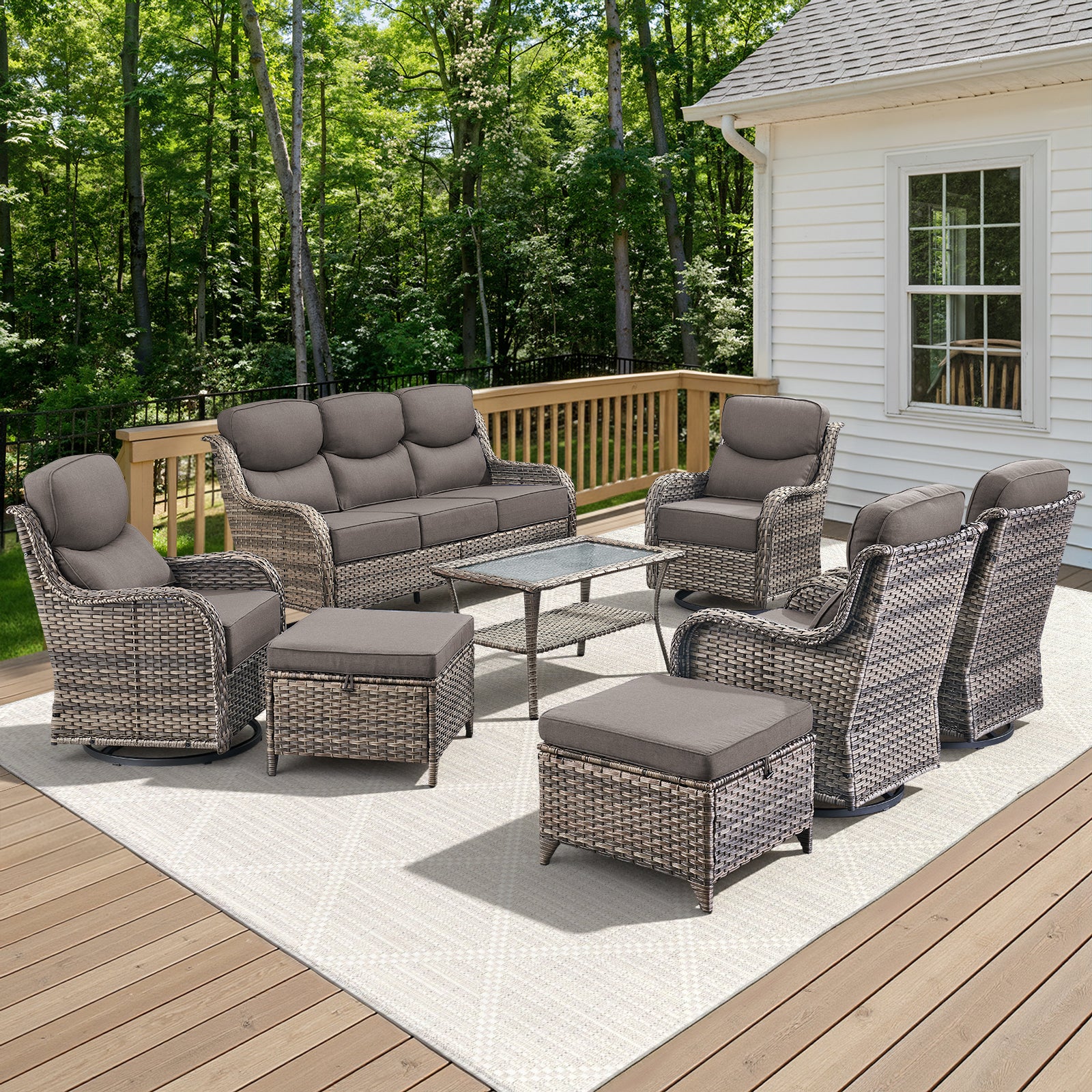 3-Seat Sofa & Swivel Glider Chair & Ottomans & Coffee Table: PE Wicker & Steel Frame