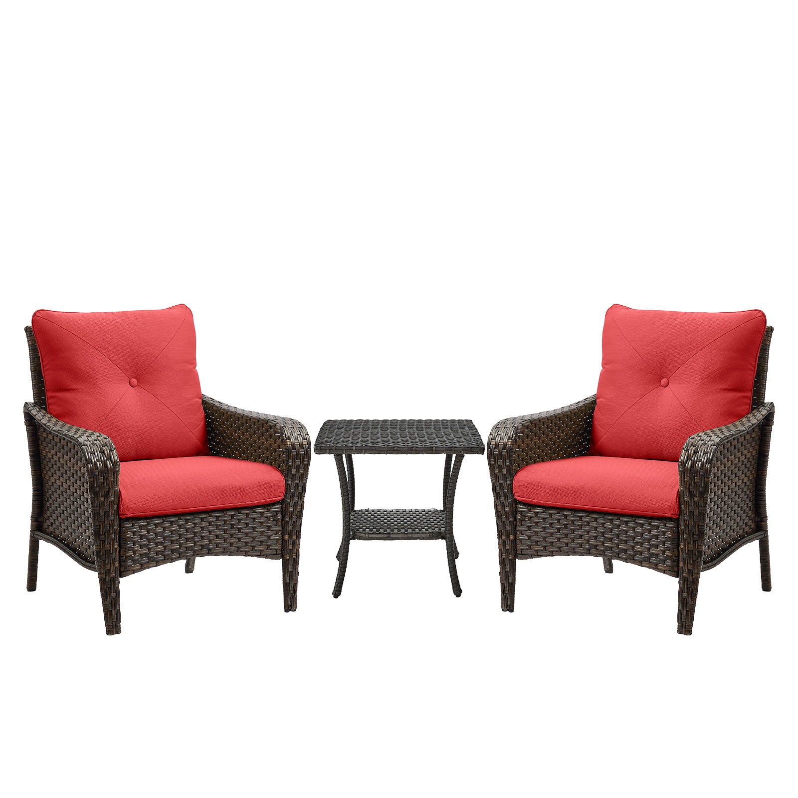 Add charm and comfort to your outdoor space with this uniquely designed 3-piece patio bistro set. Featuring two hand-woven PE wicker armrest chairs and a matching side table, the set showcases a retro-inspired curved skirt design that stands out from typical patio furniture. With deep, low seating and thick, plush cushions, these chairs offer a luxurious lounging experience. Built with durable, weather-resistant materials, this set is perfect for patios, balconies, porches, gardens, or poolside relaxation.