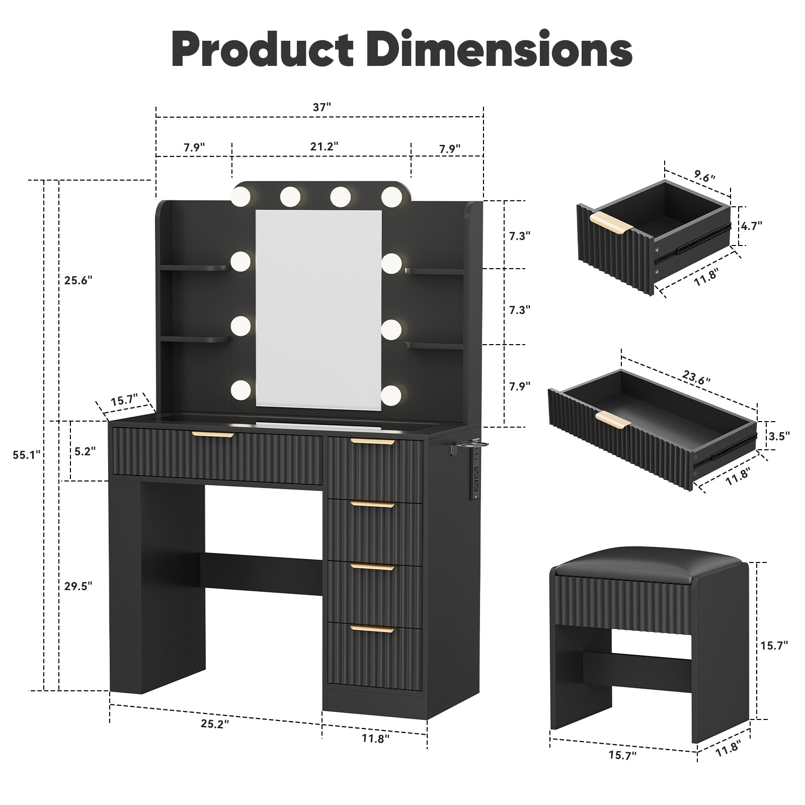 Save 50% - 37" Fluted Makeup Vanity Desk with LED Mirror, 5 Drawers & Glass Top, Vanity Table with Cabinet, Chair and Charging Station, 3 Light Modes for Bedroom