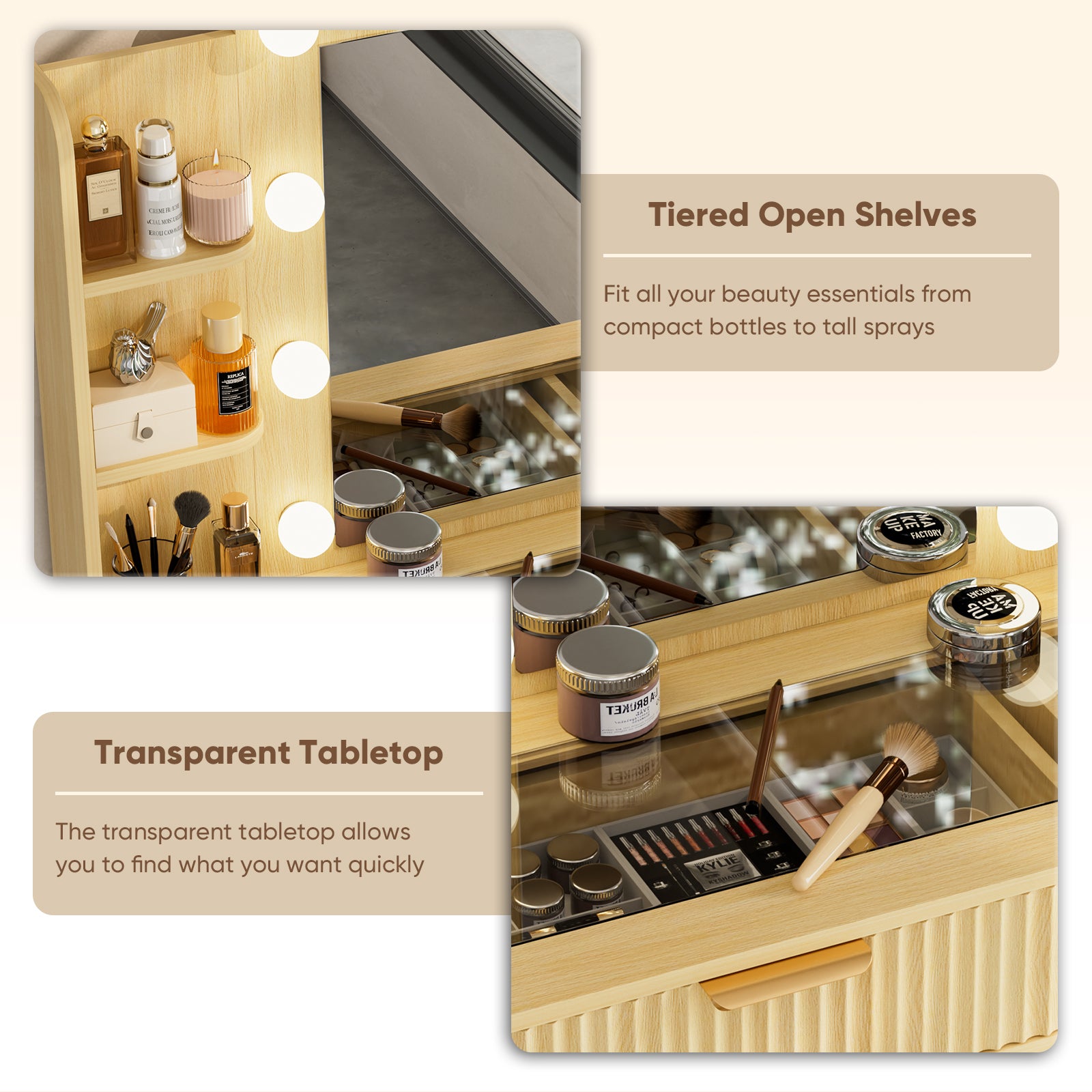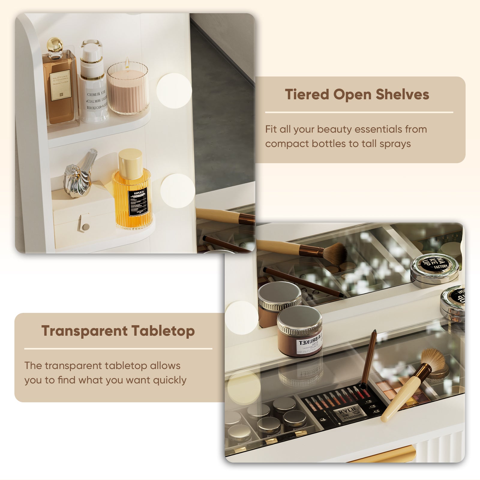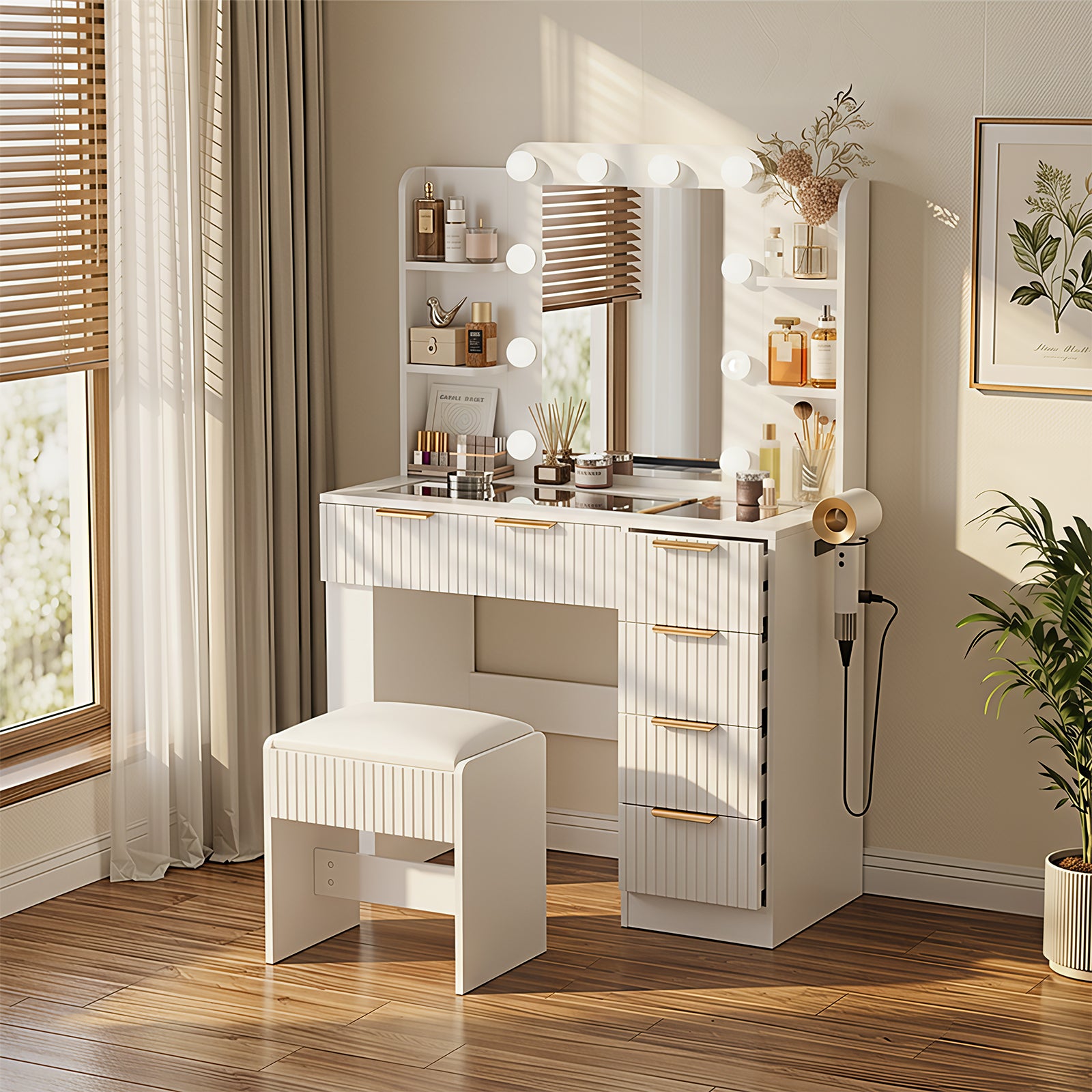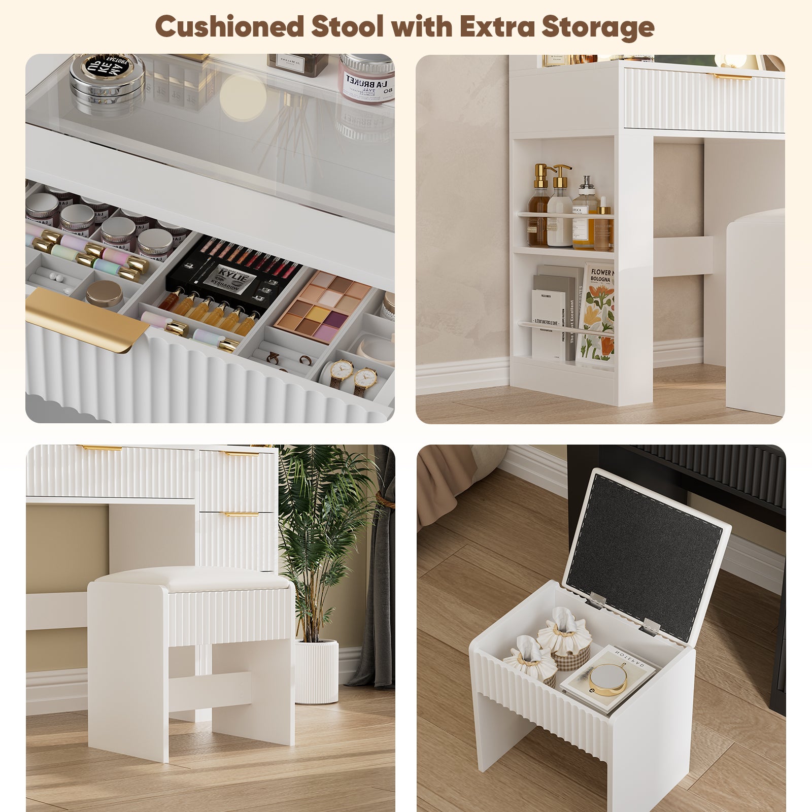 Upgrade your beauty routine with this elegant and functional makeup vanity desk, designed to combine ample storage, professional lighting, and modern style. Featuring a glass tabletop, fluted drawer fronts with gold handles, and a built-in charging station, this vanity keeps all your cosmetics, jewelry, and tools perfectly organized while adding a touch of luxury to your bedroom or dressing area. Complete with a comfortable vanity chair, it delivers a refined and convenient makeup experience every day.