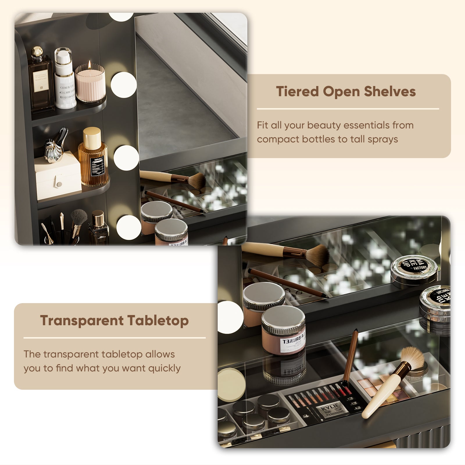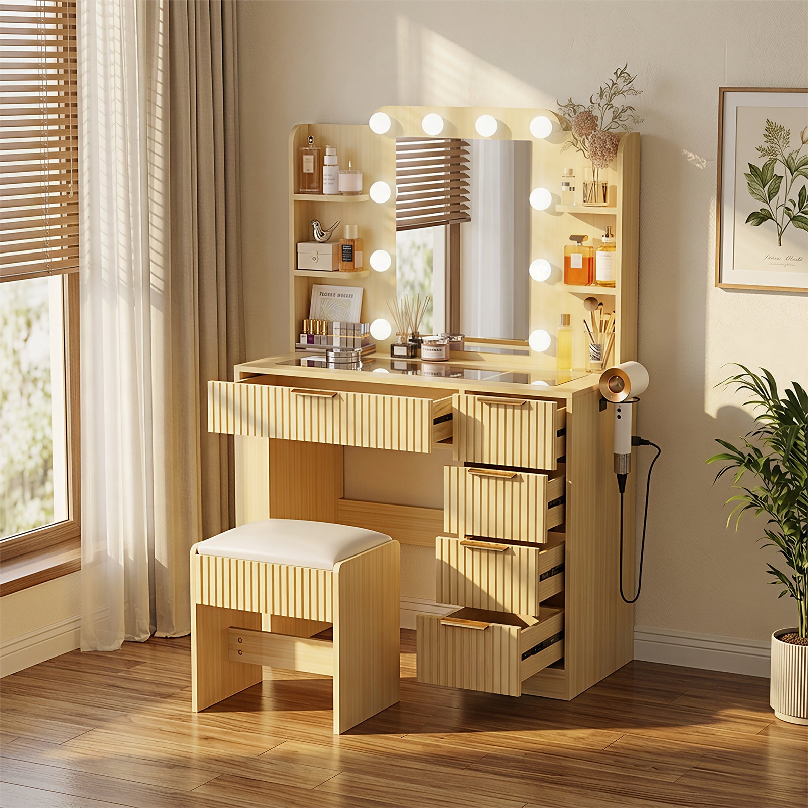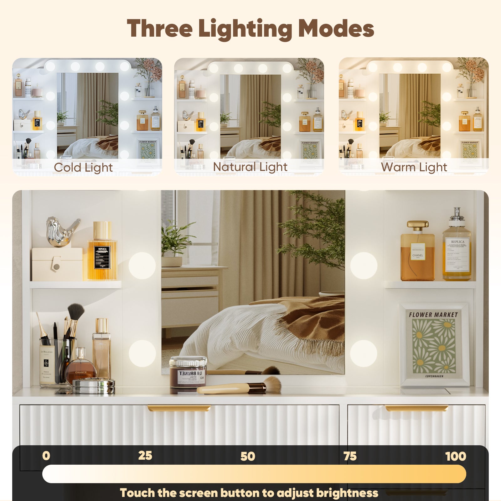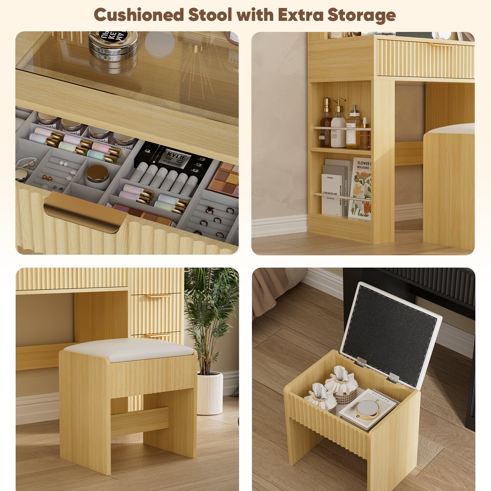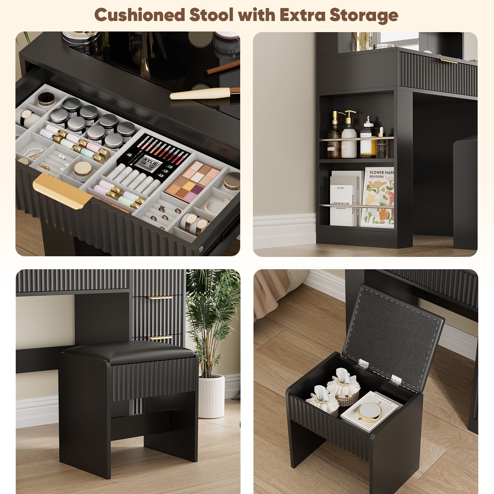 Upgrade your beauty routine with this elegant and functional makeup vanity desk, designed to combine ample storage, professional lighting, and modern style. Featuring a glass tabletop, fluted drawer fronts with gold handles, and a built-in charging station, this vanity keeps all your cosmetics, jewelry, and tools perfectly organized while adding a touch of luxury to your bedroom or dressing area. Complete with a comfortable vanity chair, it delivers a refined and convenient makeup experience every day.