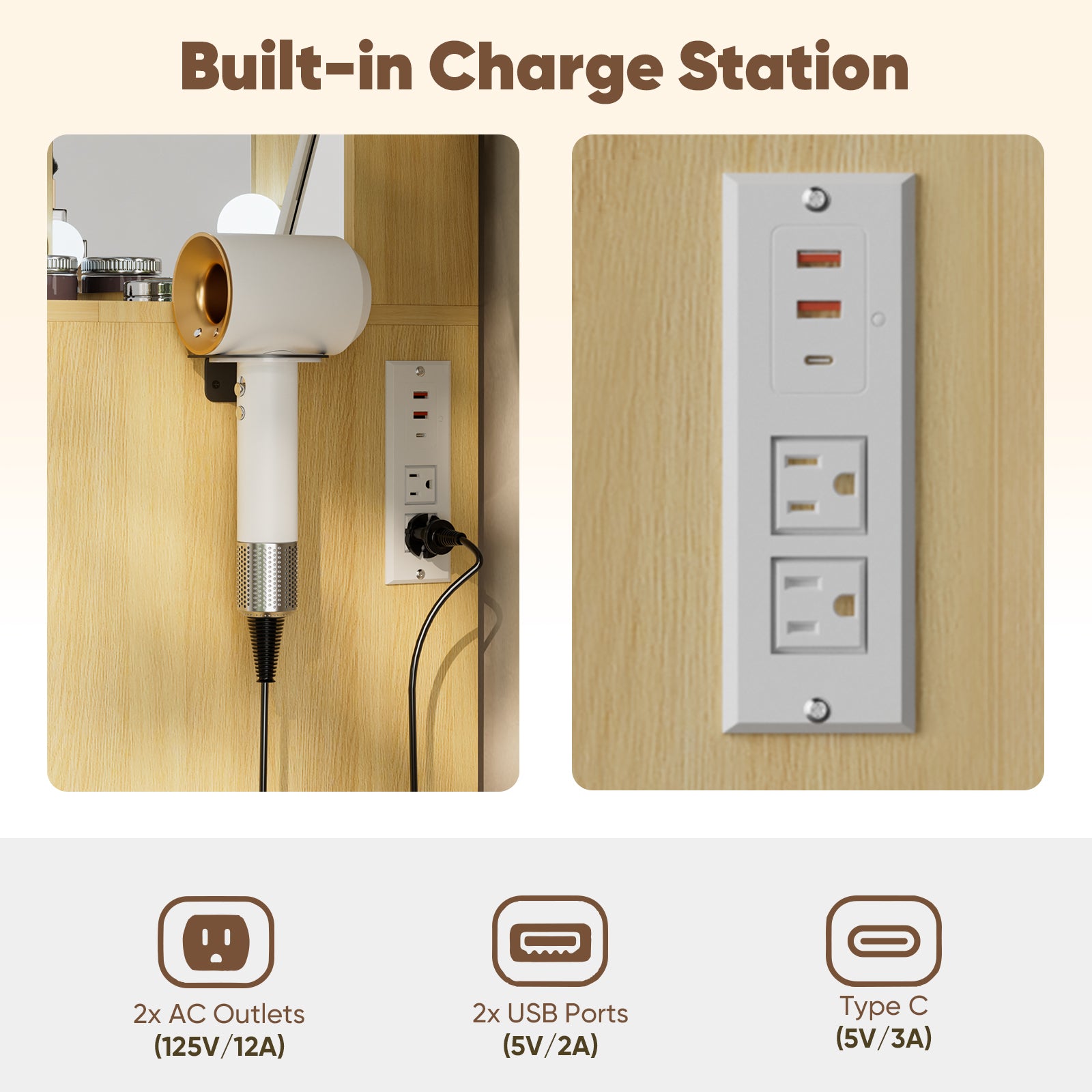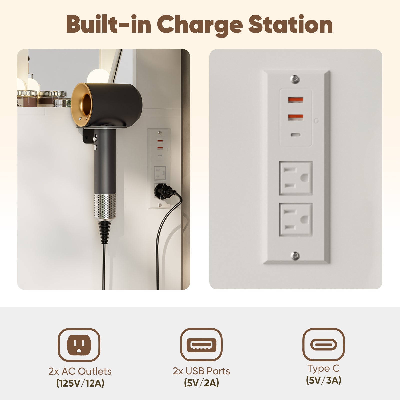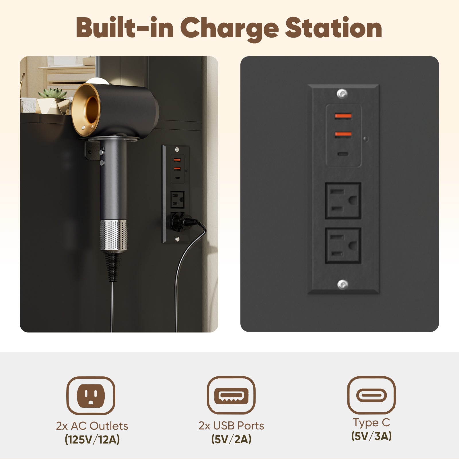 Features 2 AC outlets and 2 USB ports, making it easy to power hair dryers, curling irons, and charge phones or tablets—all within arm’s reach.