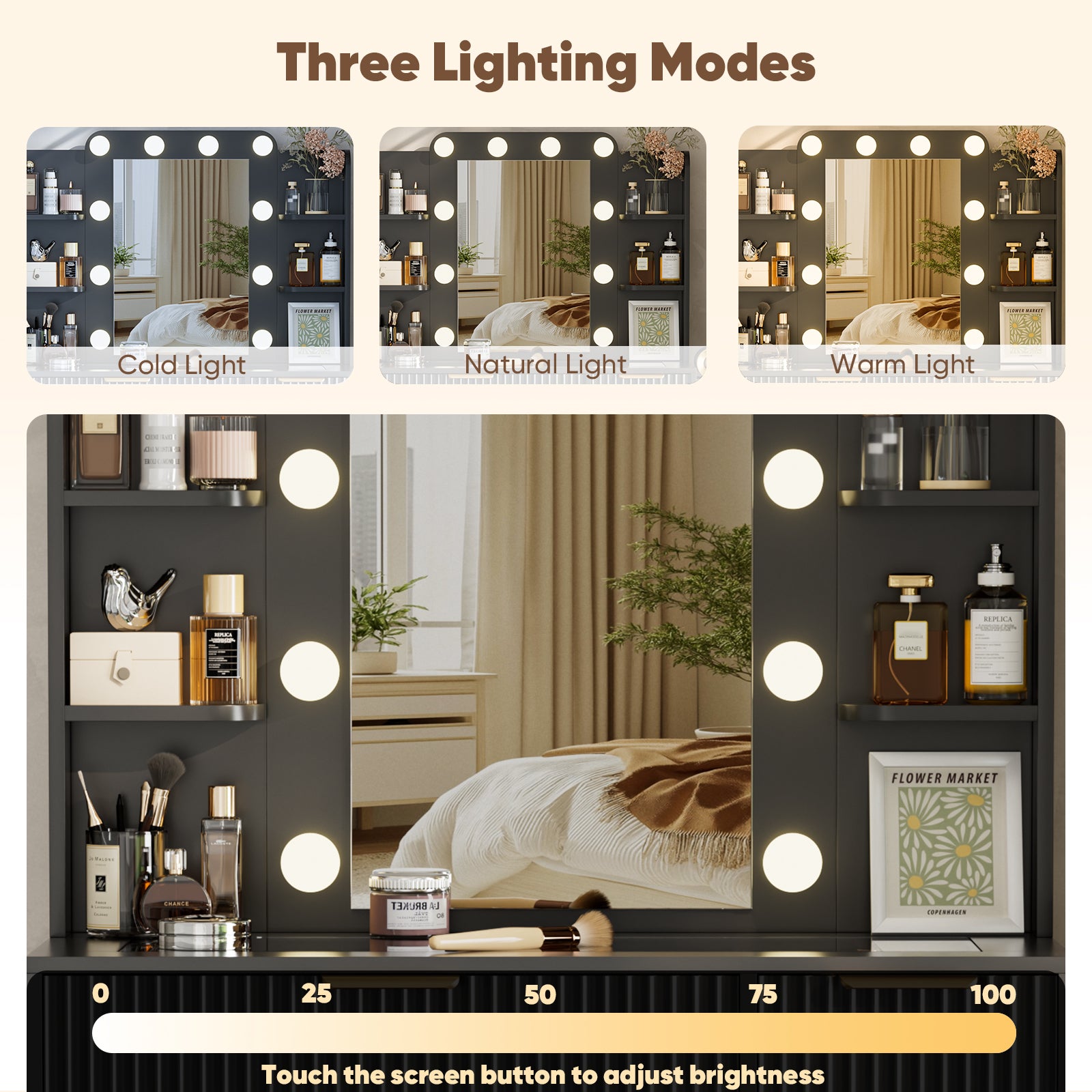 Equipped with a large mirror and 9 LED bulbs, offering warm, natural, and cool light modes. Adjustable brightness allows you to create the ideal lighting for makeup application, filming, live streaming, or selfies.
