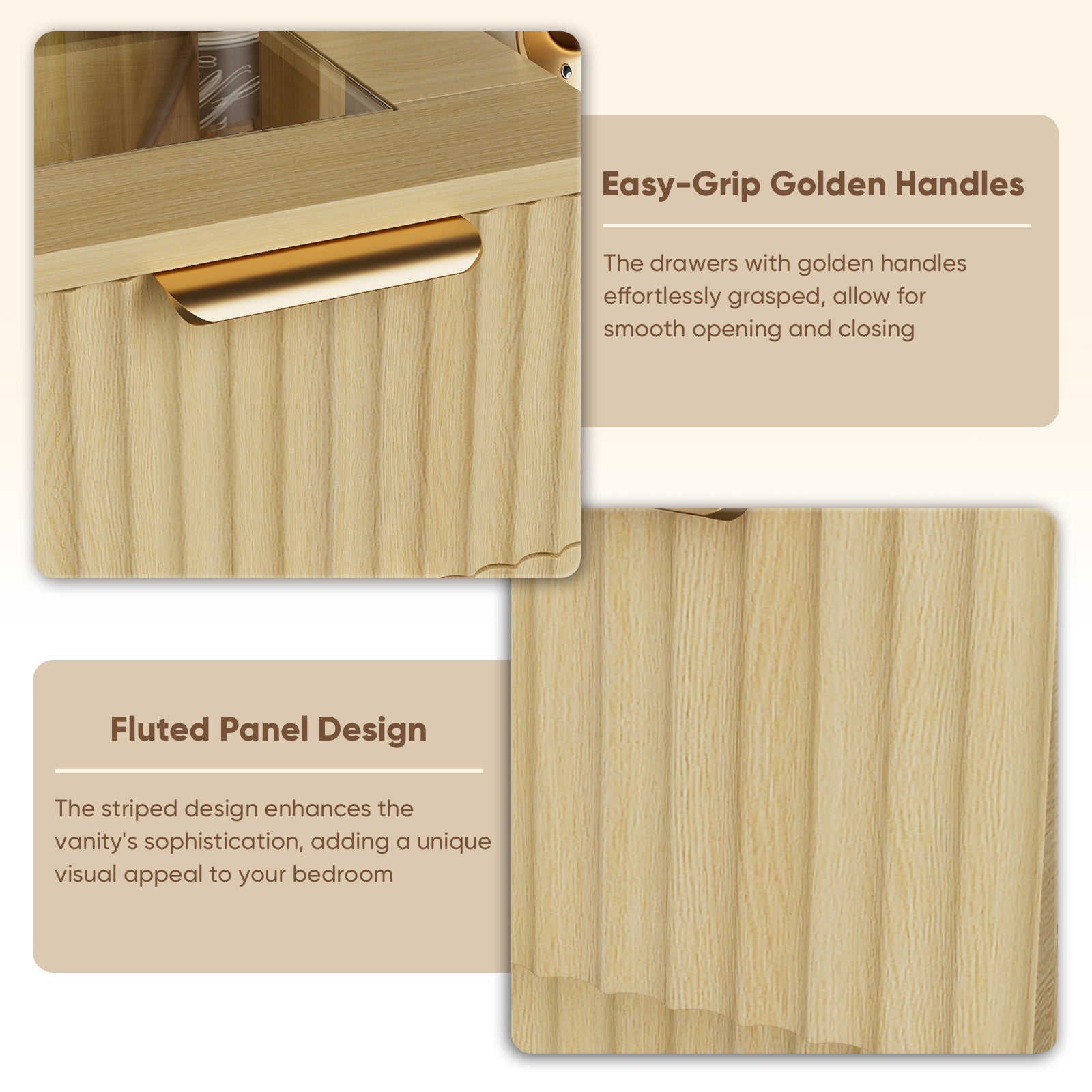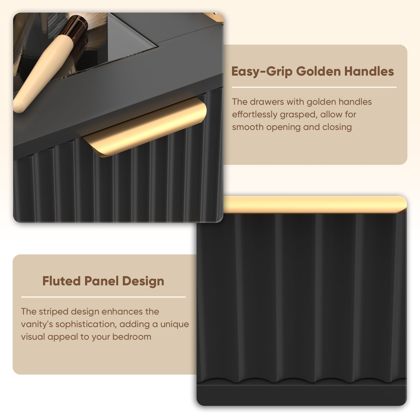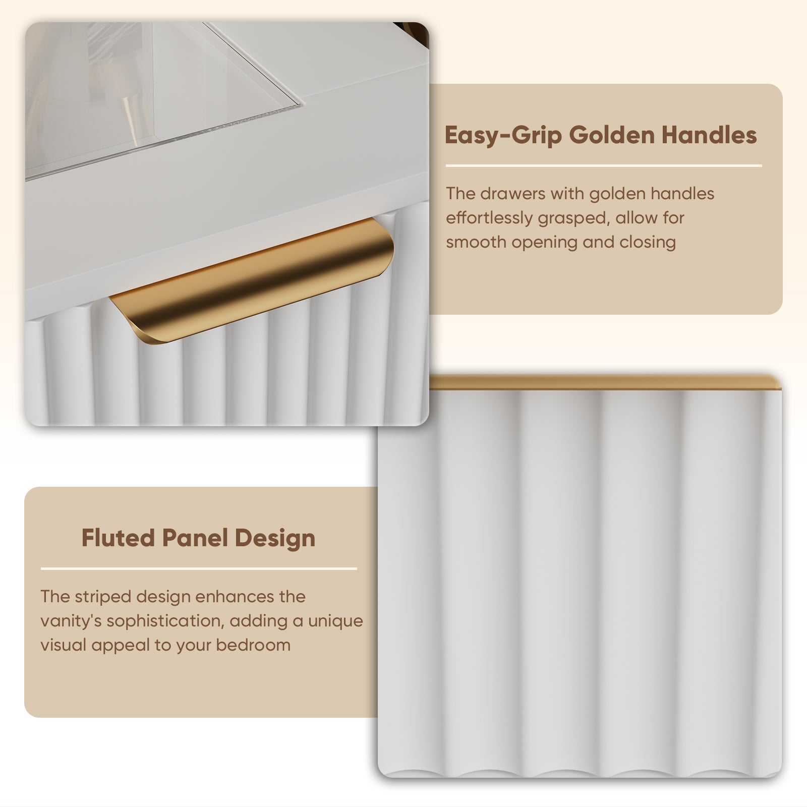 Fluted drawer panels paired with sleek gold handles bring a modern, glamorous touch. This stylish vanity makes a thoughtful gift for women of all ages.