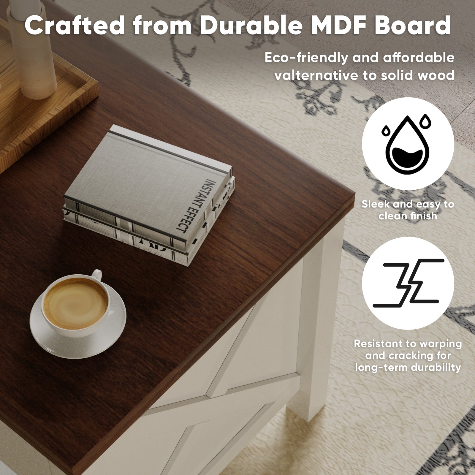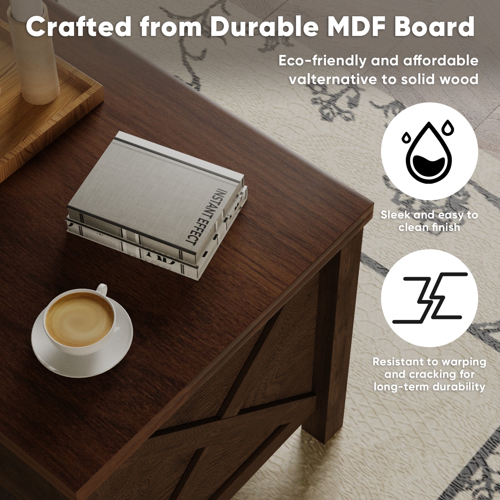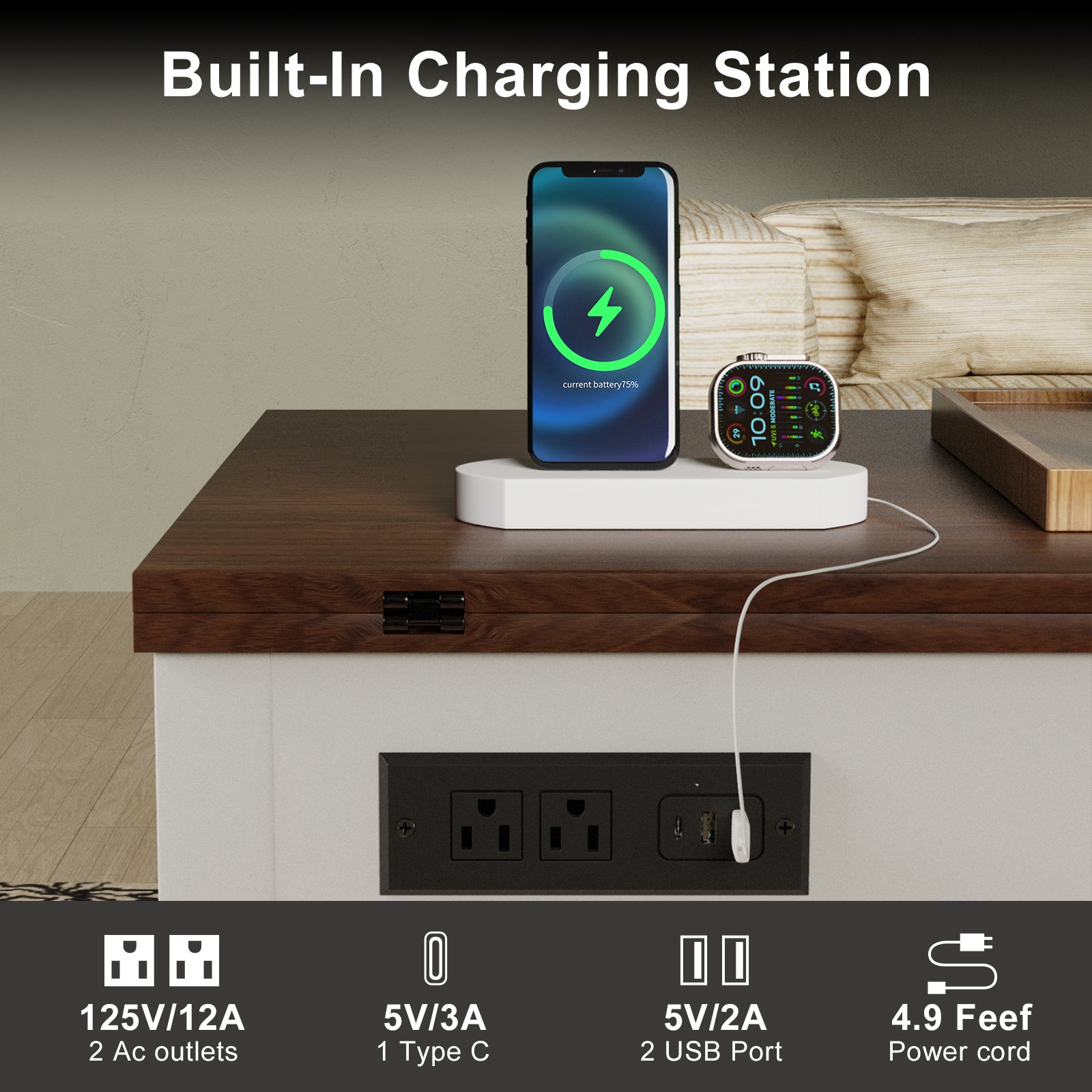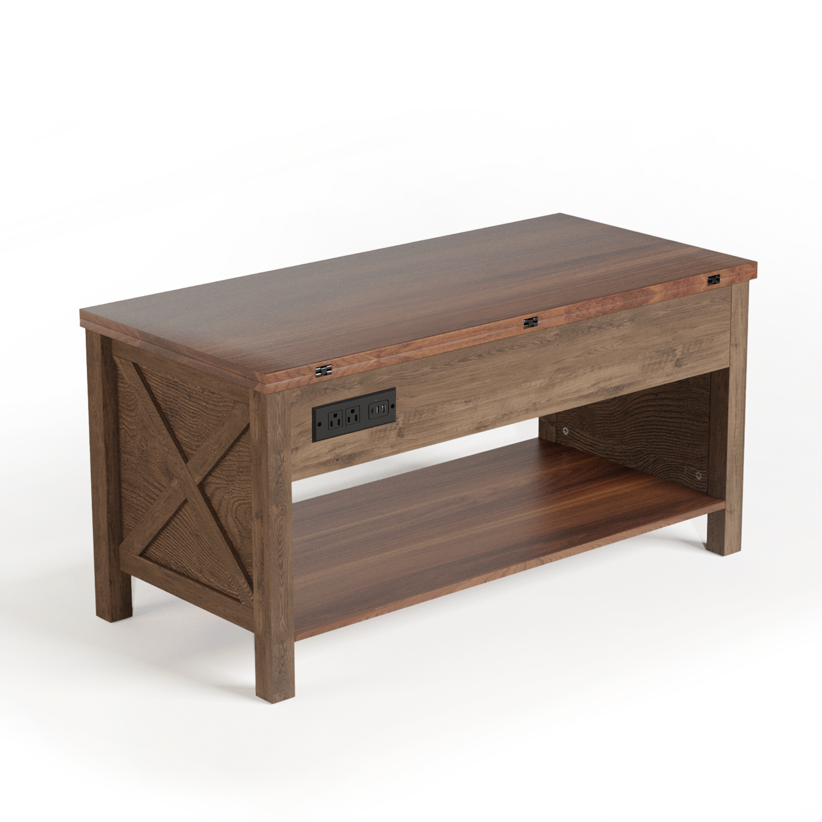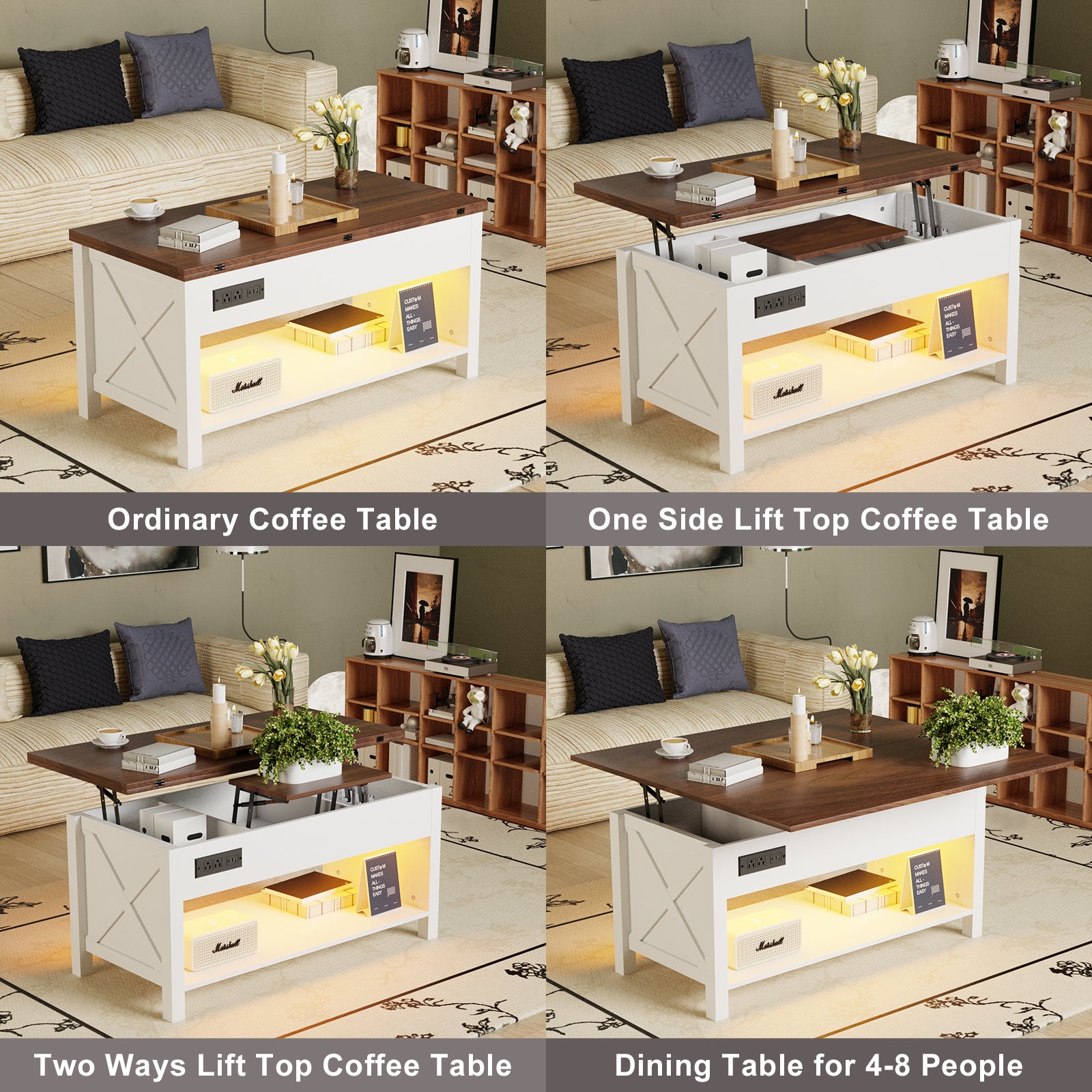 Upgrade your living room with this versatile 4-in-1 Lift Top Coffee Table, designed to maximize functionality without sacrificing style. Featuring a smooth hydraulic lift mechanism, this farmhouse-style table easily transforms for dining, working, studying, or gaming. It includes three hidden storage compartments, an open shelf for daily essentials, built-in RGB LED lighting with app control, and a convenient charging station with multiple outlets and USB ports. Crafted from durable P2 engineered wood with a premium hydraulic system, this multifunctional coffee table offers long-lasting stability and an elevated user experience—perfect for modern homes, small spaces, and multifunctional living areas.