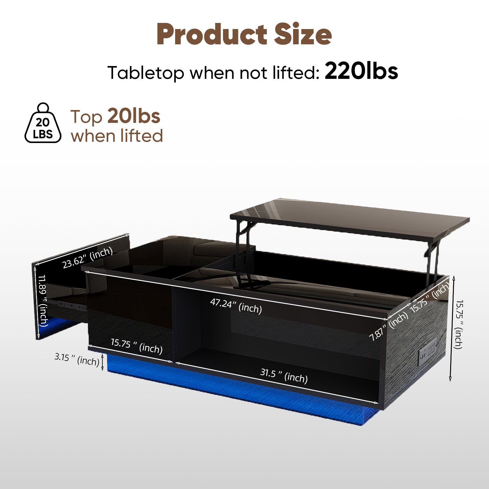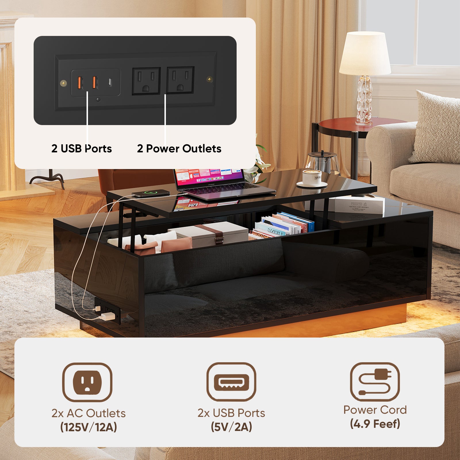 Upgrade your living space with this modern LED lift top coffee table, designed to combine style, functionality, and convenience. Featuring a sleek high-gloss black finish and integrated LED ambient lighting, this table adds a sophisticated, contemporary touch to any living room. The adjustable lift-top surface, built-in power outlet, and ample hidden storage make it a practical centerpiece for everyday living, working, and entertaining.