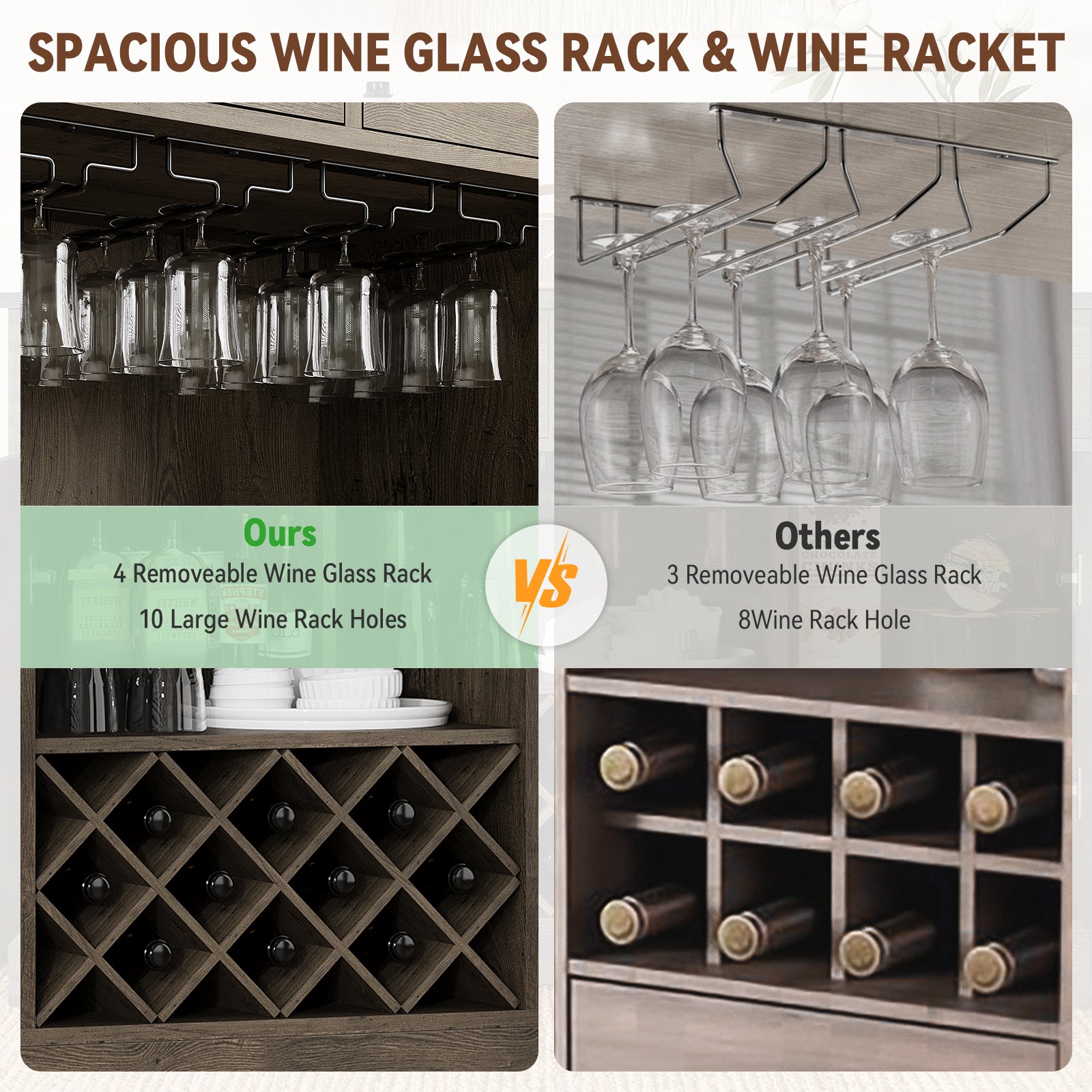 Bring warmth and functionality to your space with this farmhouse wine bar cabinet. Designed to combine rustic charm with practical storage, it features drawers, wine racks, glass holders, and enclosed cabinets to keep everything neatly organized. Whether used as a coffee station, wine bar, or sideboard, this versatile cabinet offers ample surface space and durable construction, making it a stylish and reliable addition to your kitchen, dining room, or living area.